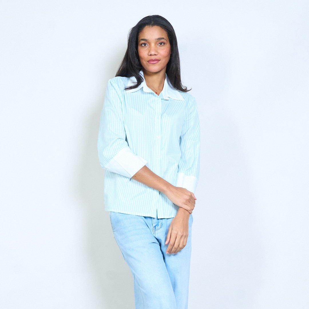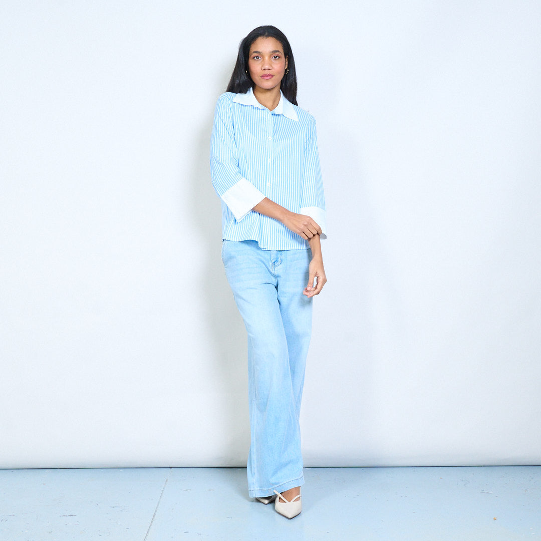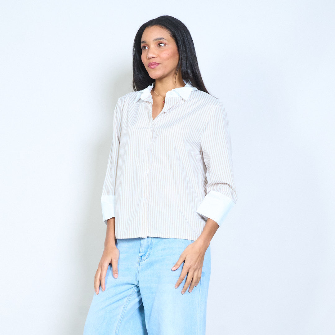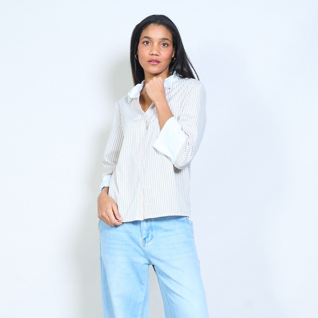 Раирана риза с копчета отпред с контрастна класическа яка и маншет с детайли на едро