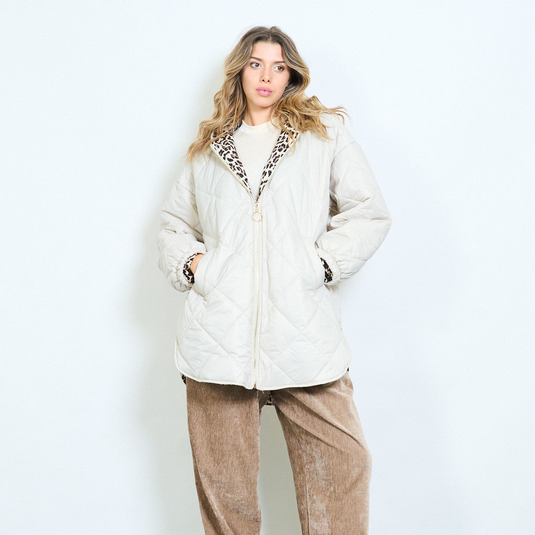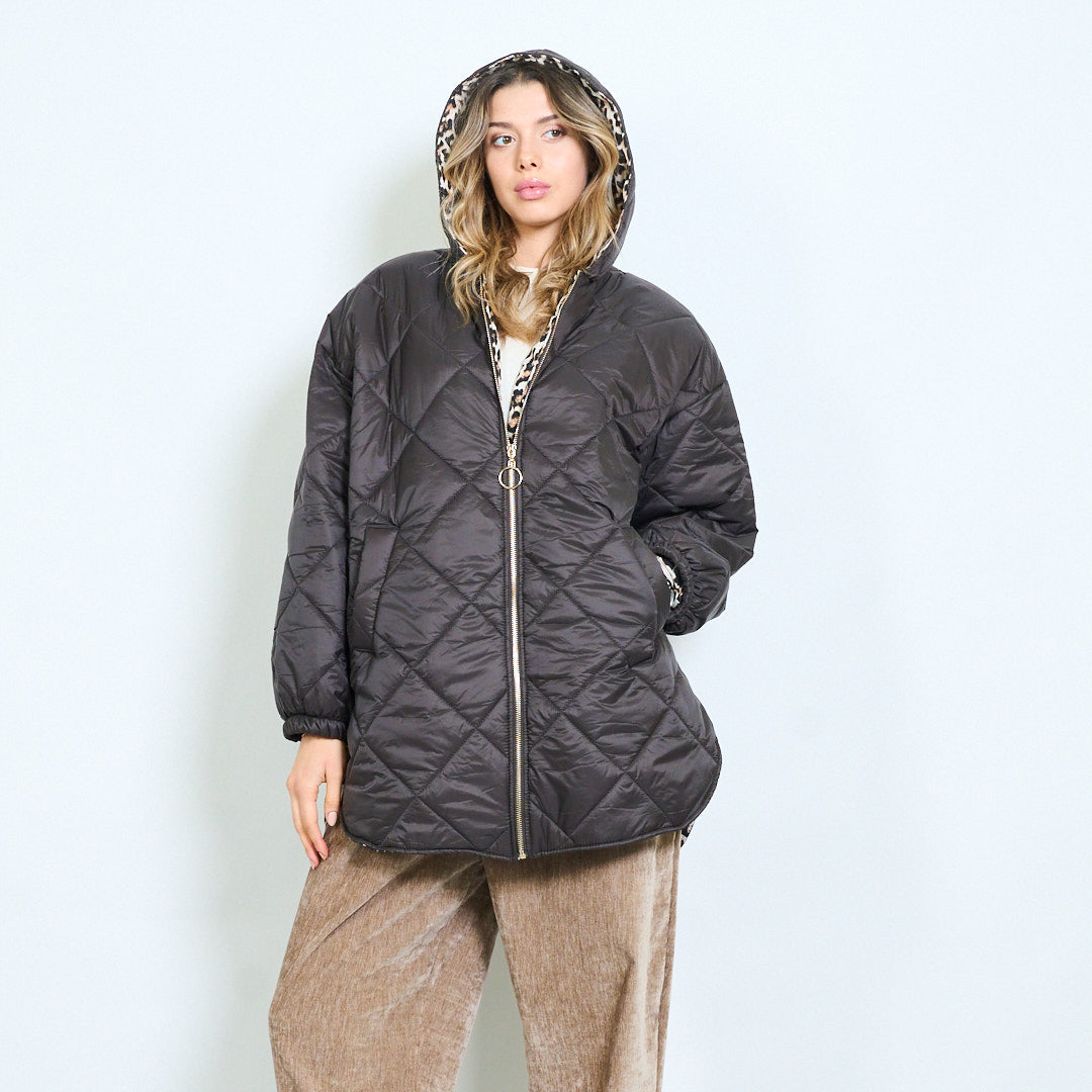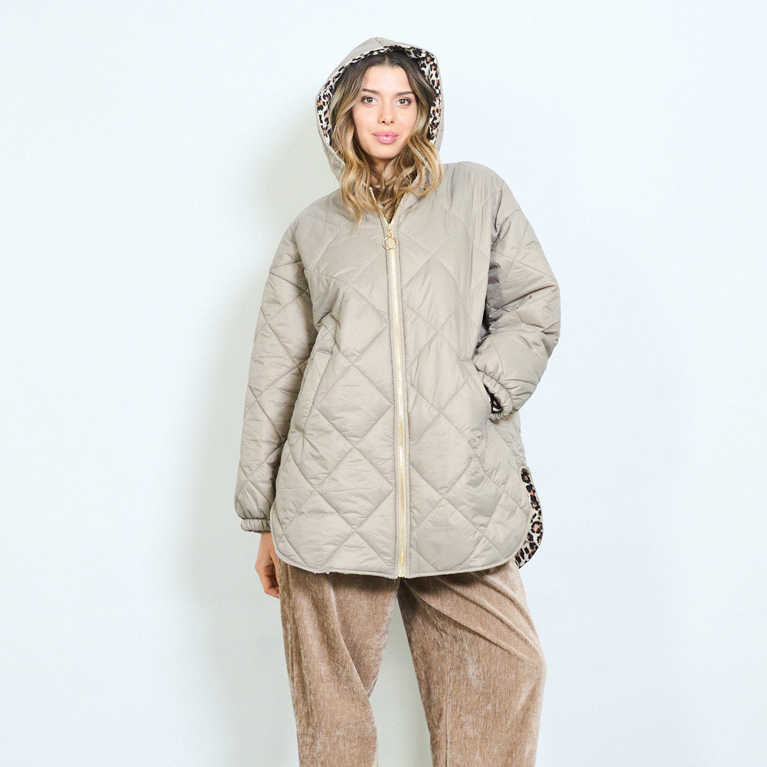 Ватирано яке с цип с качулка с леопардова печат на едро