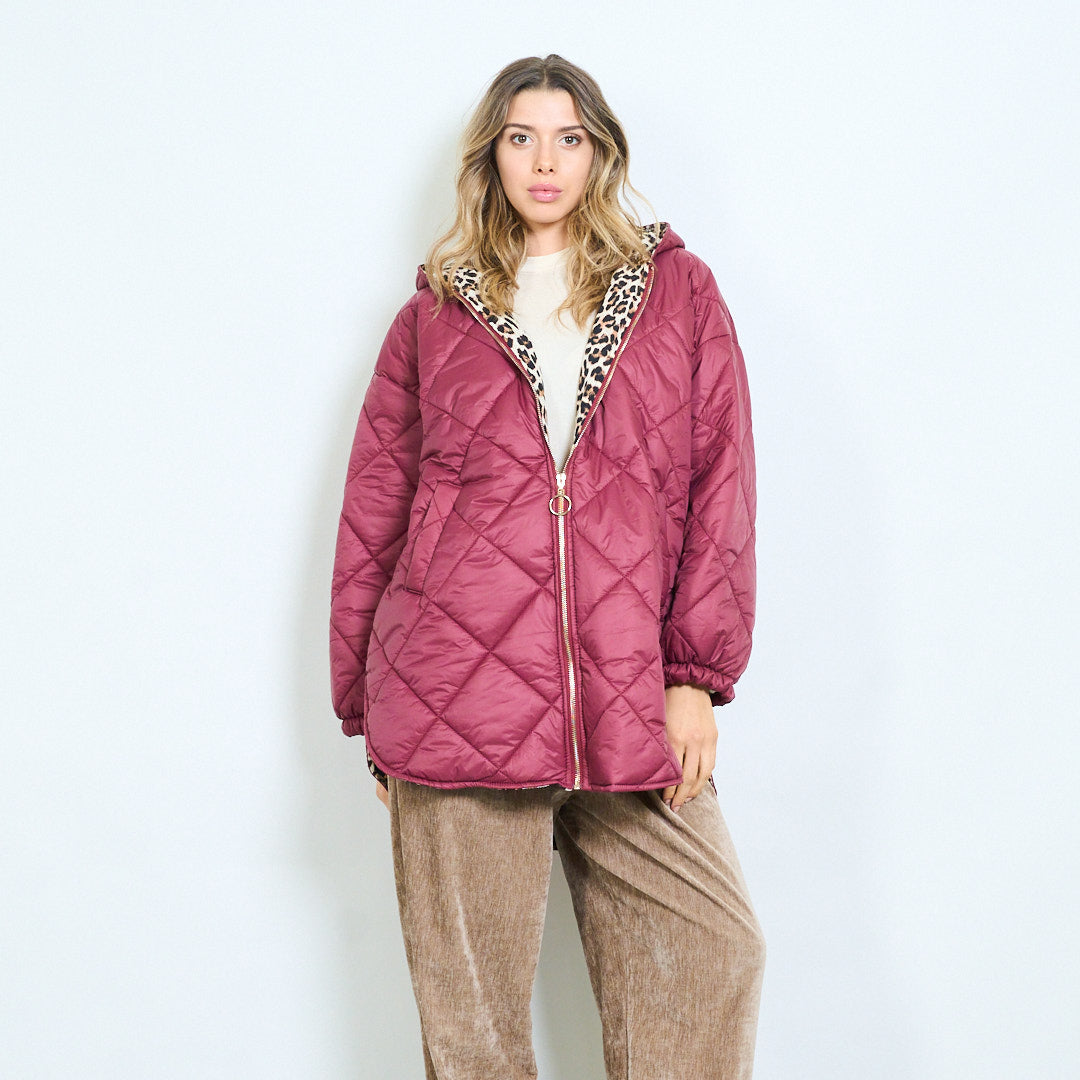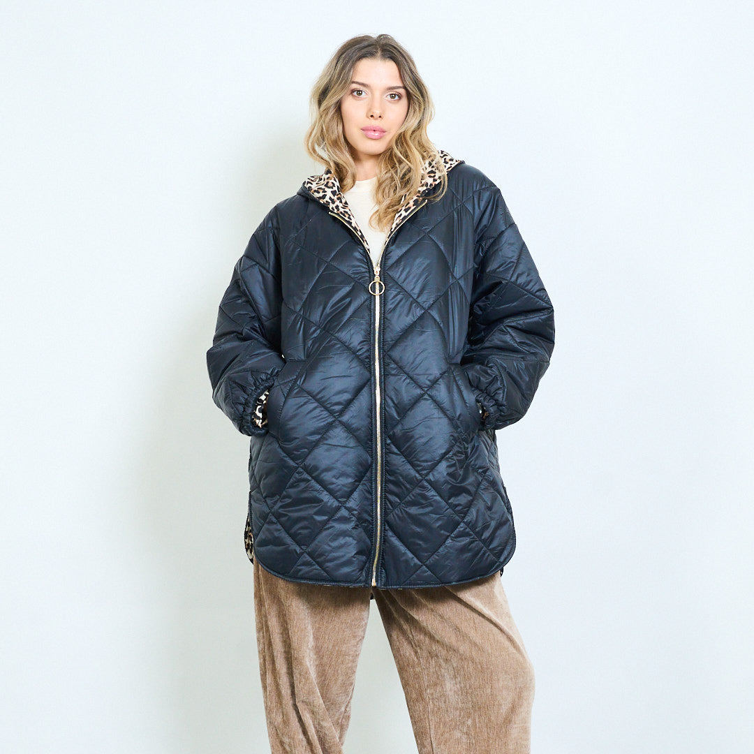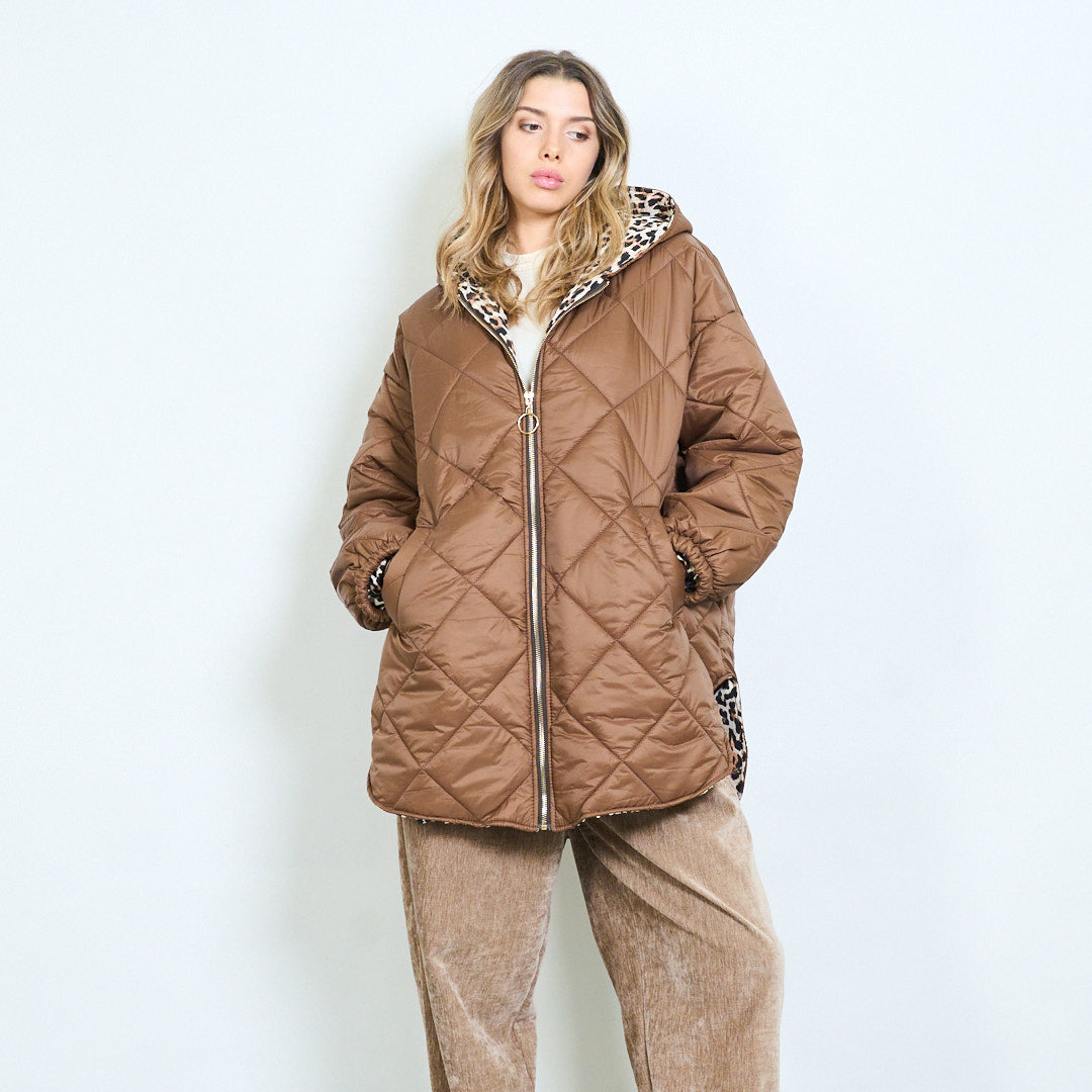 Ватирано яке с цип с качулка с леопардова печат на едро