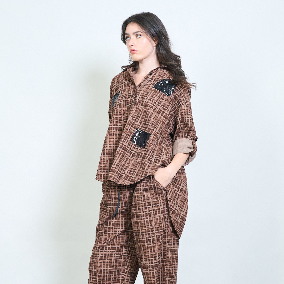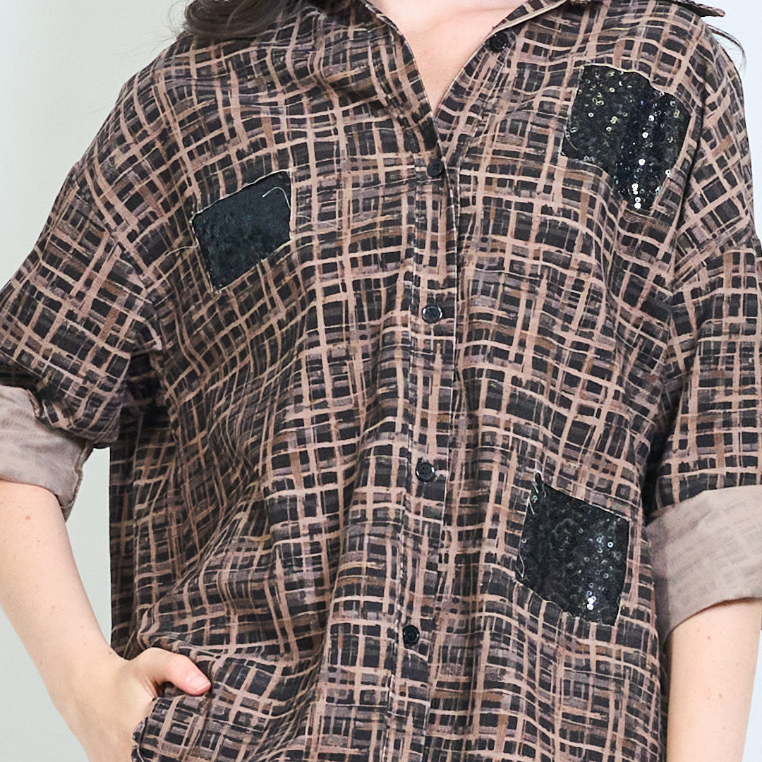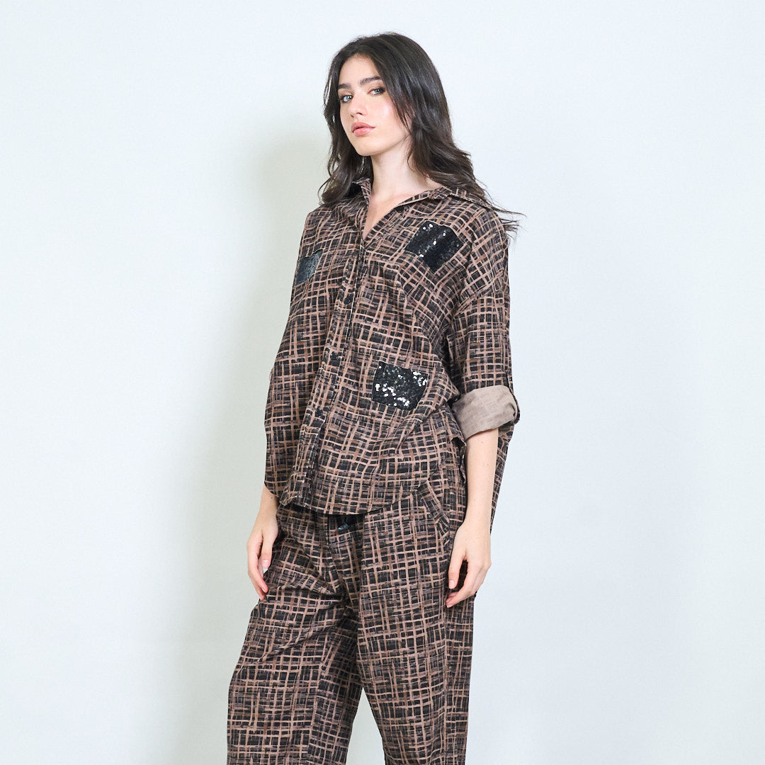 Геометрична кадифена риза с бутони с акценти на пайети на едро