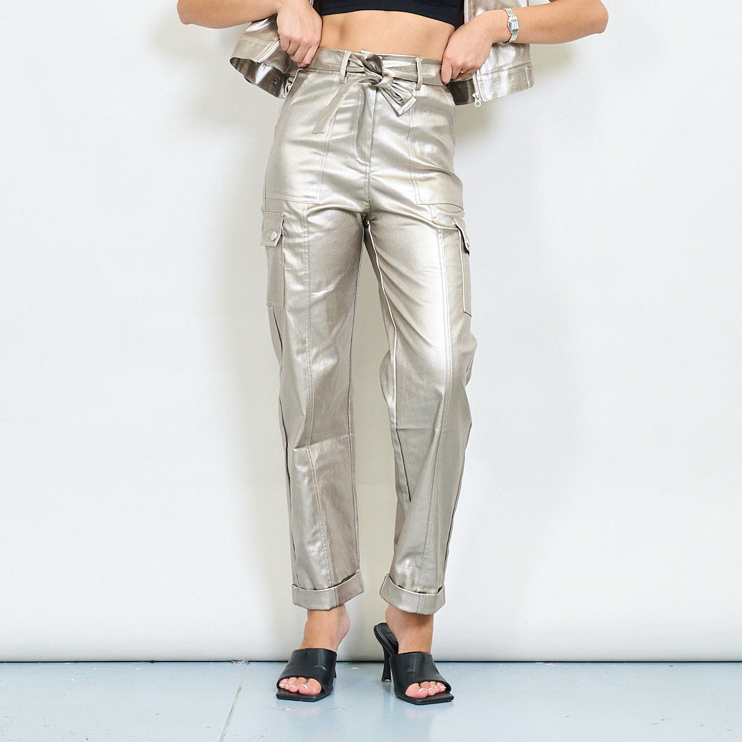 Метални изкуствени кожени панталони с джобни детайли на едро