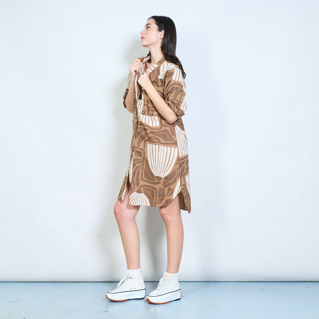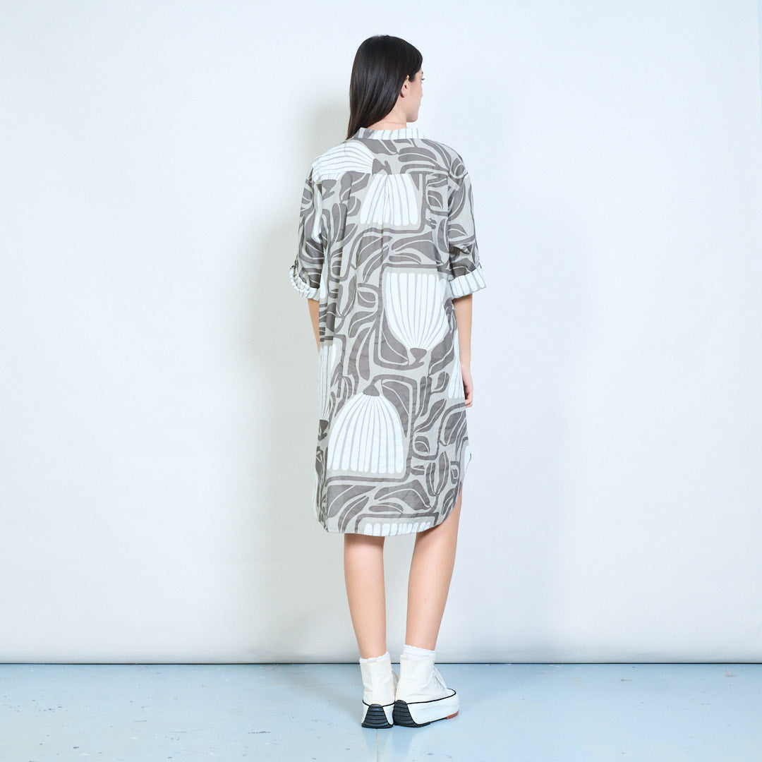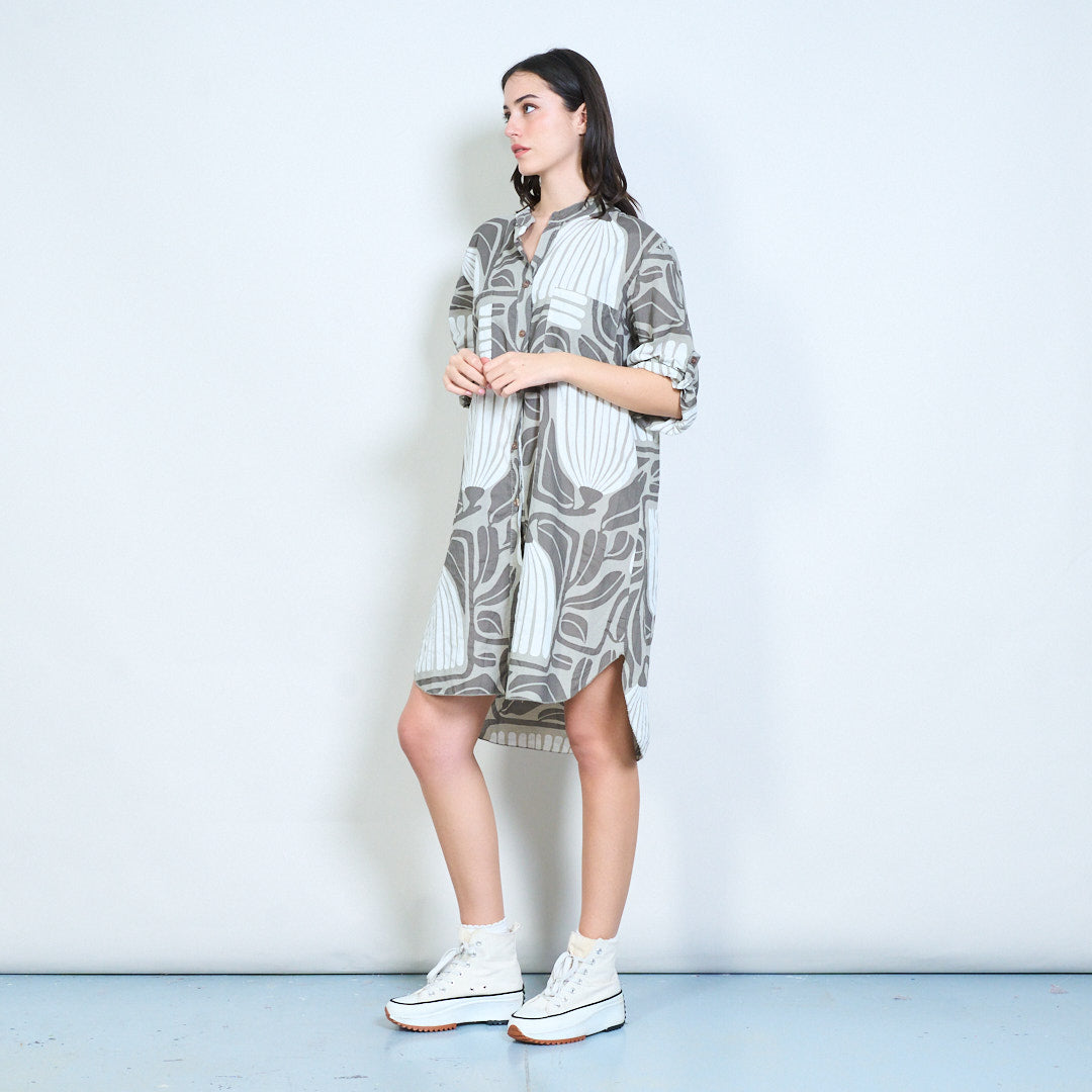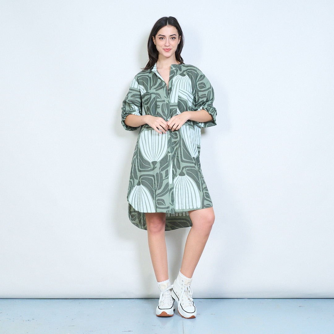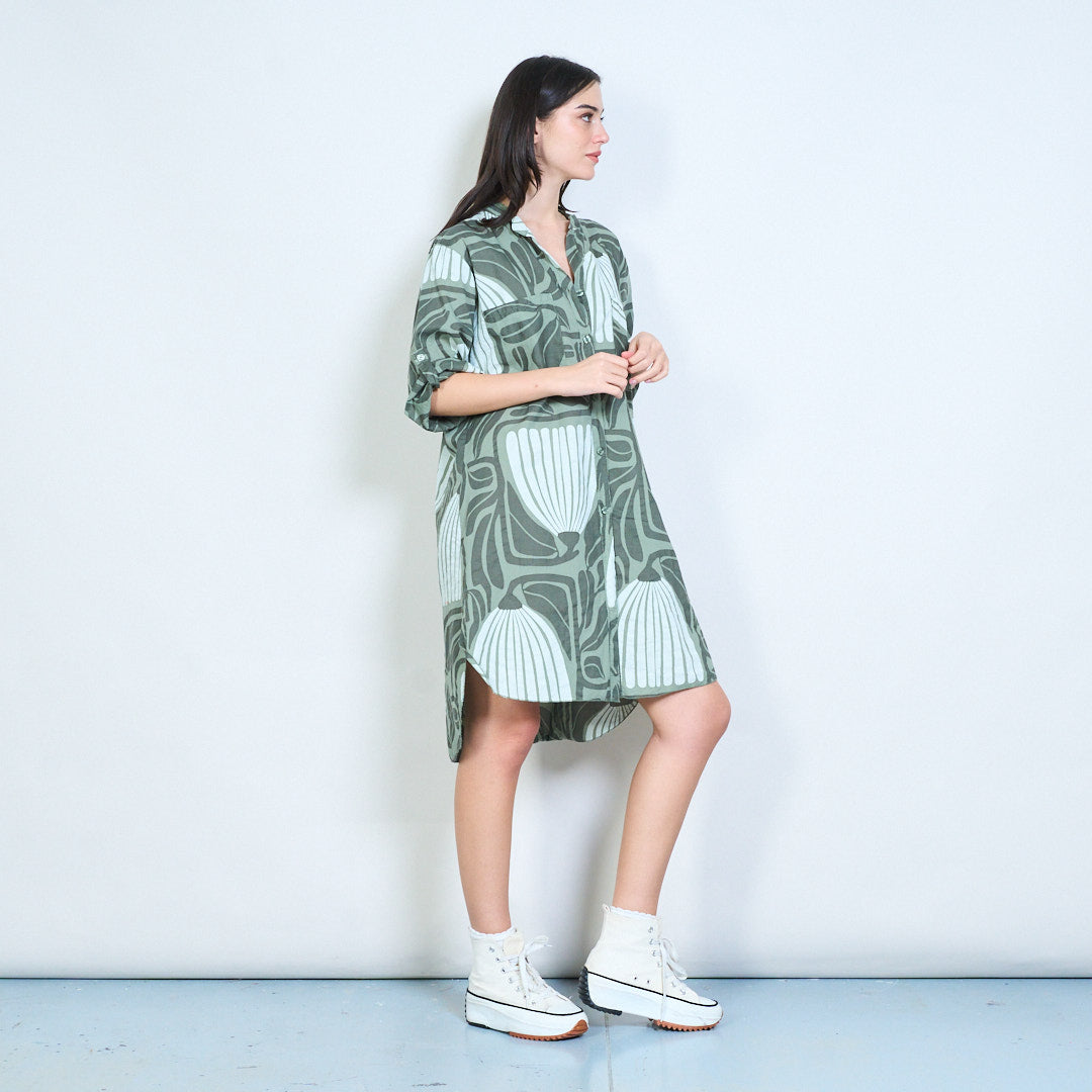 Рокля с риза с дълги копчета с абстрактни щампи на листа на едро