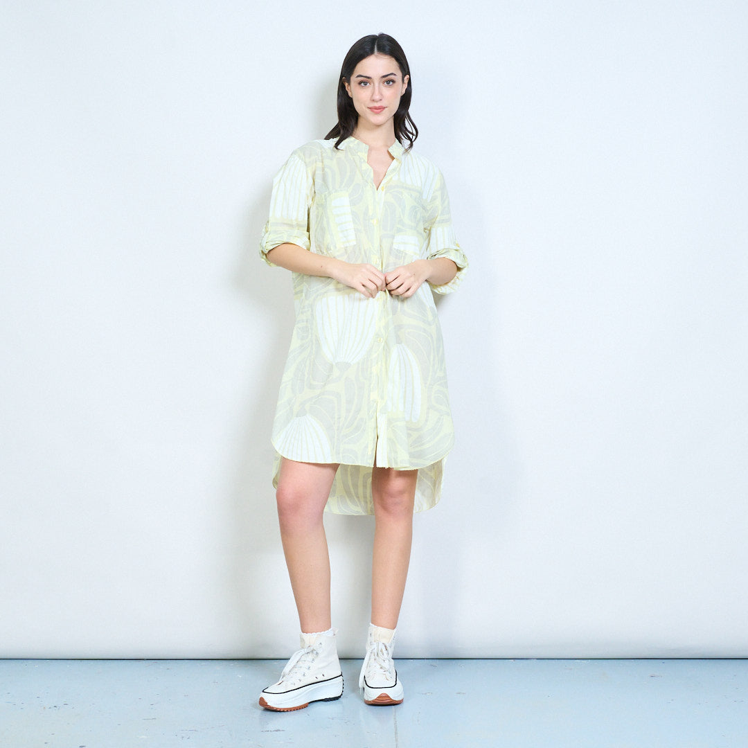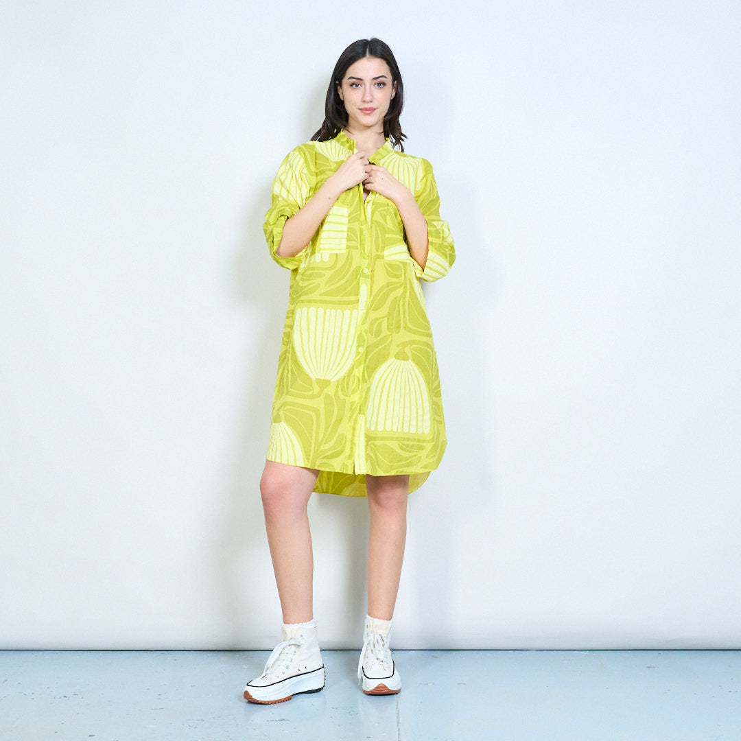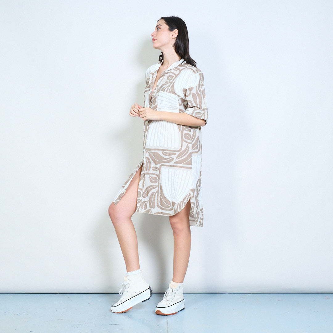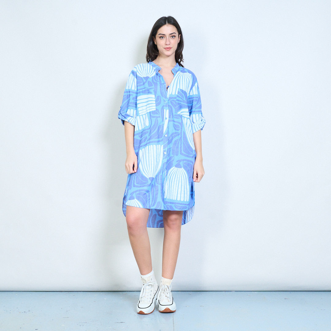 Рокля с риза с дълги копчета с абстрактни щампи на листа на едро