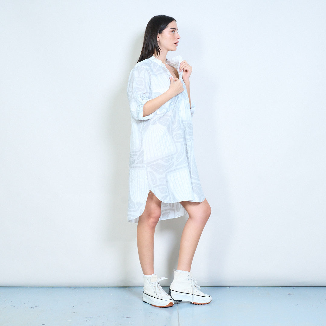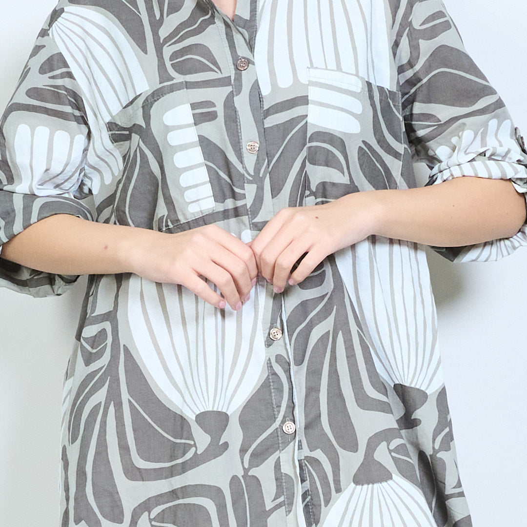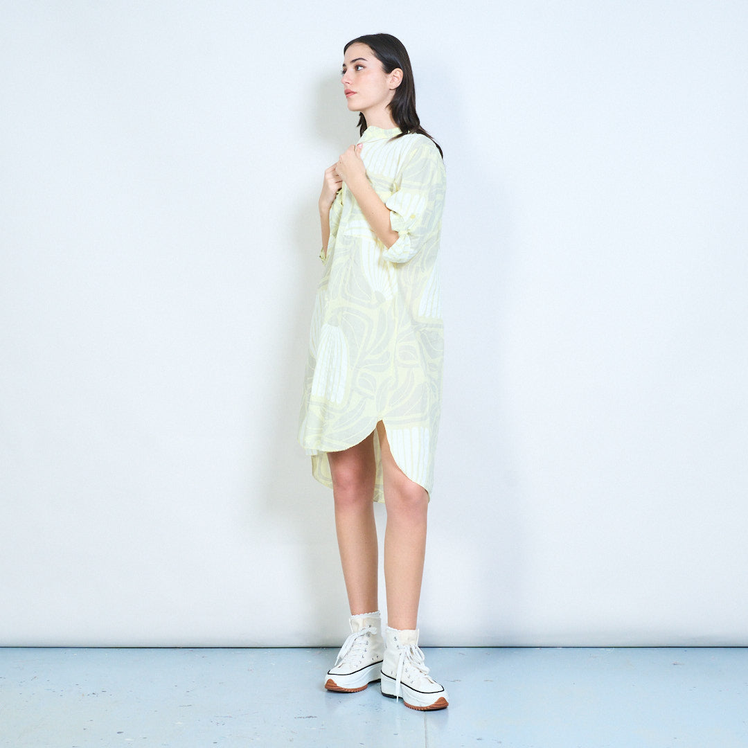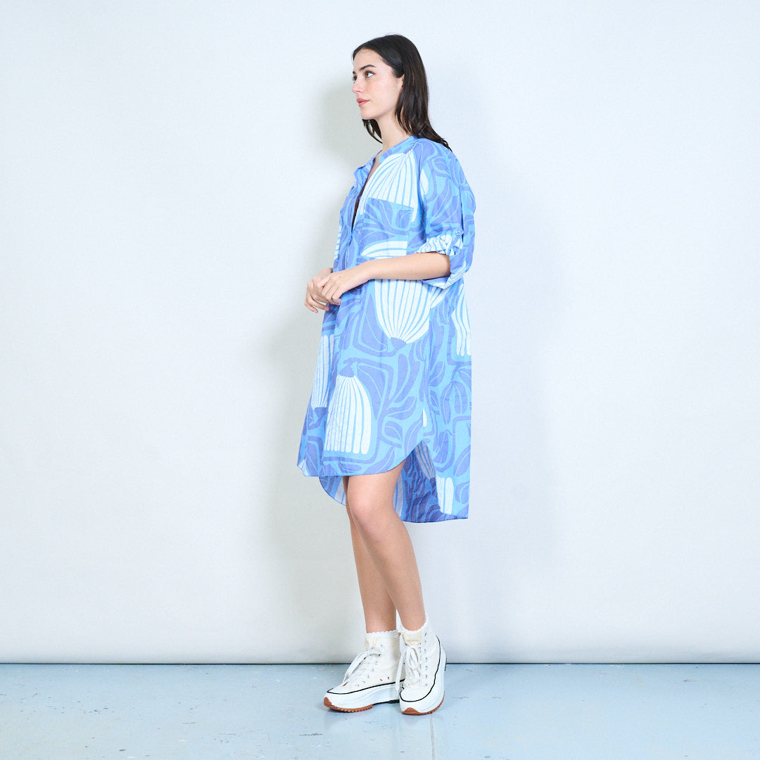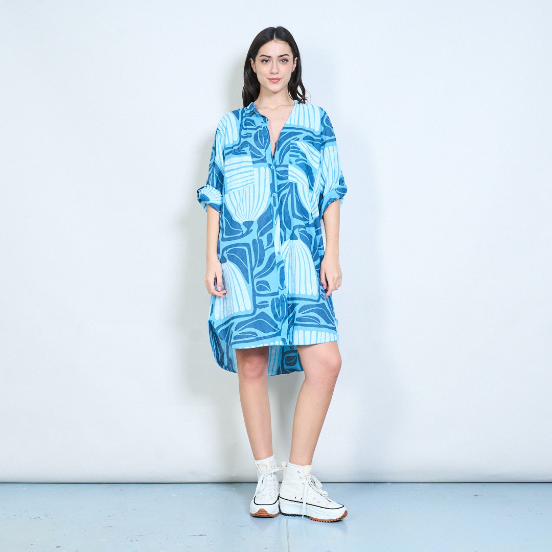 Рокля с риза с дълги копчета с абстрактни щампи на листа на едро