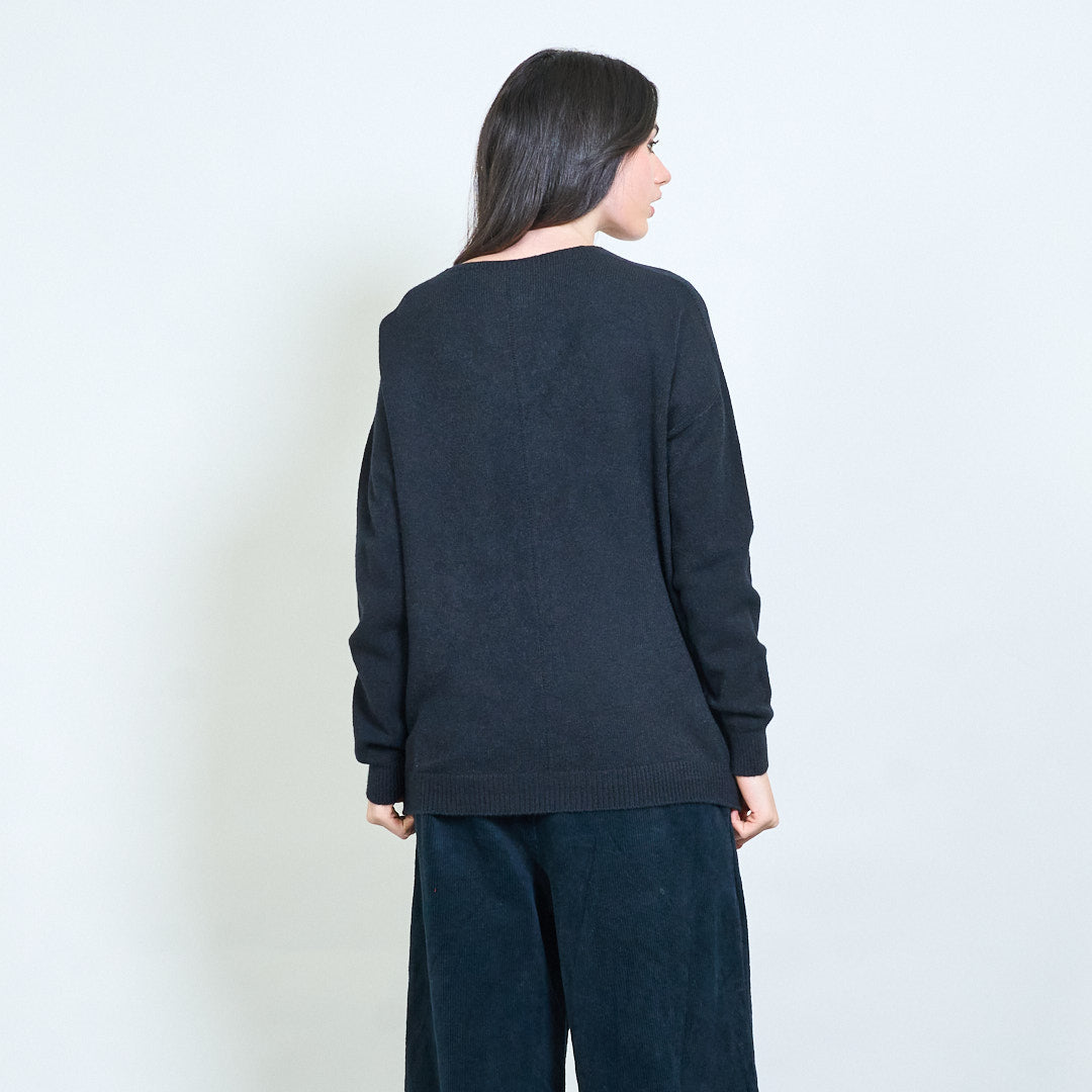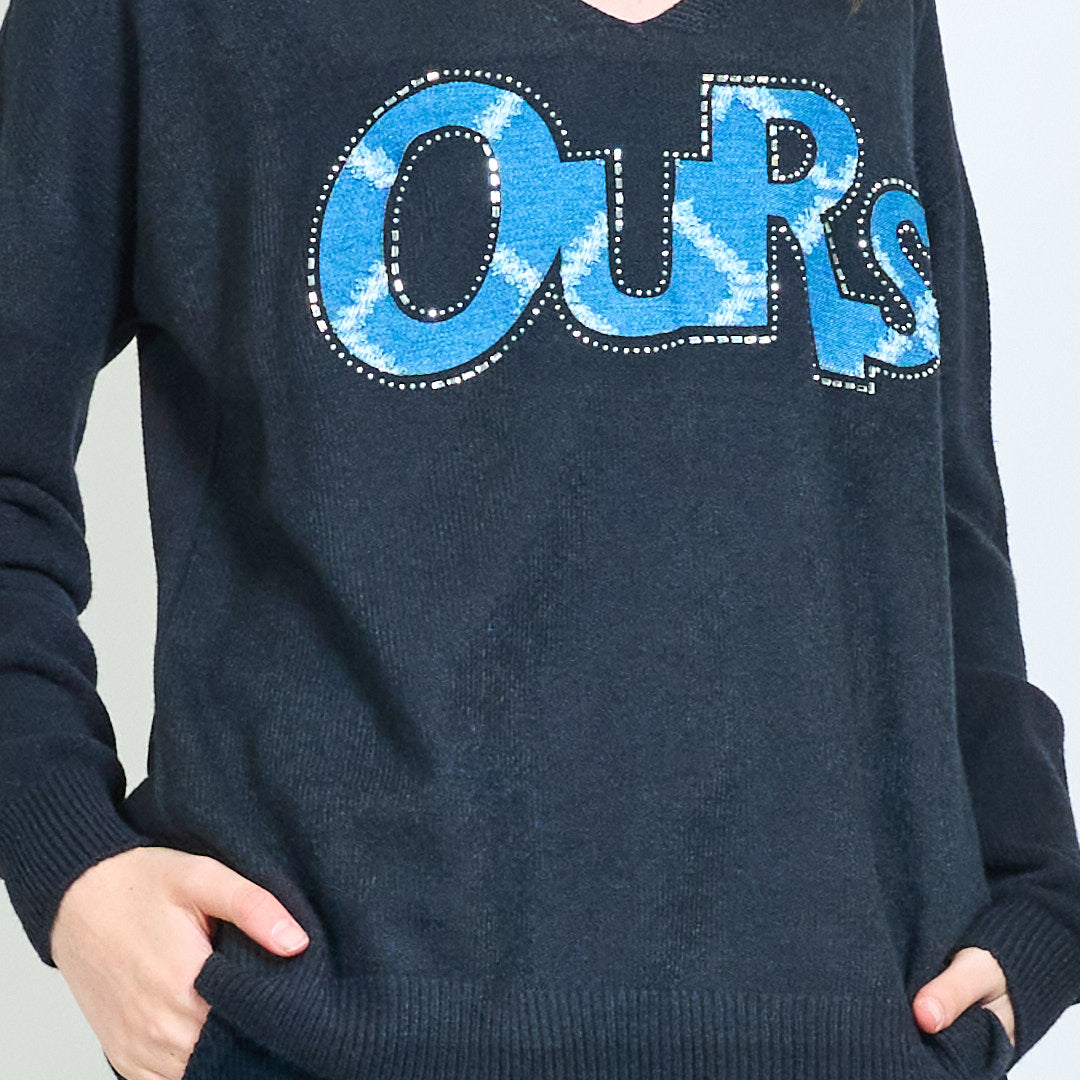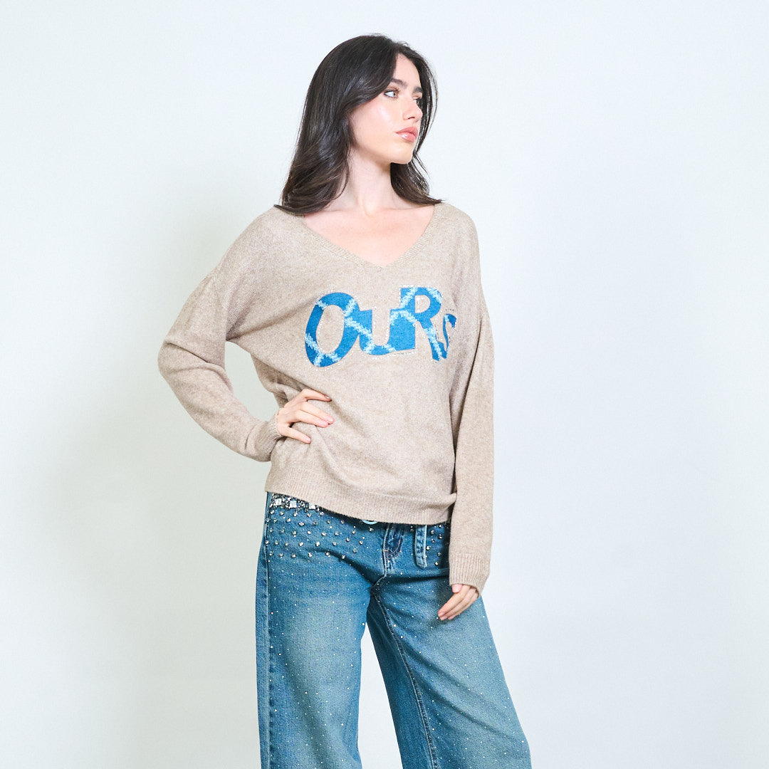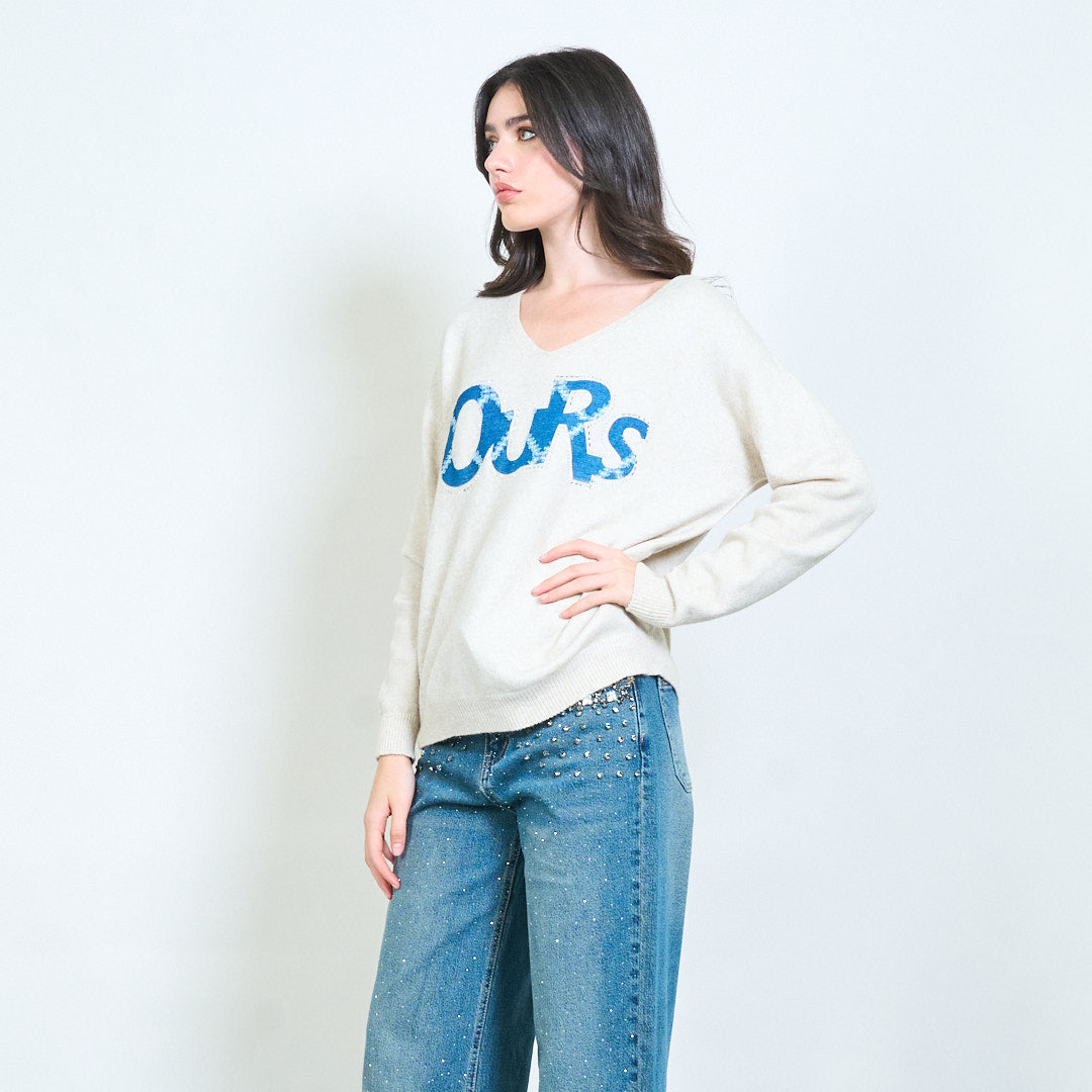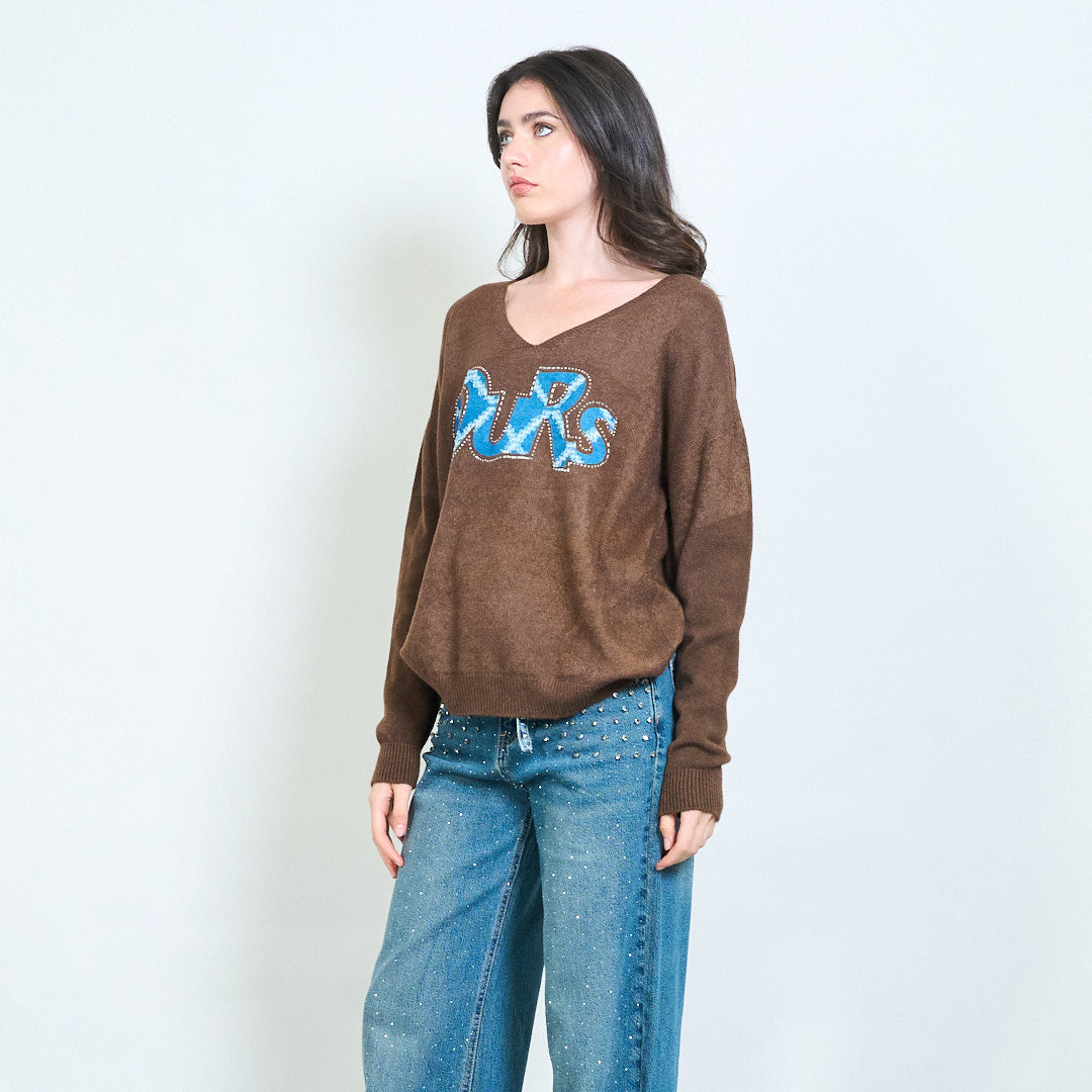 Графичен "наш" апликация с V-образно плетено пуловер на едро