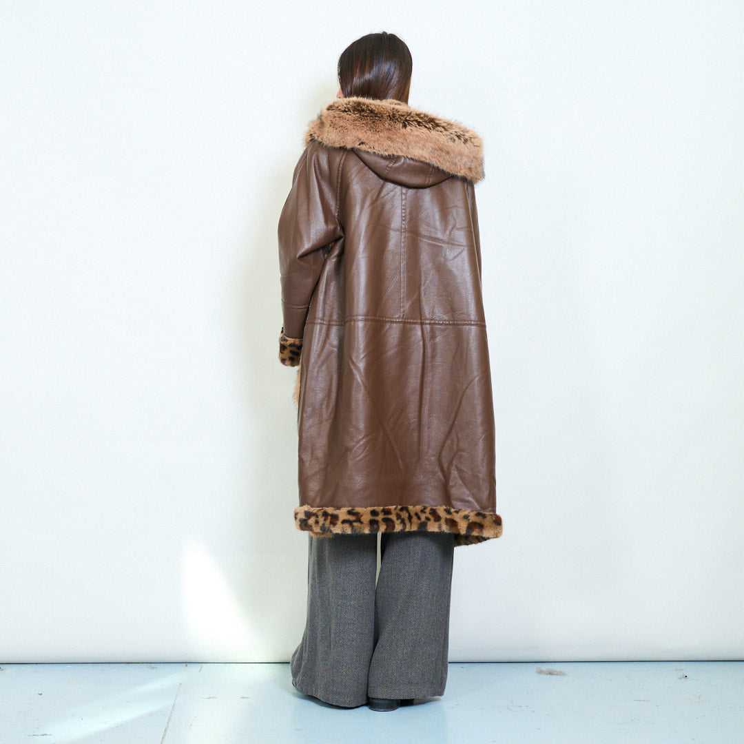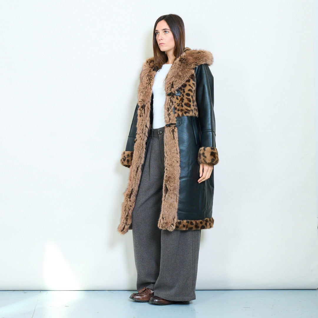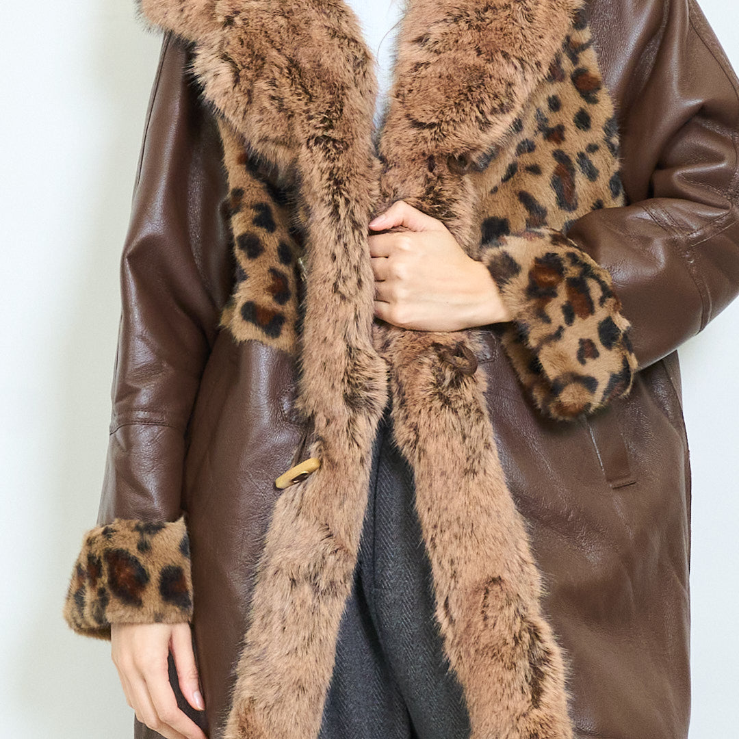 Дълга изкуствена козина палто с леопардови акценти на едро