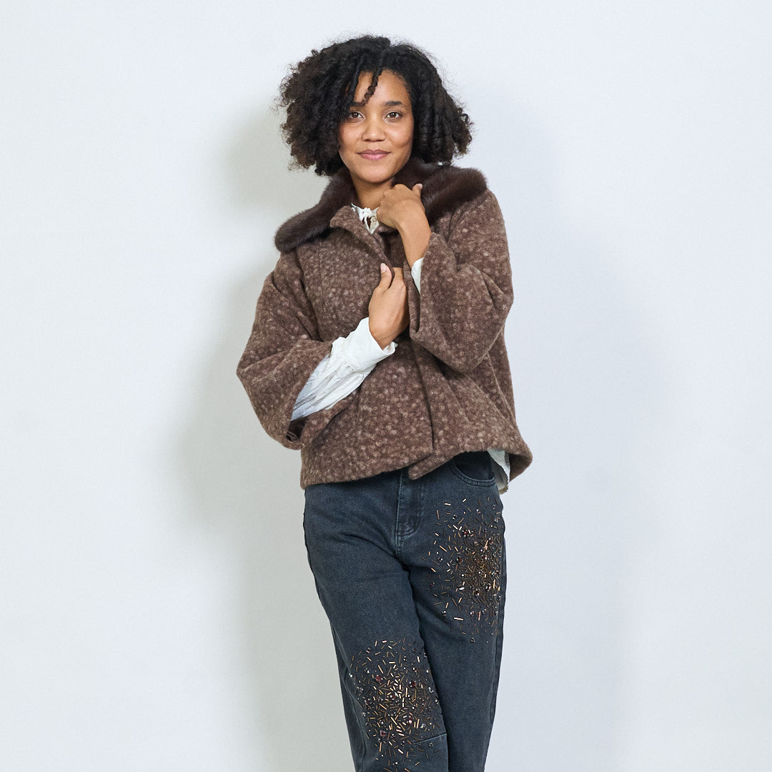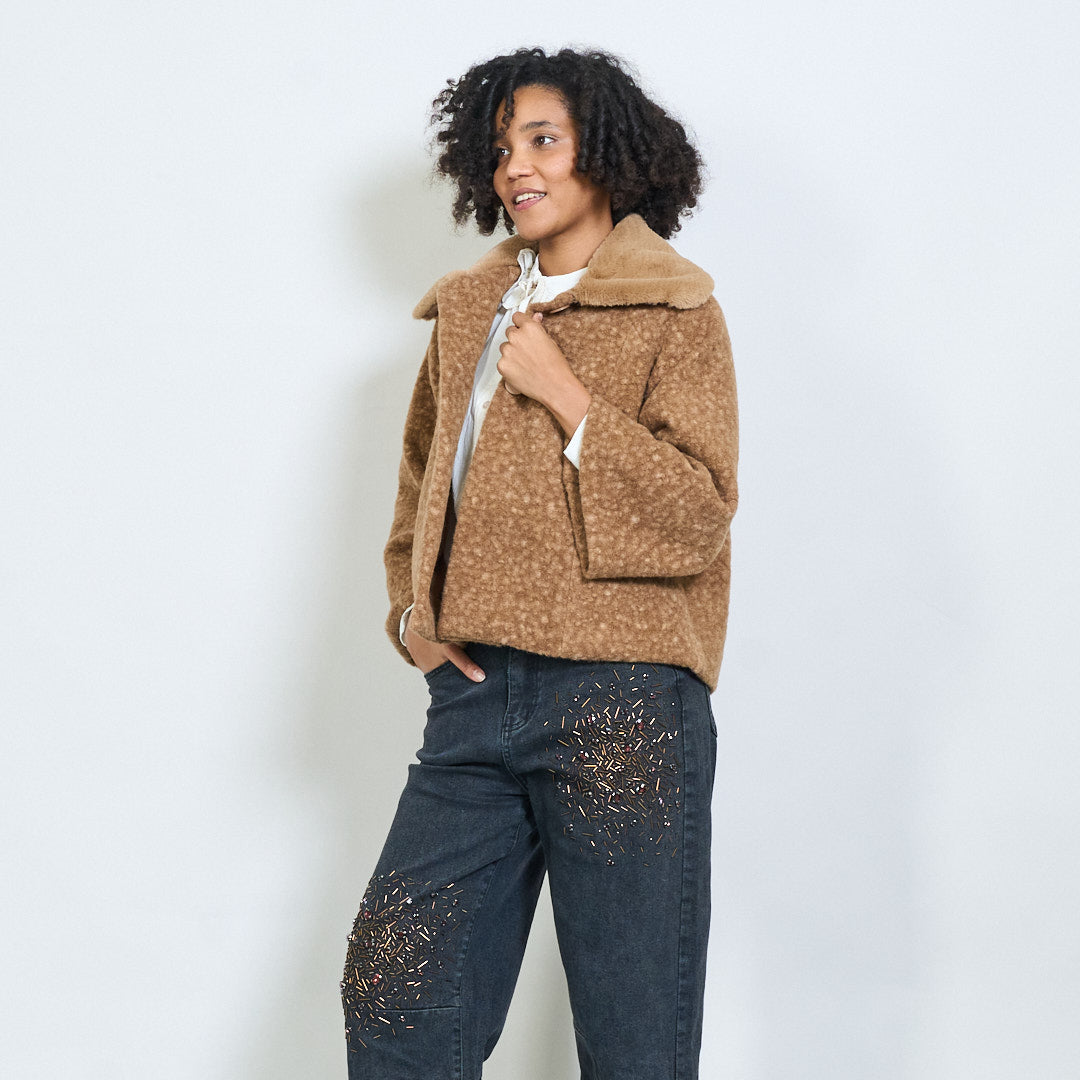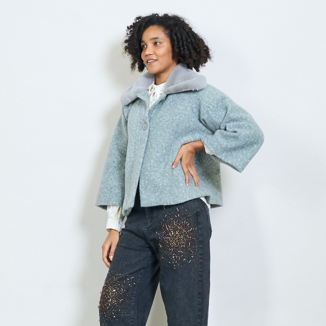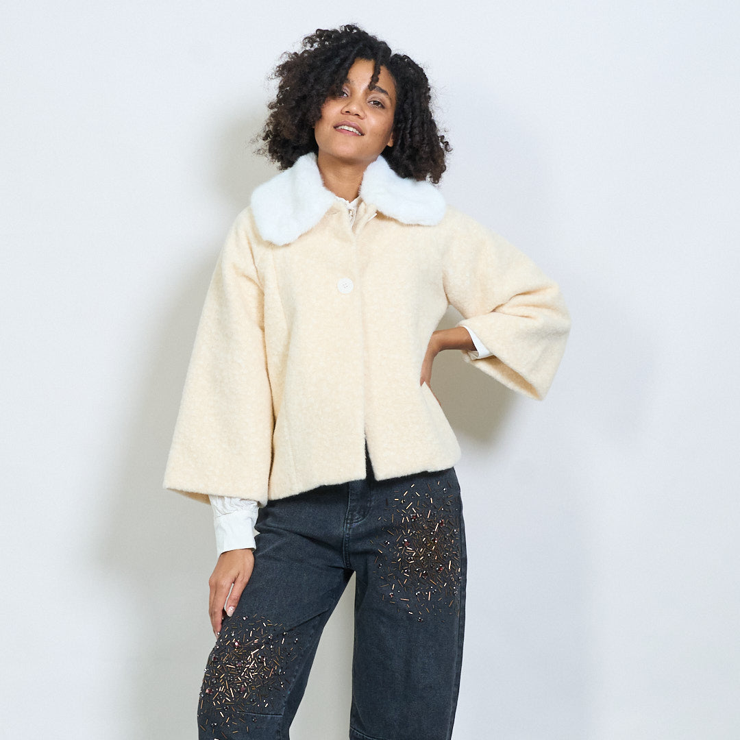 Изрязано текстурирано палто с изявление изкуствена яка на едро