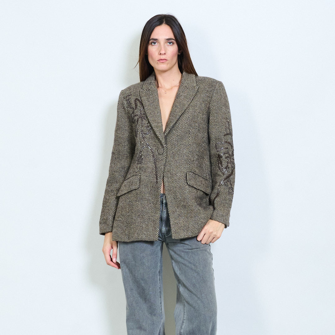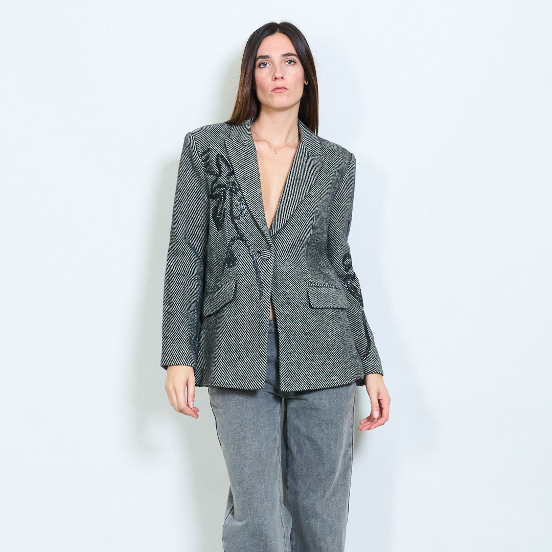 Шаблониран пригоден блейзър с флорално разкрасяване на мъниста на едро