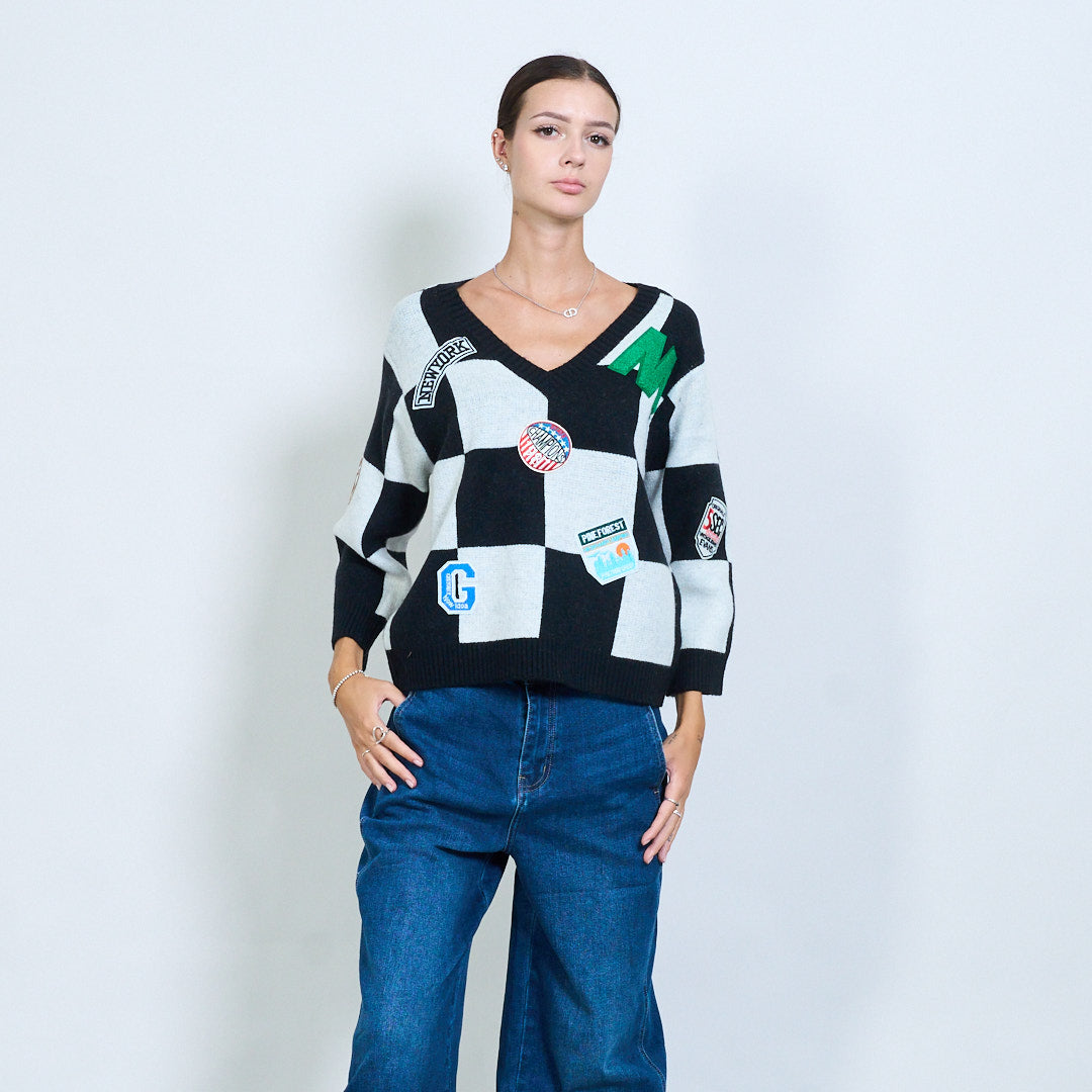 Checkered packwork varsity graphic v-образно плетено пуловер на едро