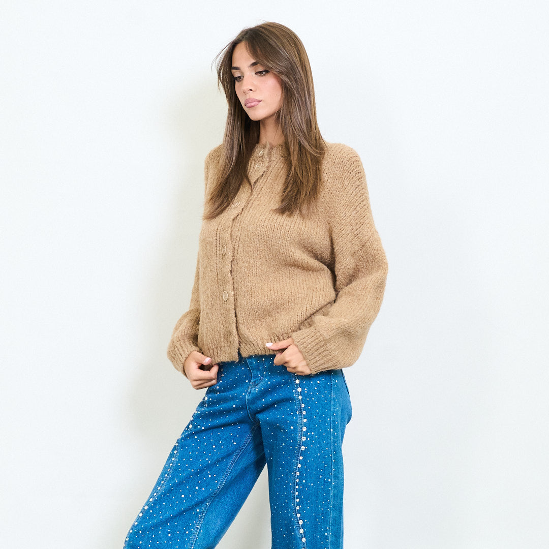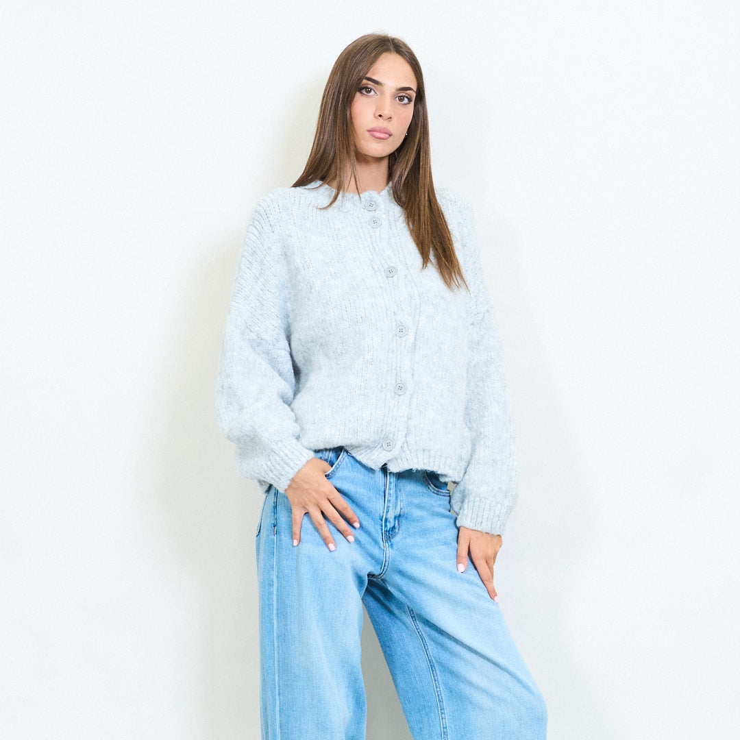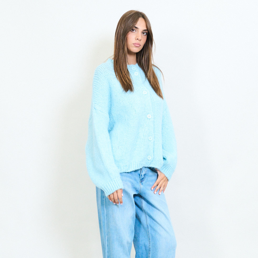 - Classic crew neck cardigan with front button closure