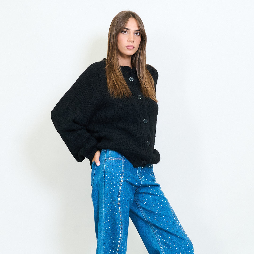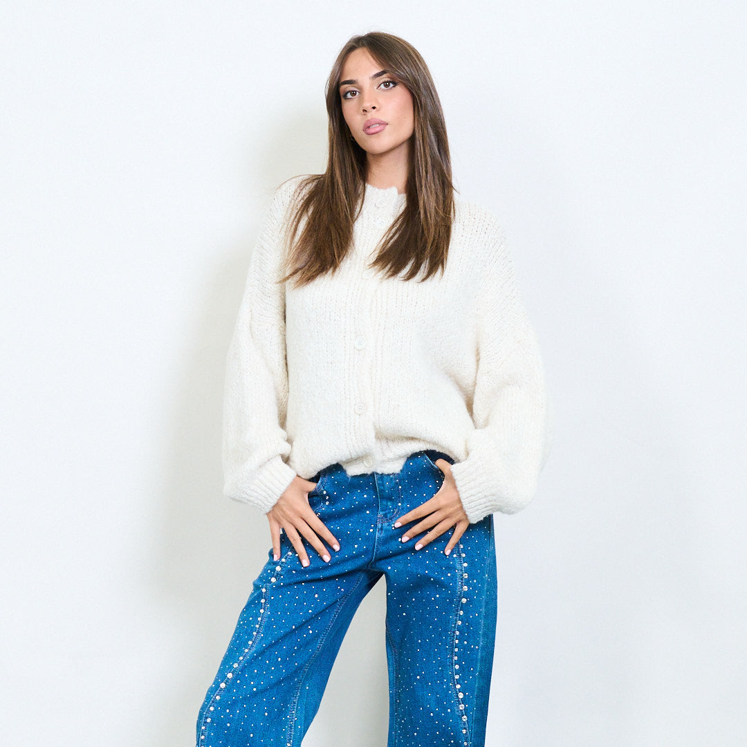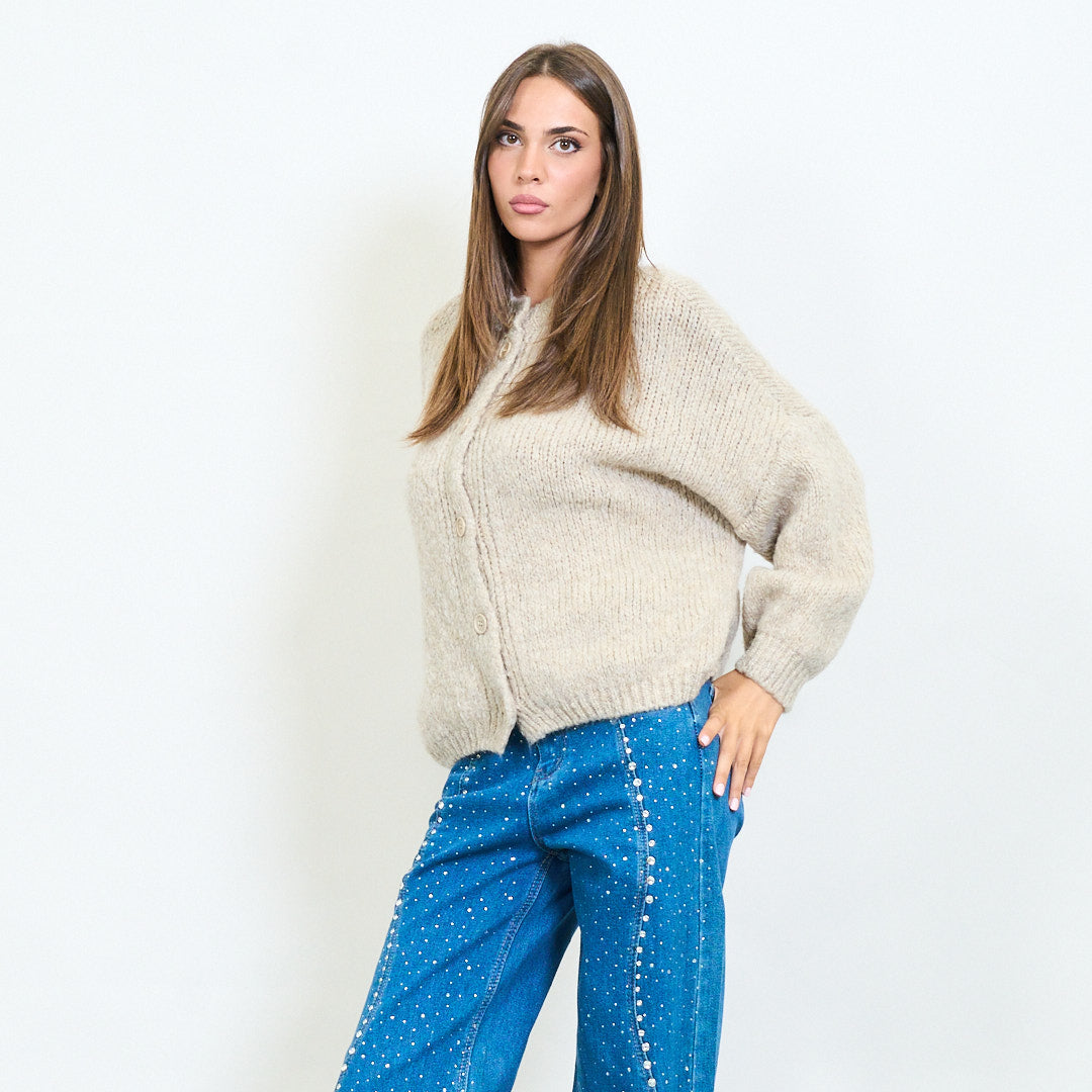 - Classic crew neck cardigan with front button closure