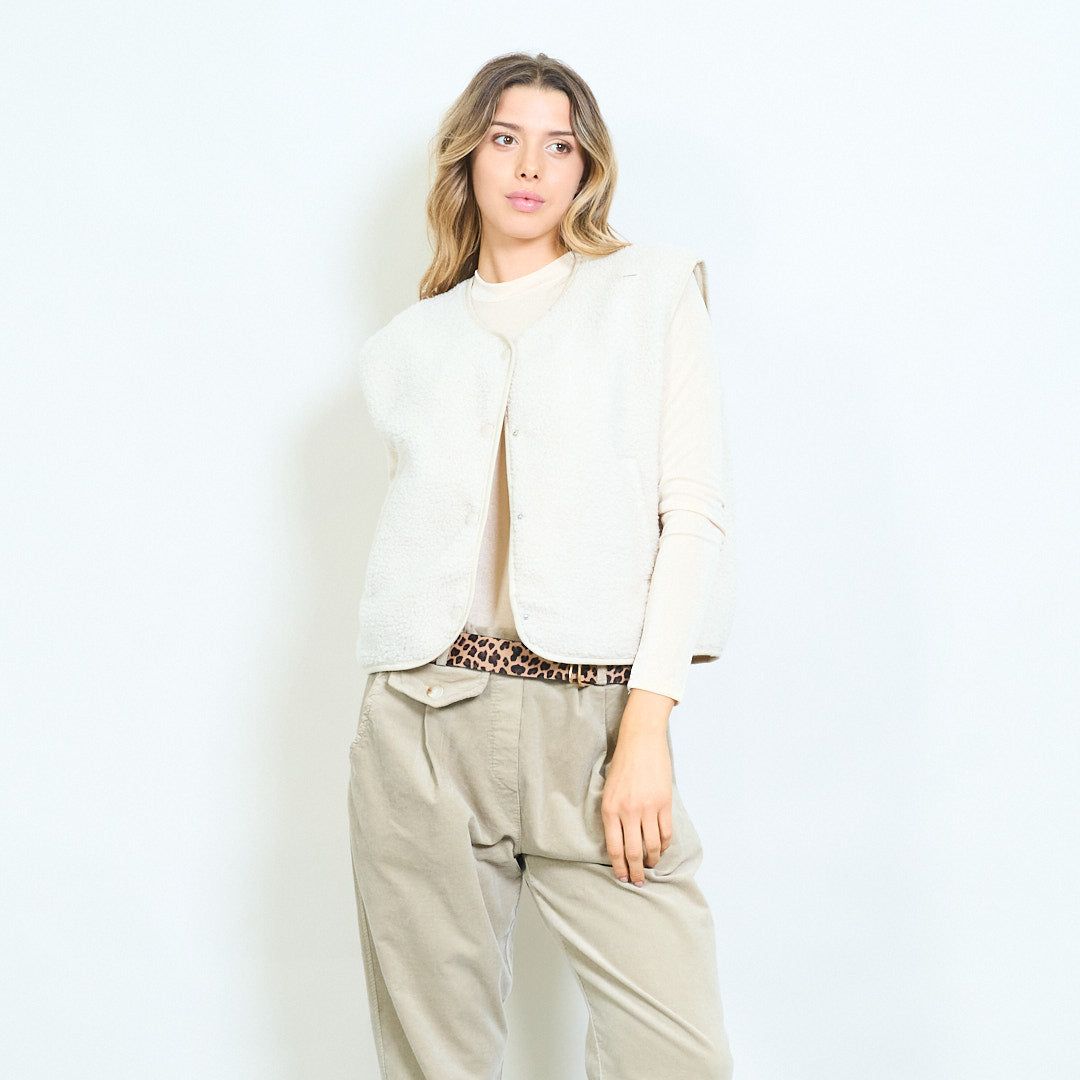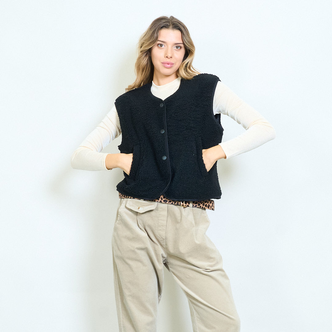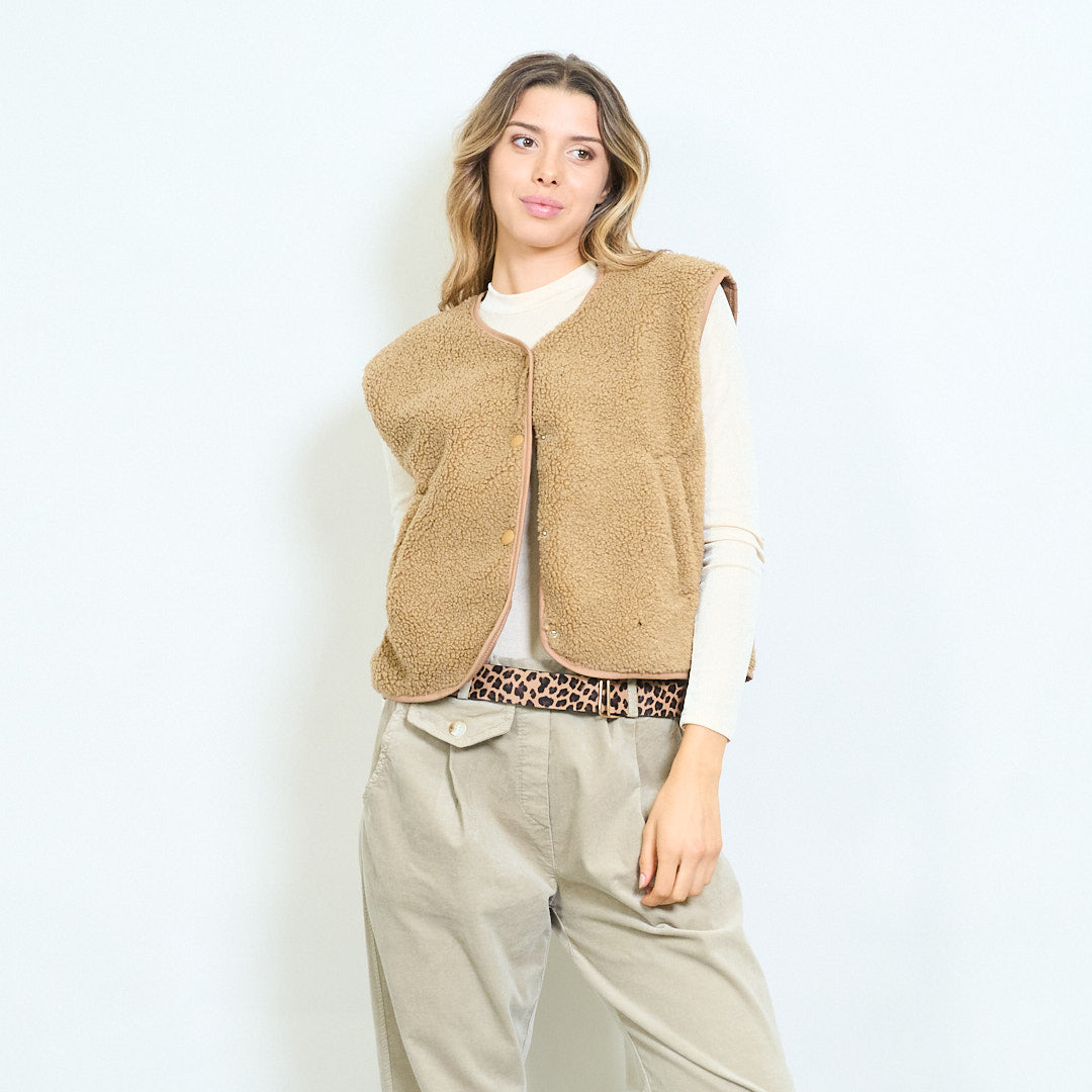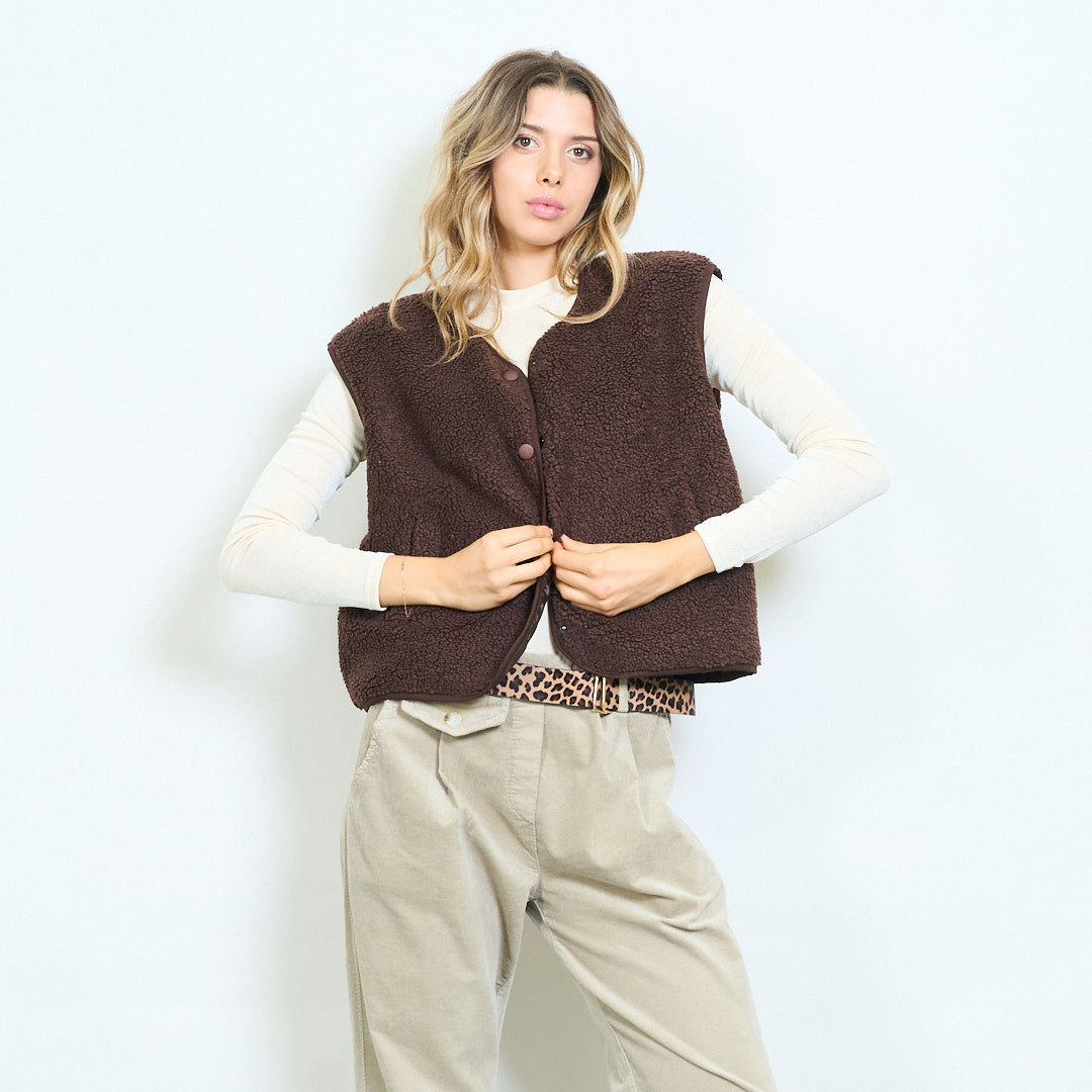- Cozy sleeveless vest crafted with a soft fleece texture for warmth