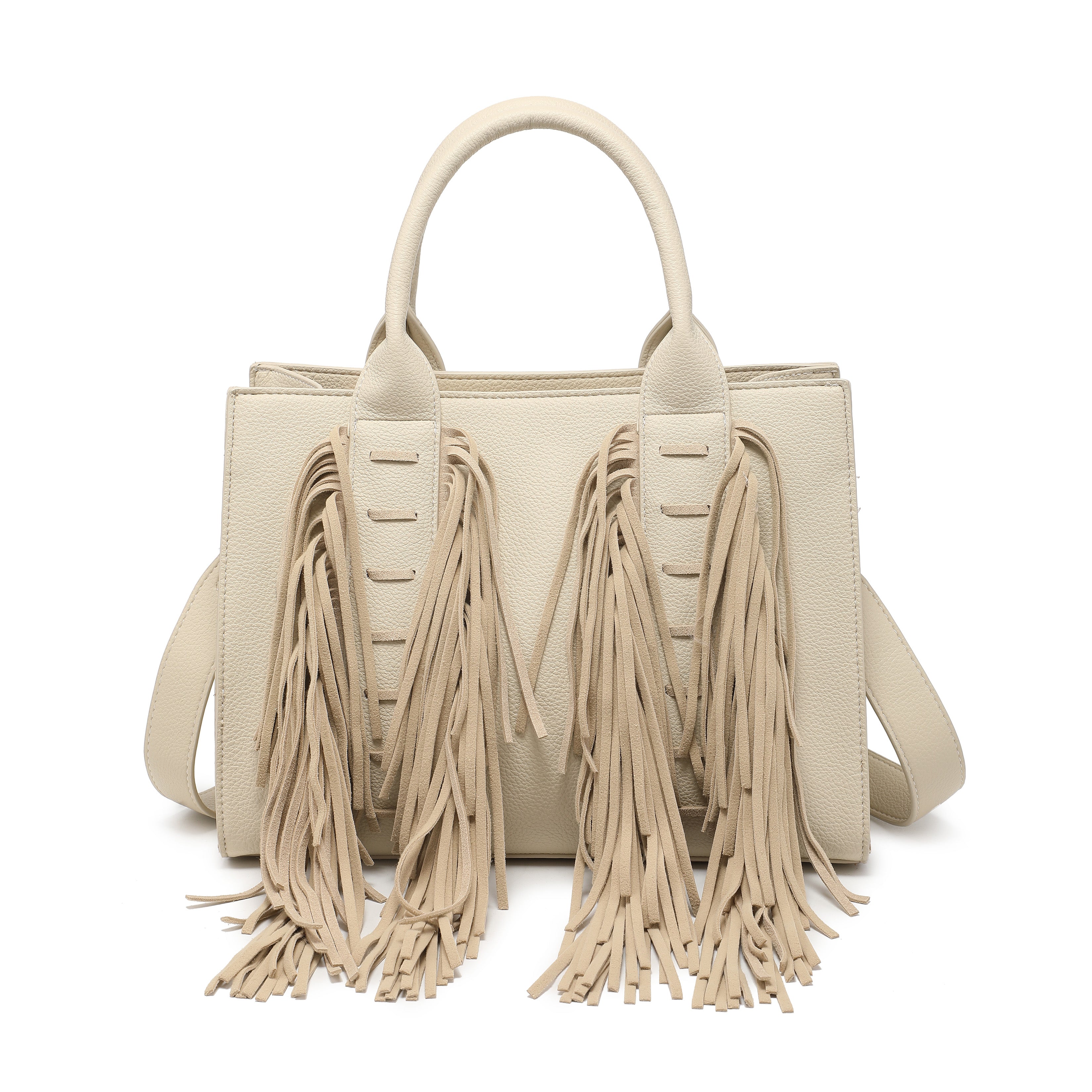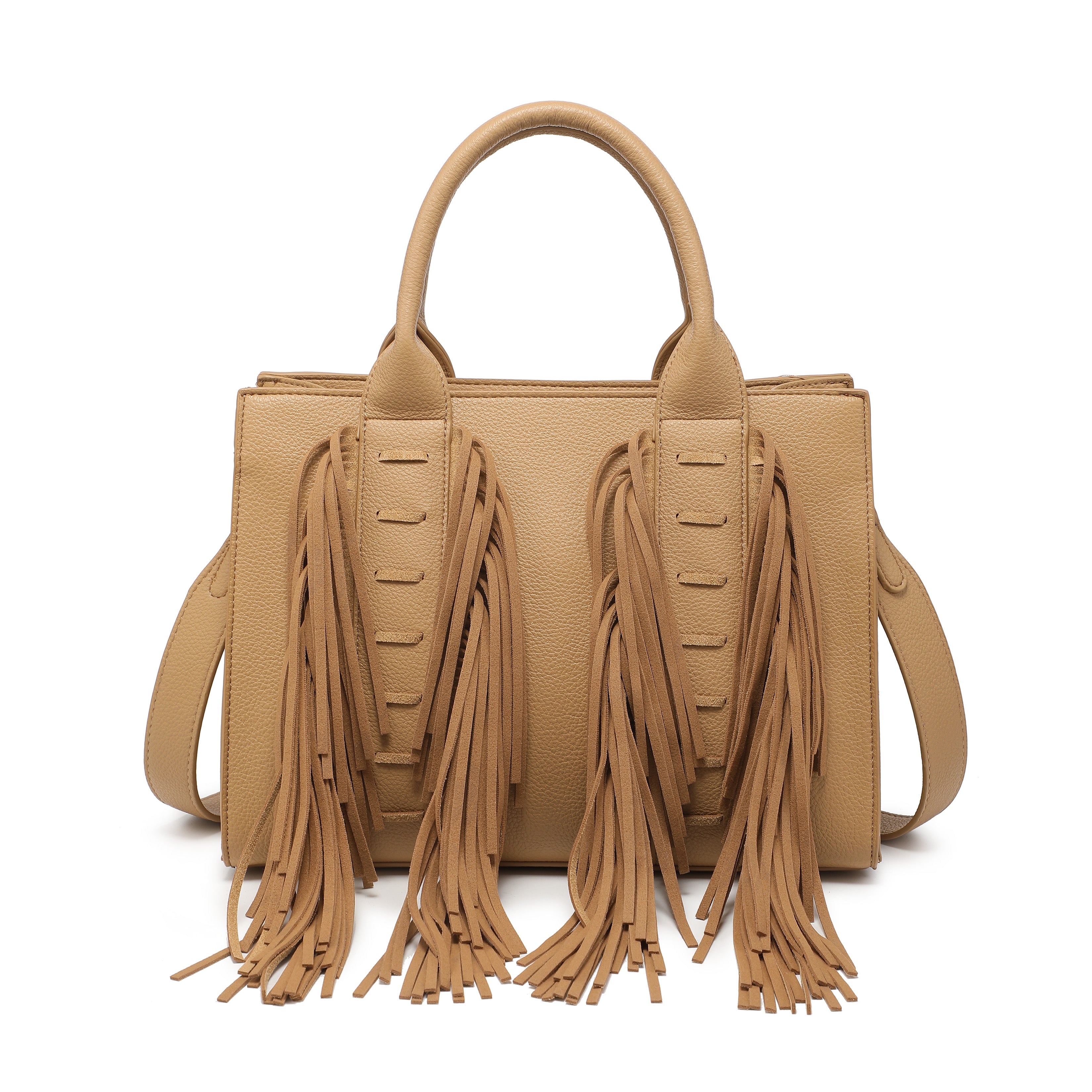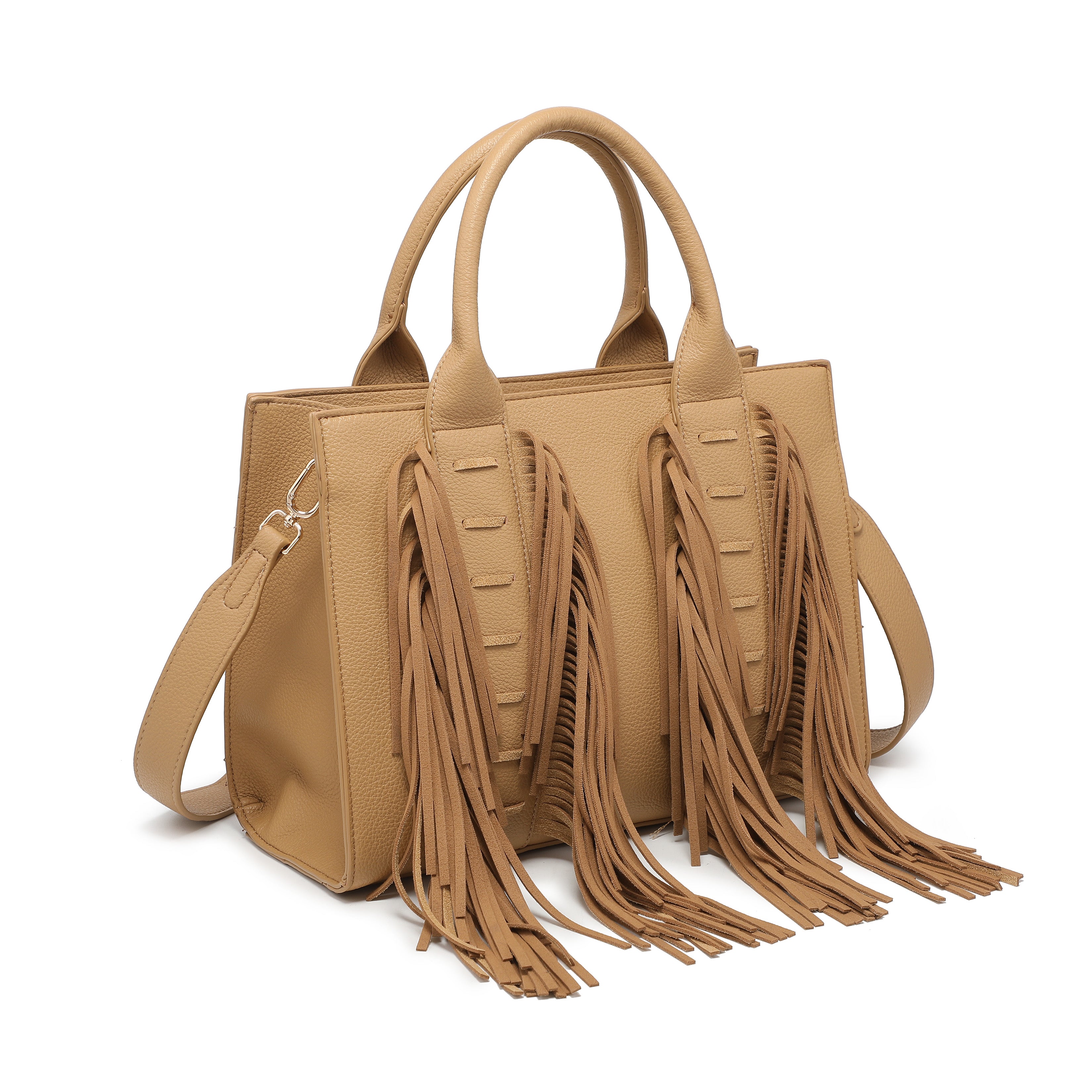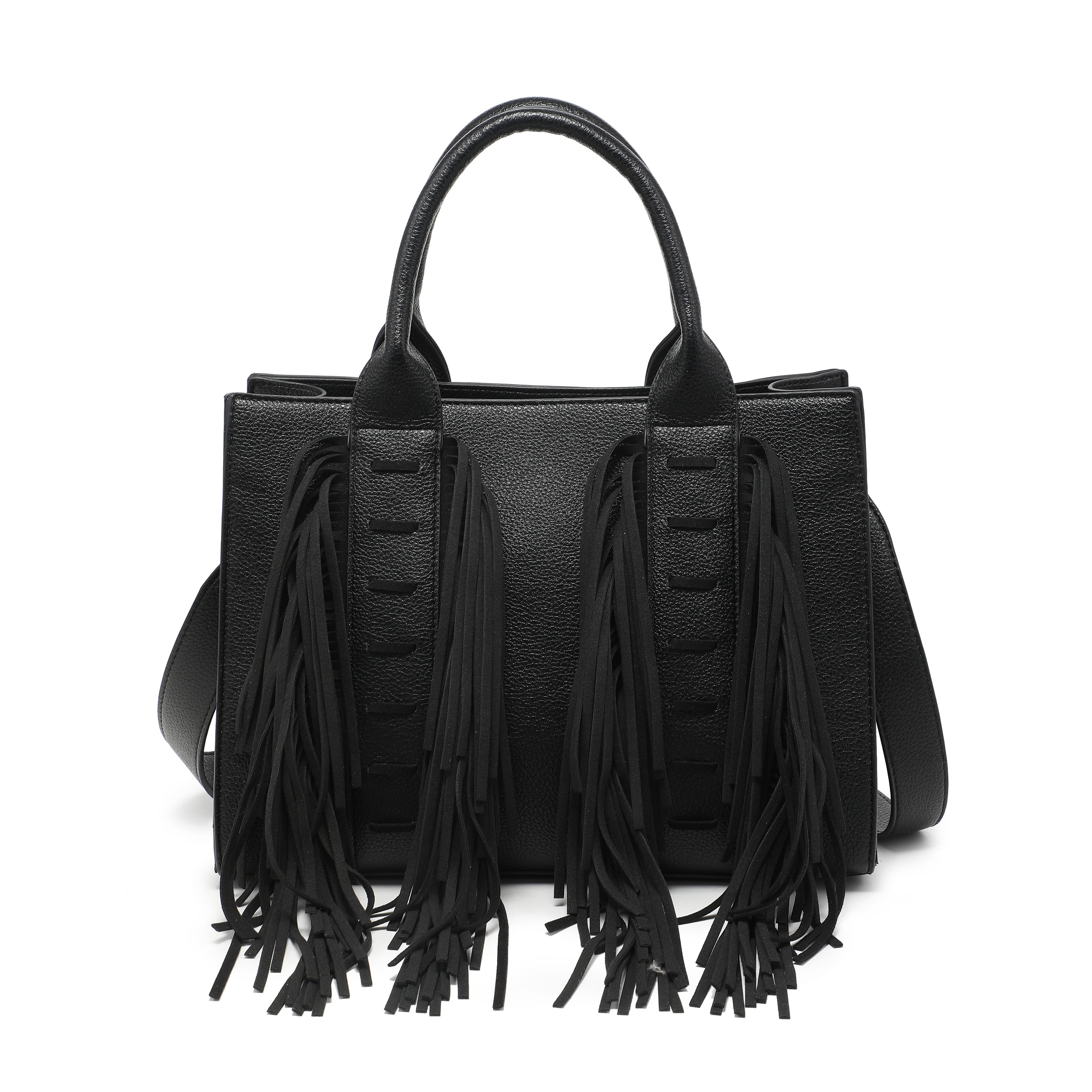 Fringe detail structured tote handbag with top handles and shoulder strap wholesale