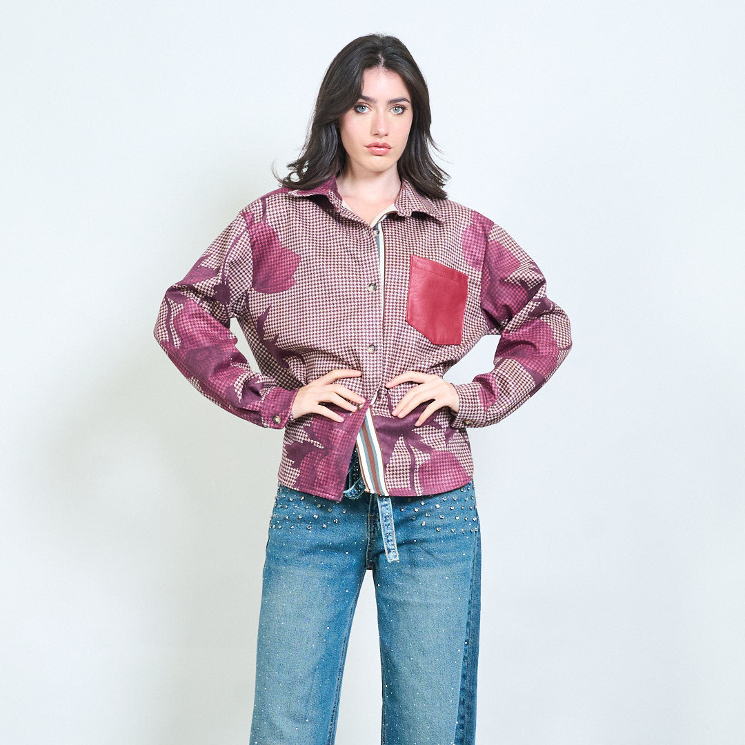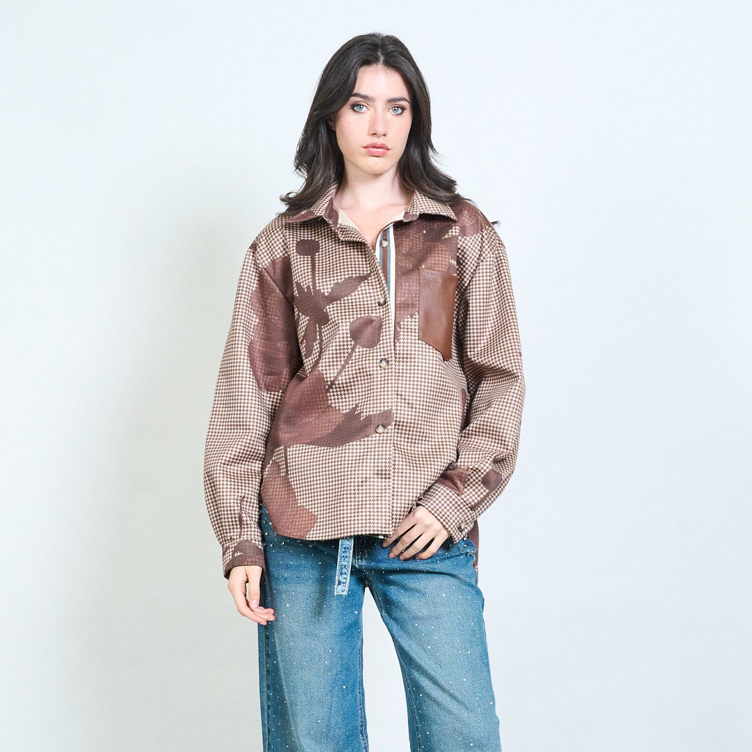 Chequered leaf print contrast pocket button shirt wholesale