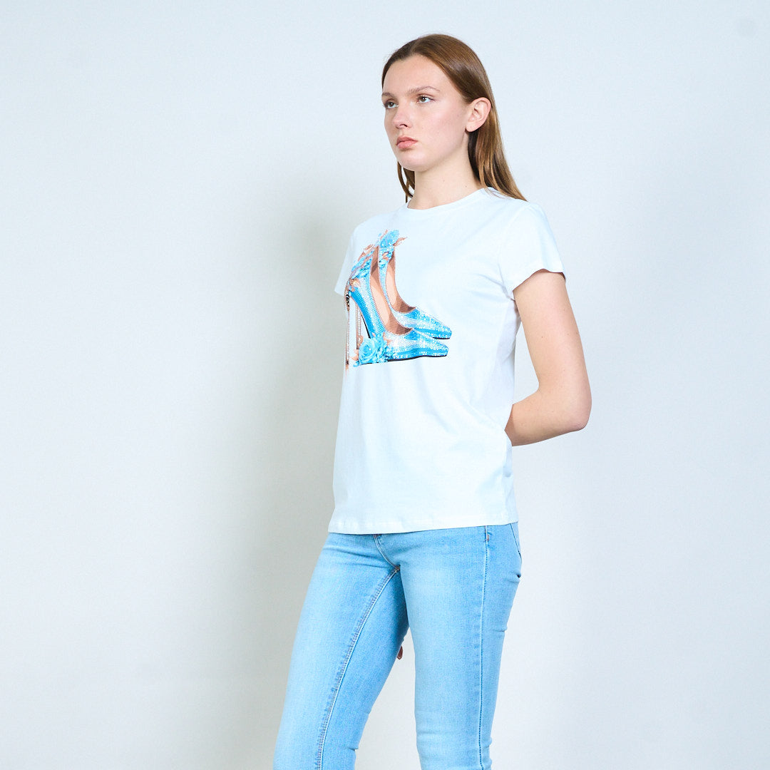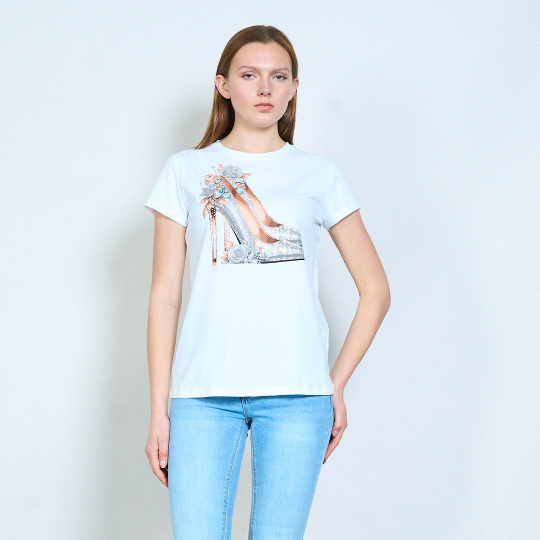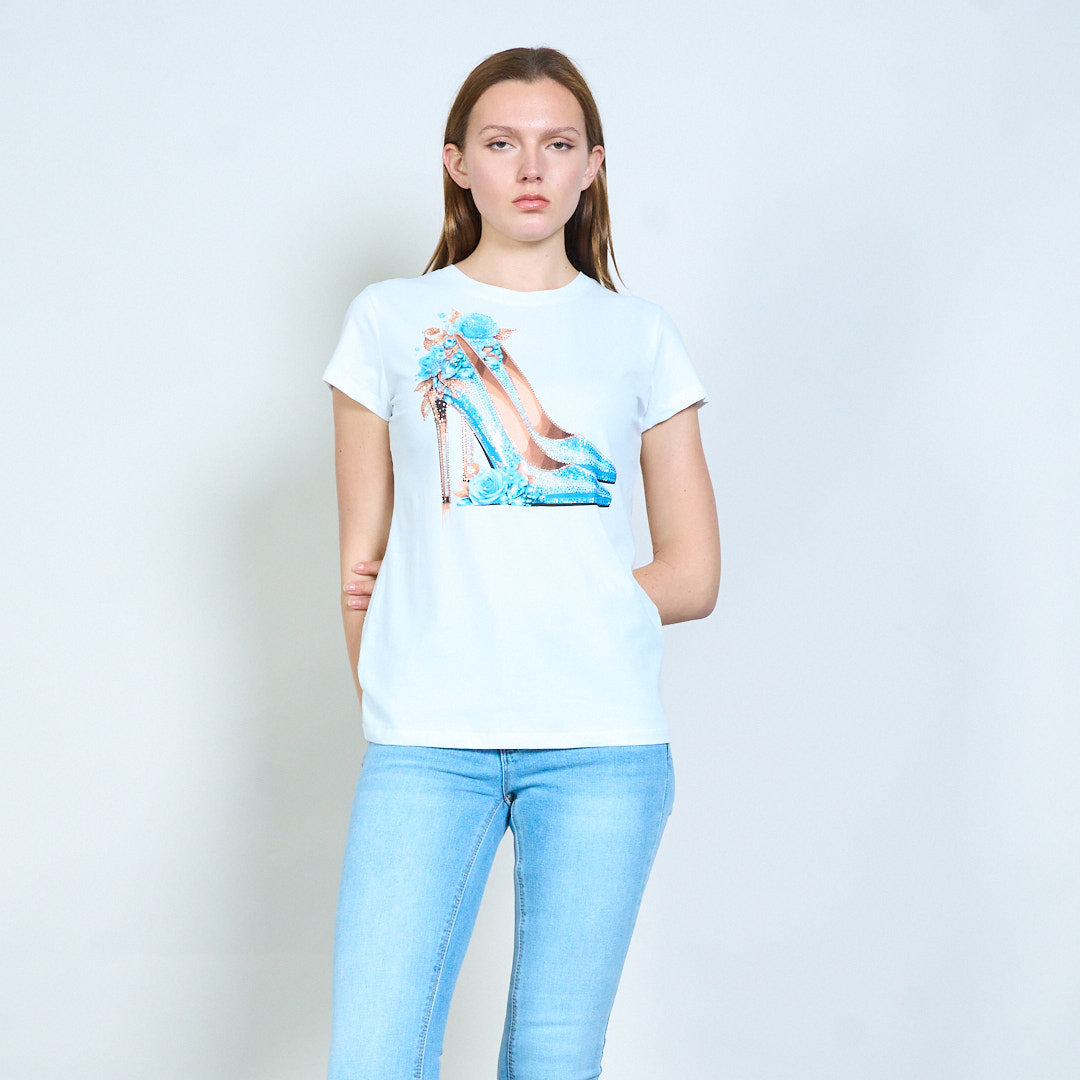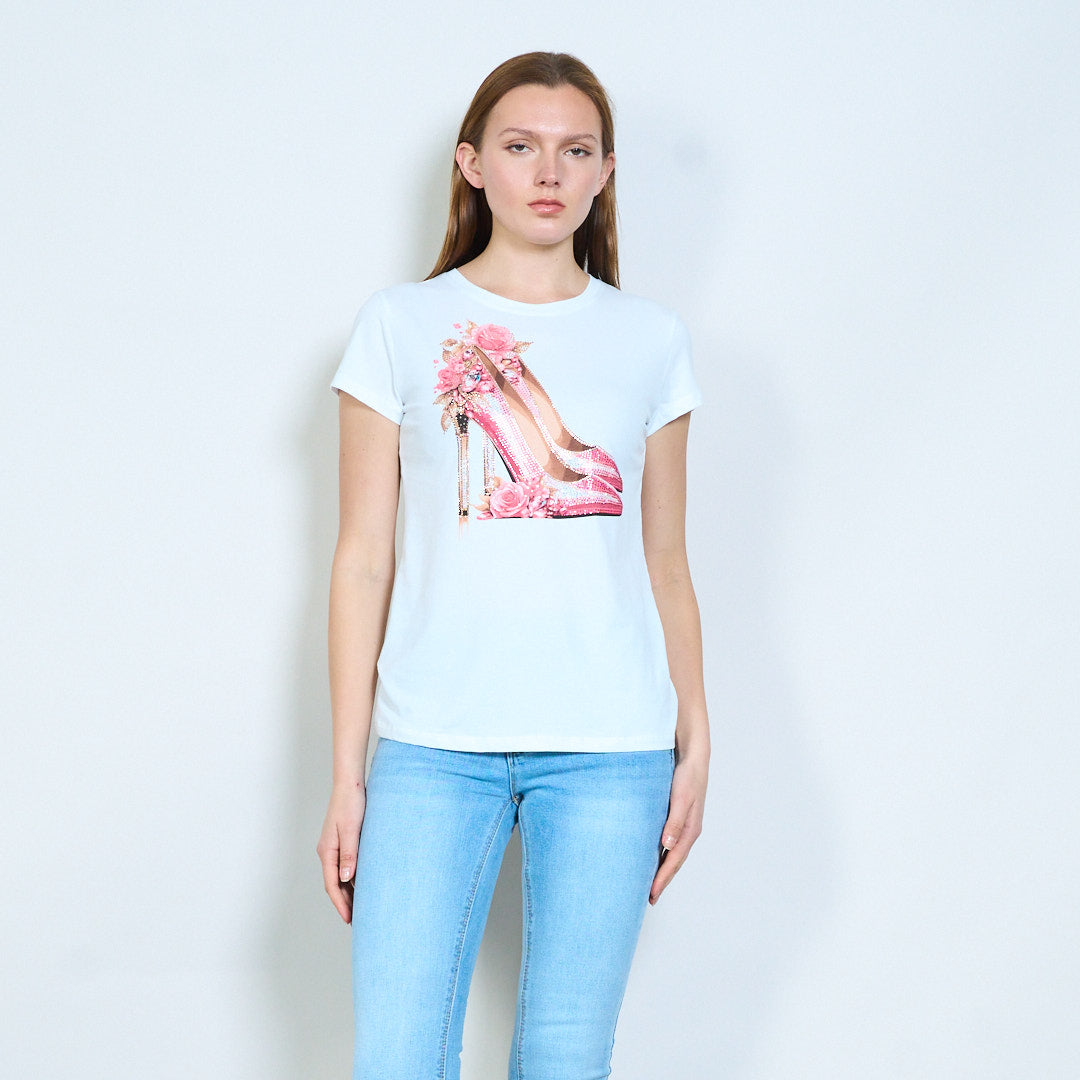 Floral embellished high heel shoes graphic short sleeve t-shirt wholesale