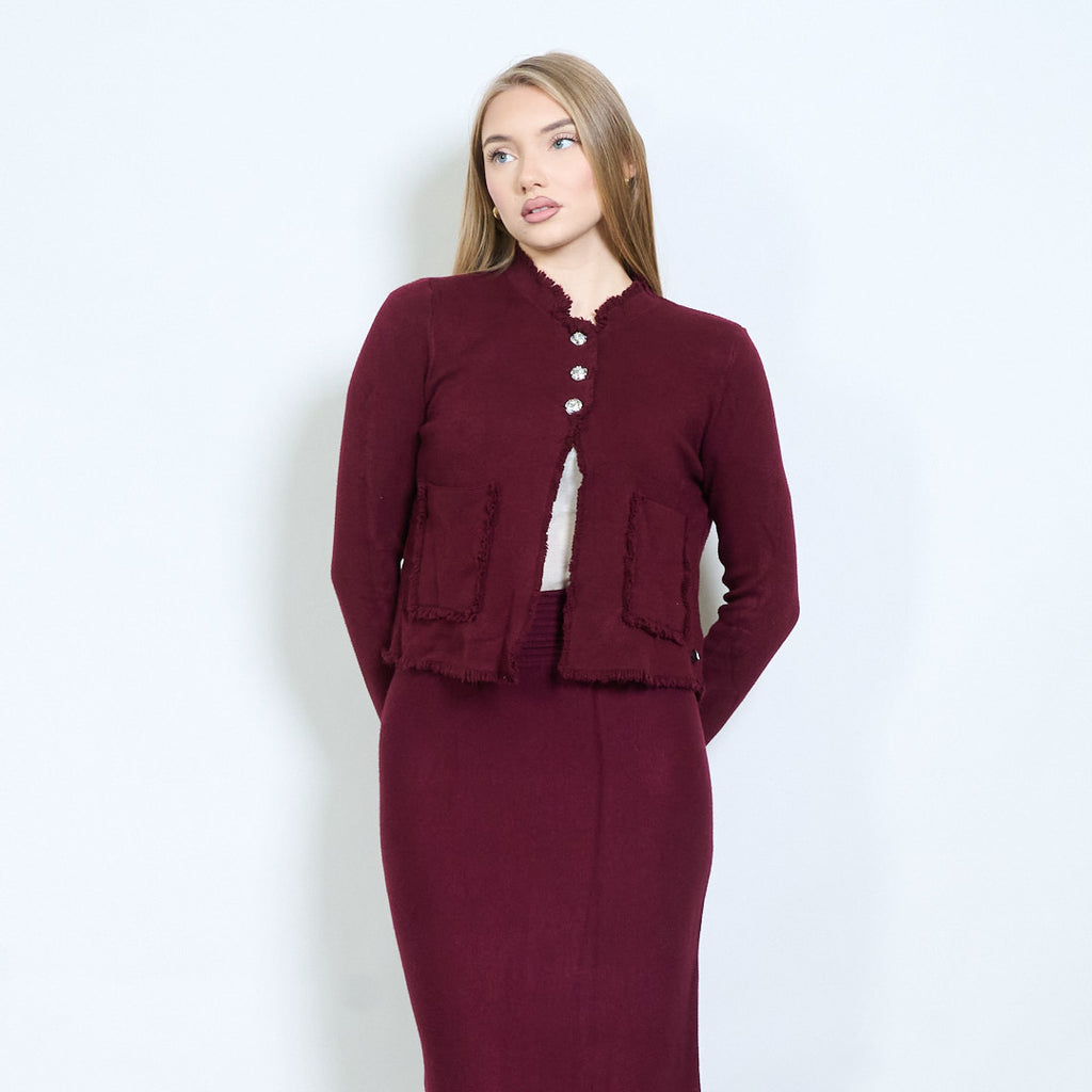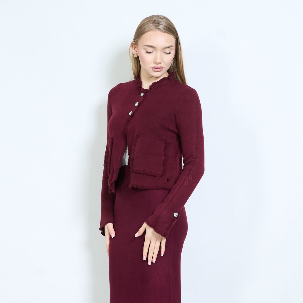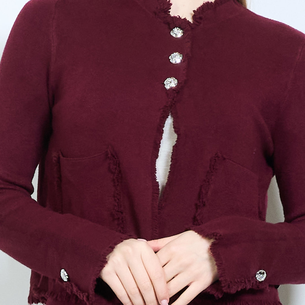 Frayed edge cardigan with jewel buttons and metal heart tag wholesale