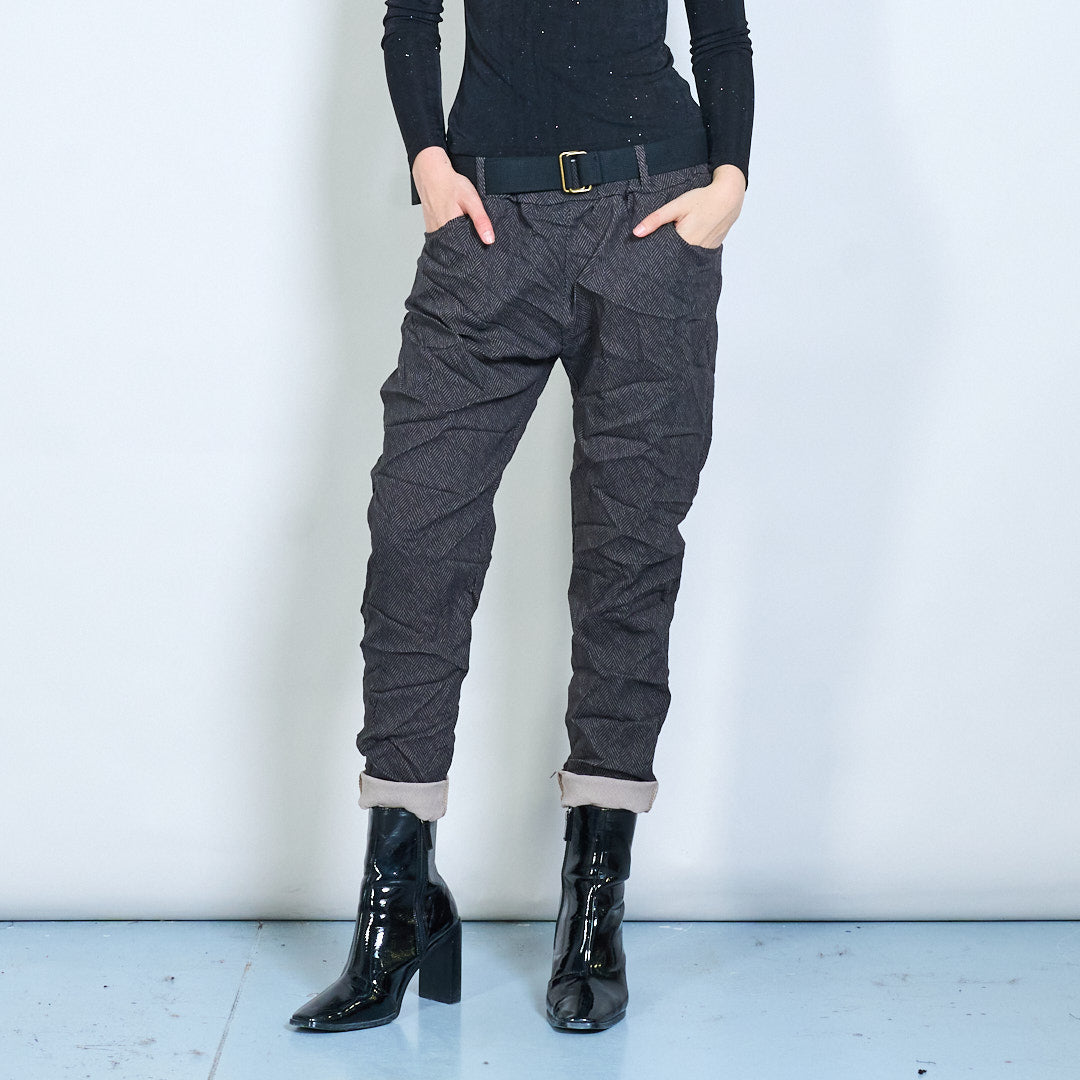 Herringbone pattern patchwork belted casual trousers wholesale