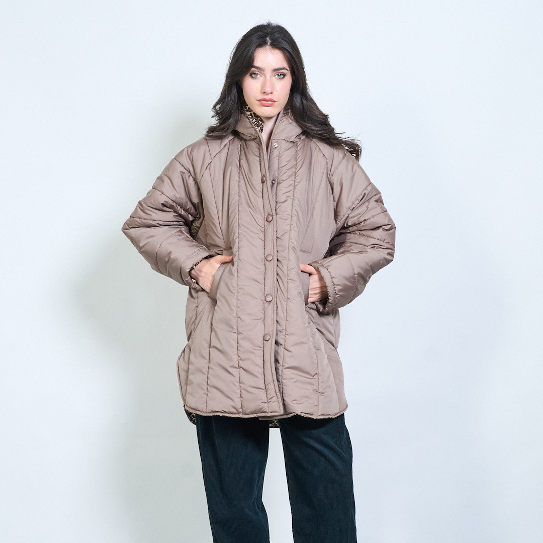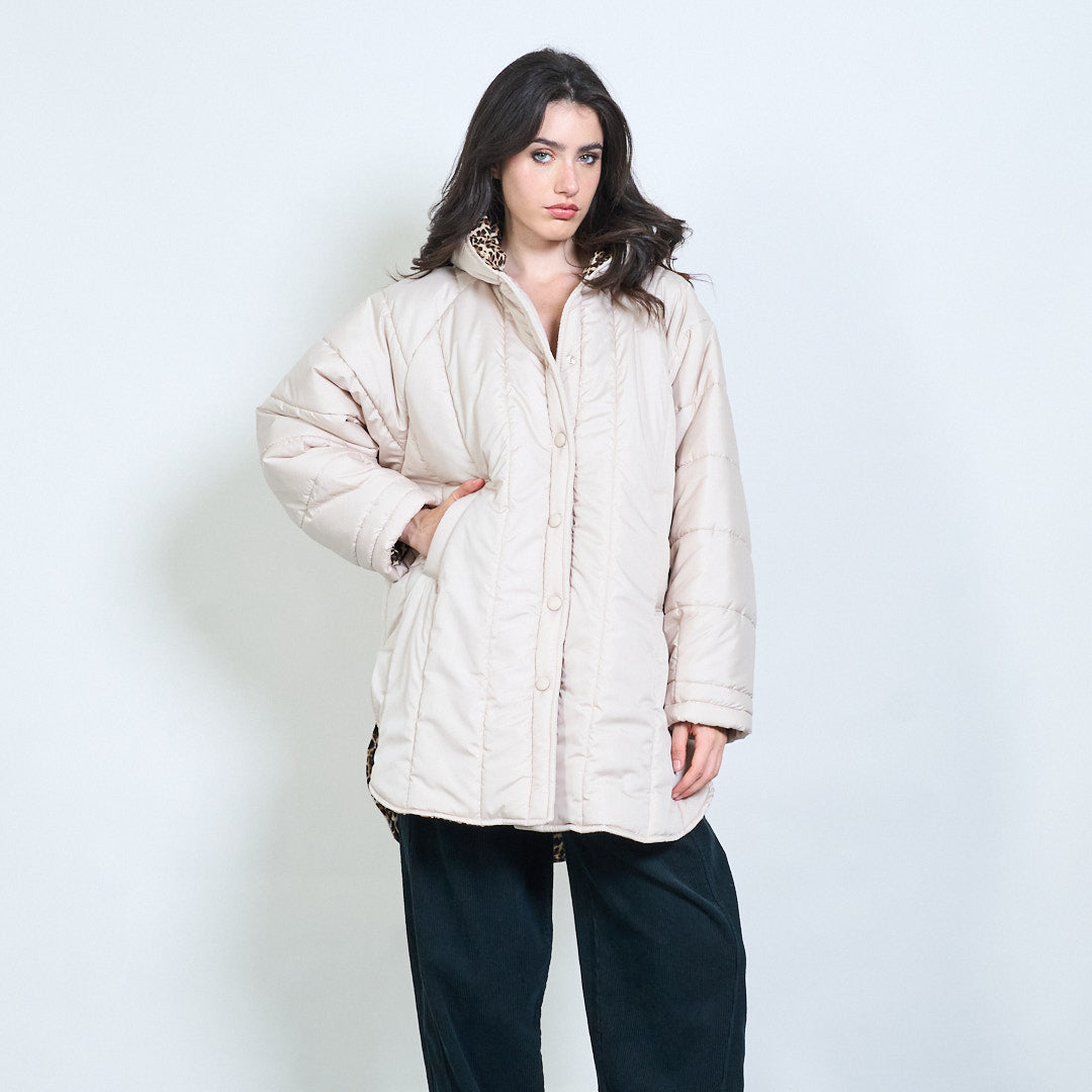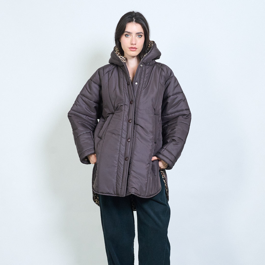 - Subtle leopard print lining visible at the collar and cuffs for a bold twist