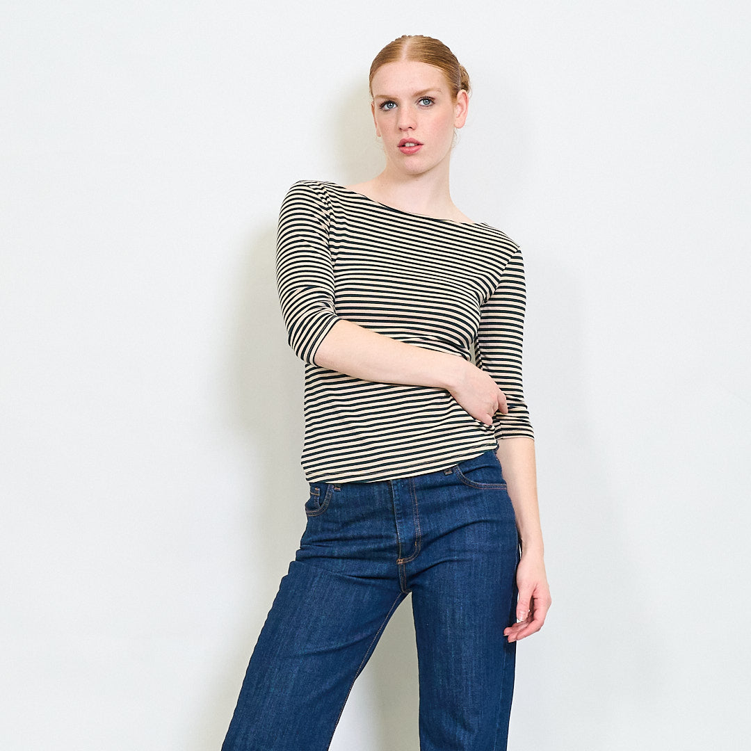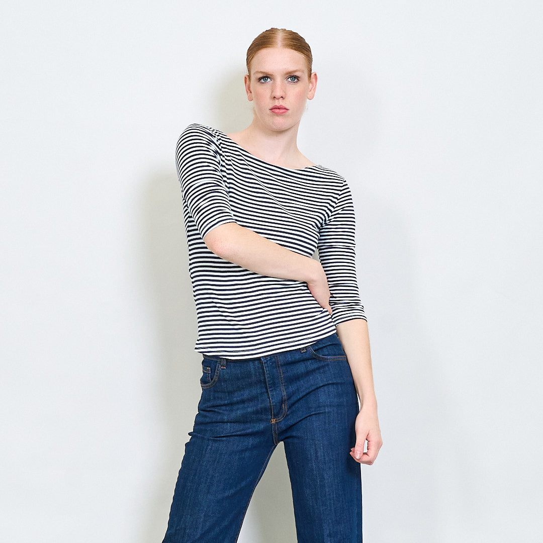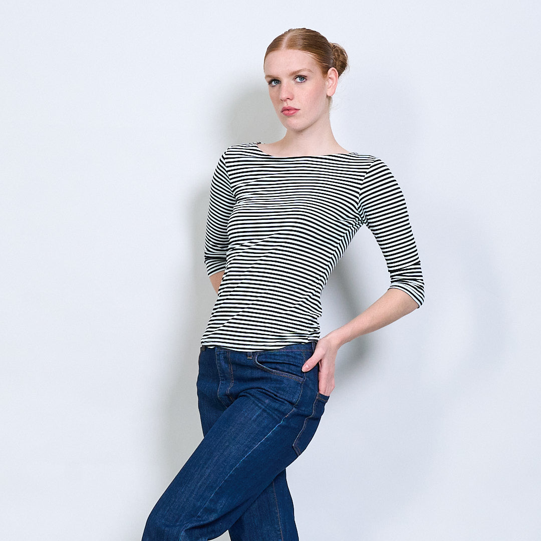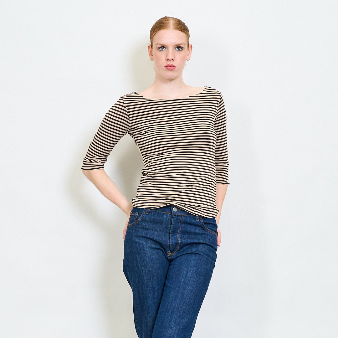Striped scoop neck fitted top with 3/4 sleeves wholesale