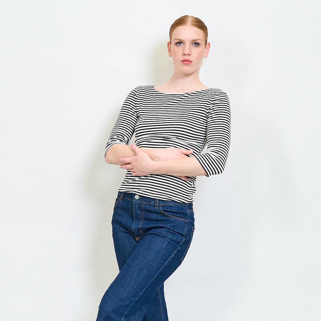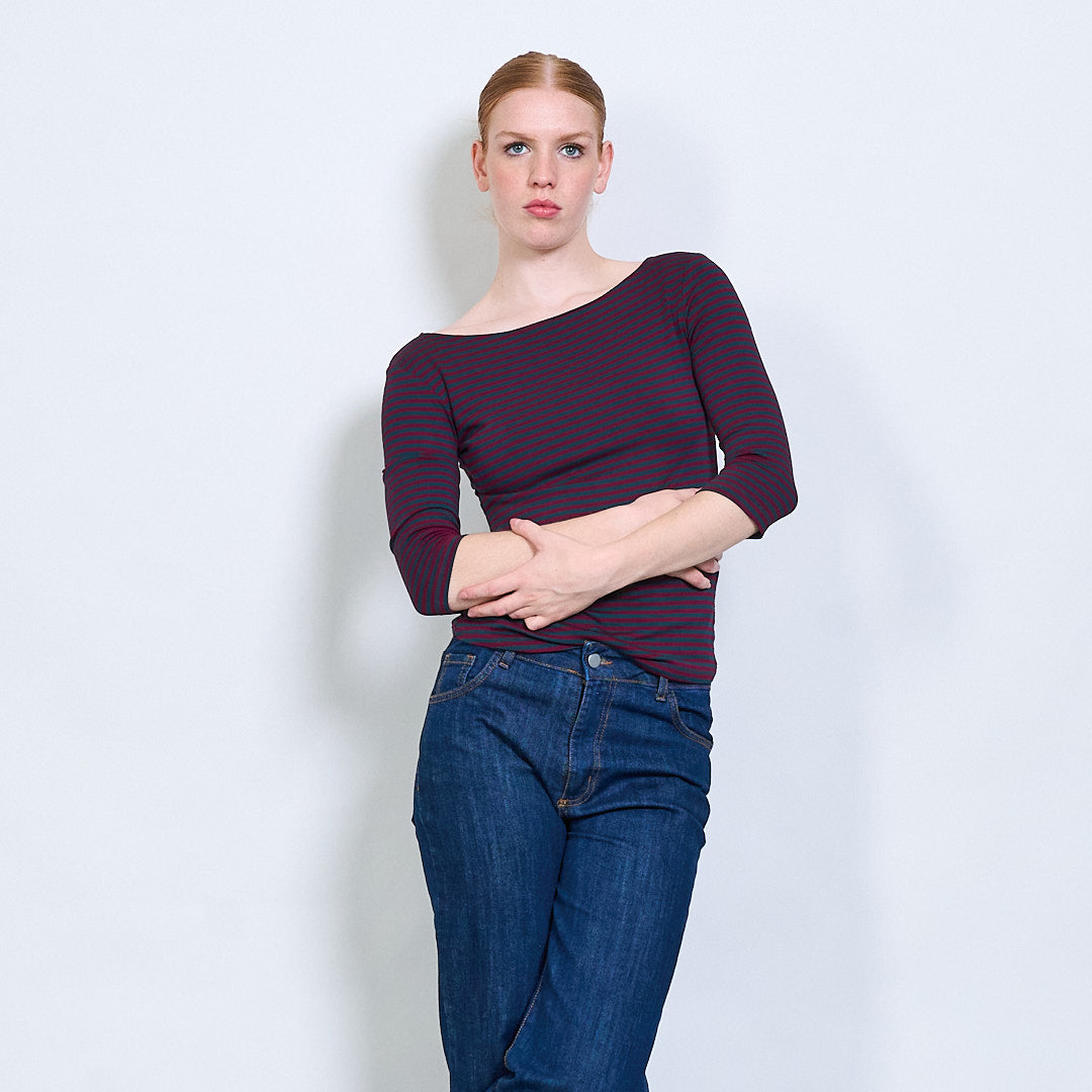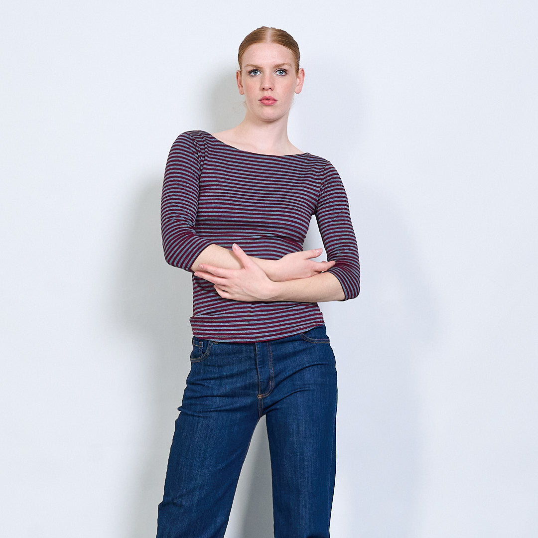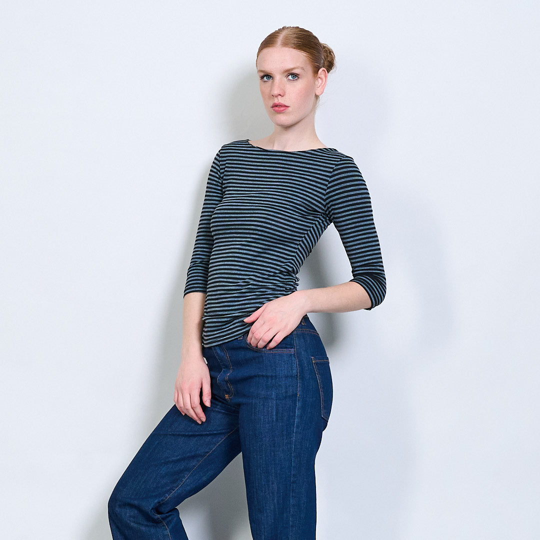 Striped scoop neck fitted top with 3/4 sleeves wholesale