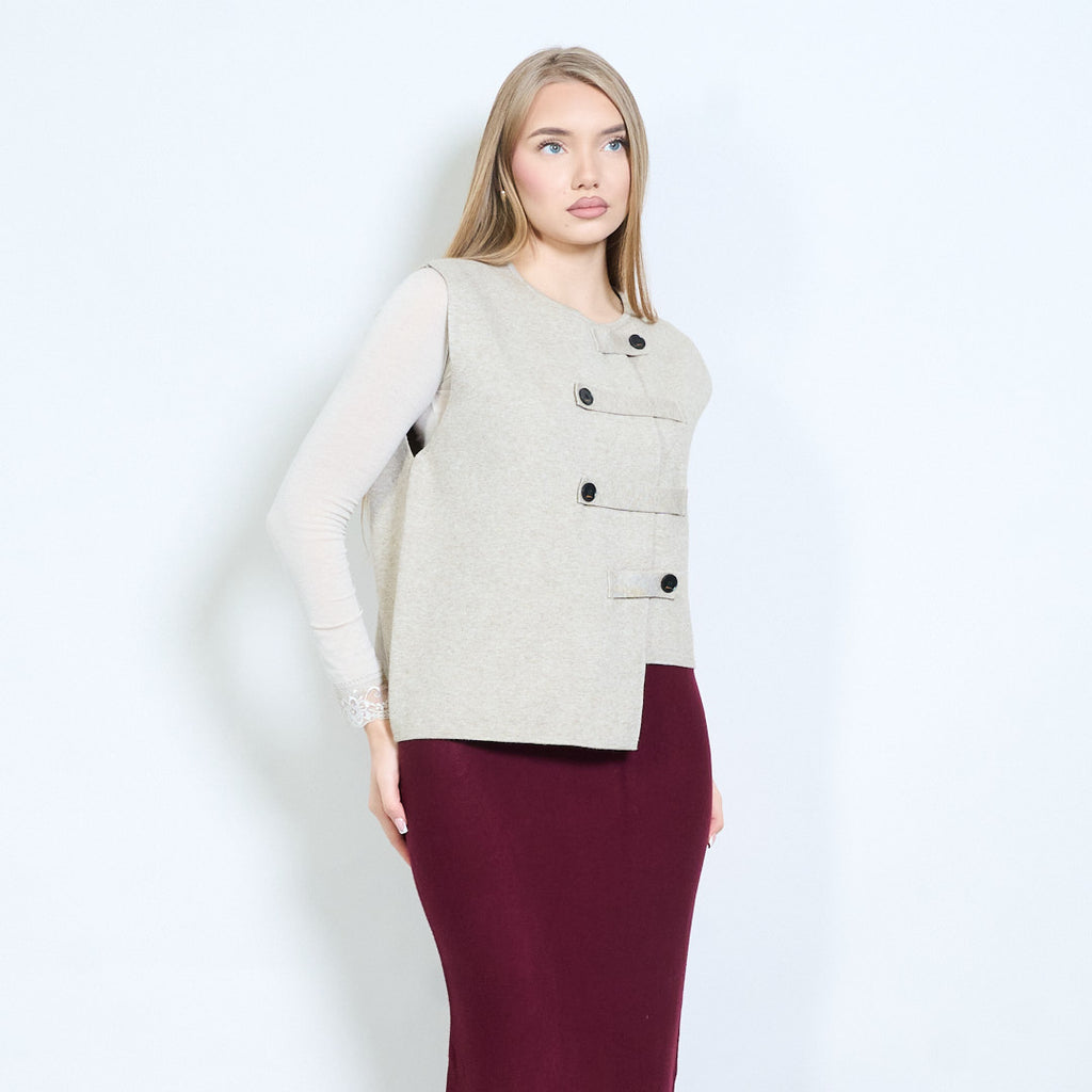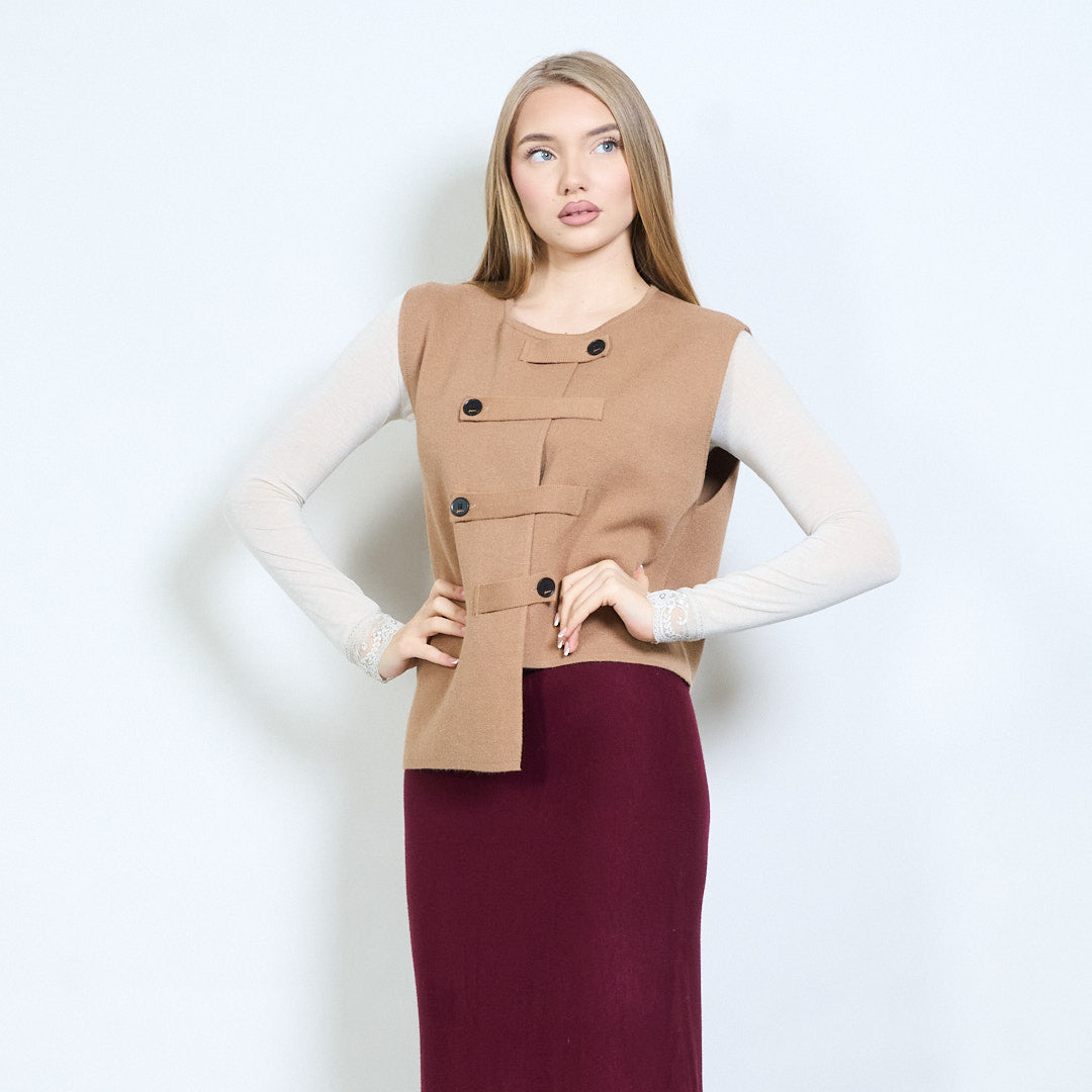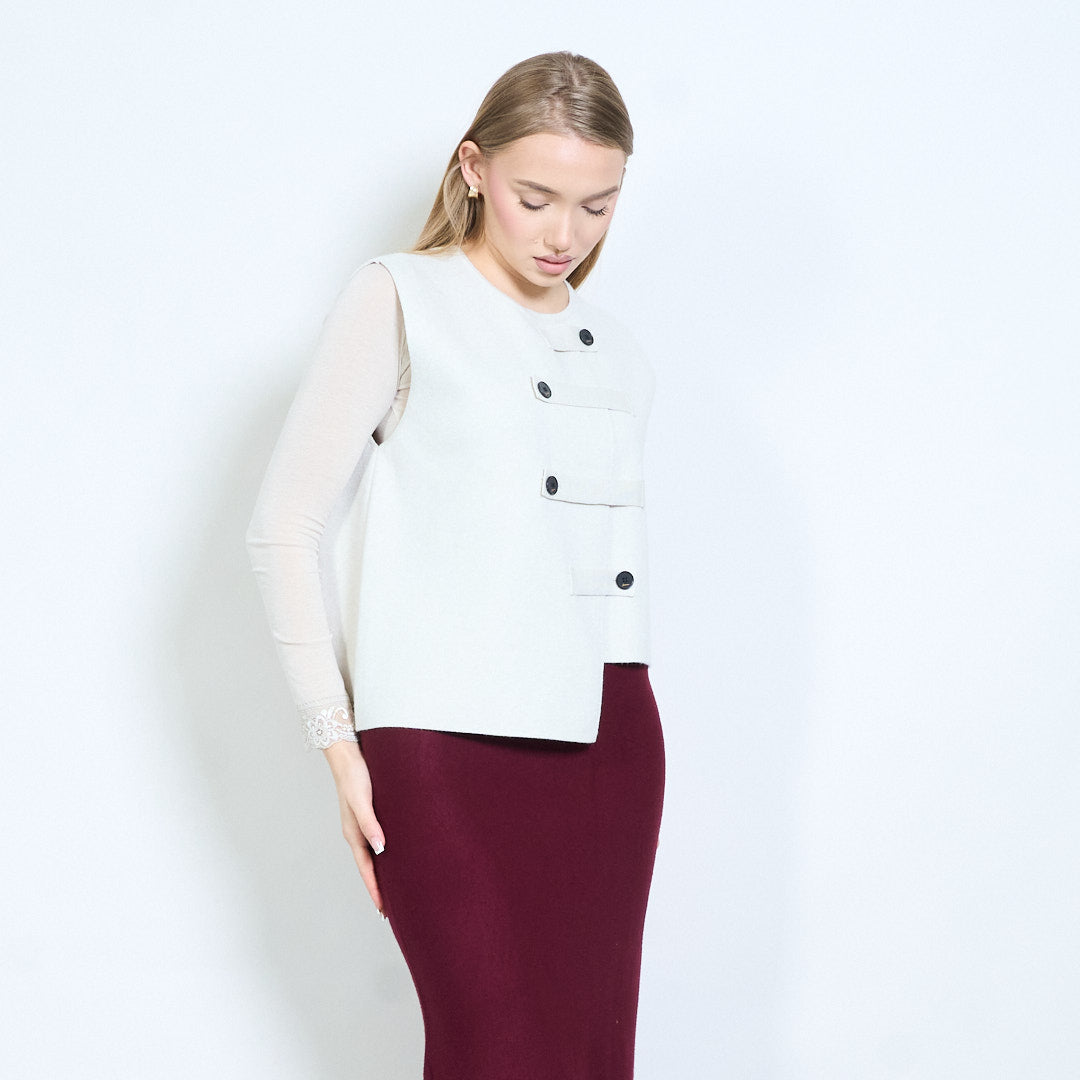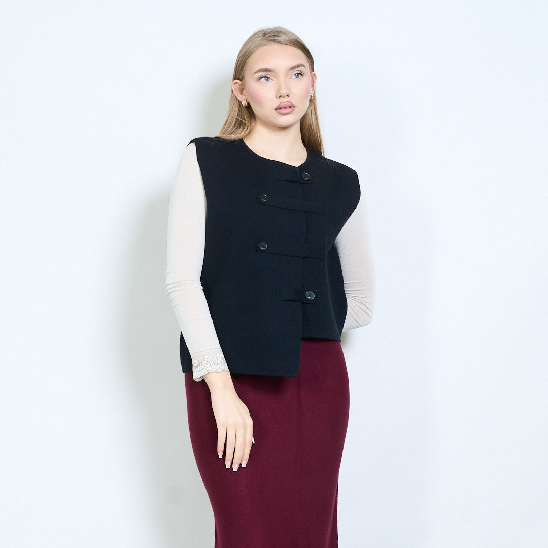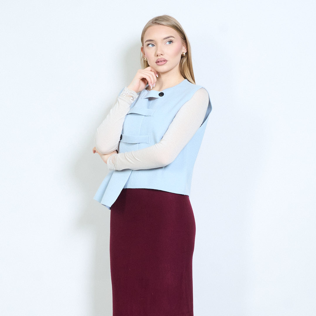 • Structured sleeveless silhouette offering a clean and refined appearance
