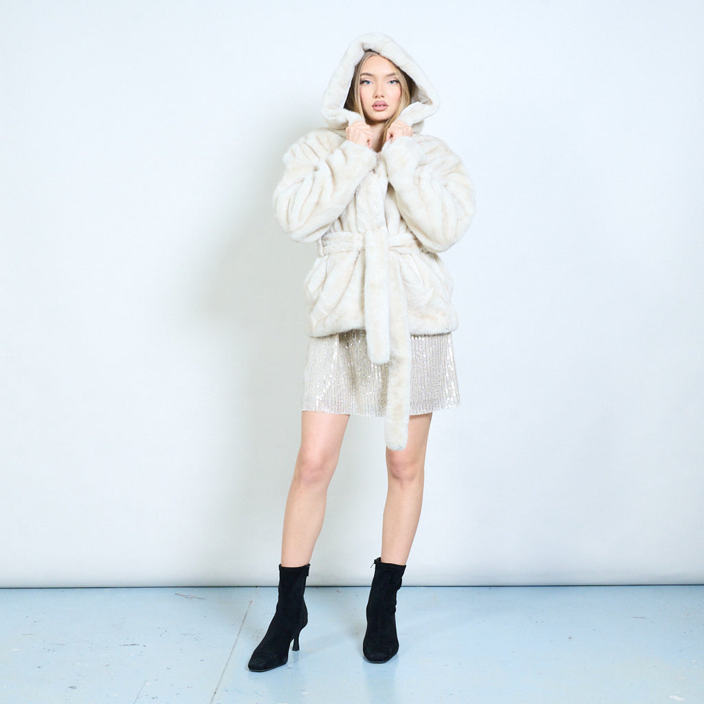 - Plush faux fur coat crafted with a soft, velvety texture for elevated winter comfort