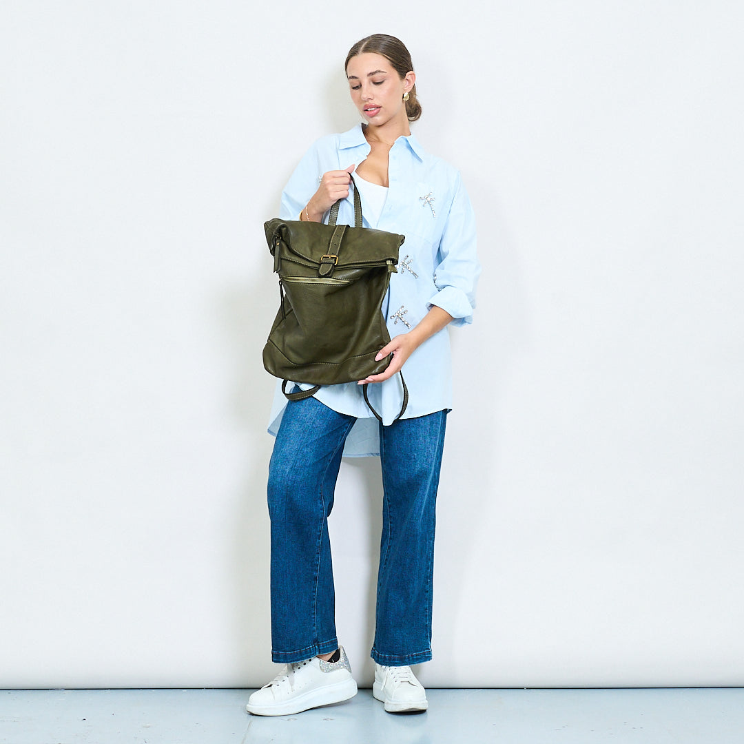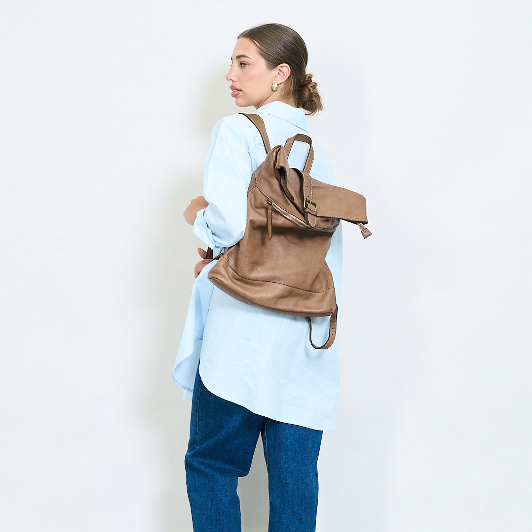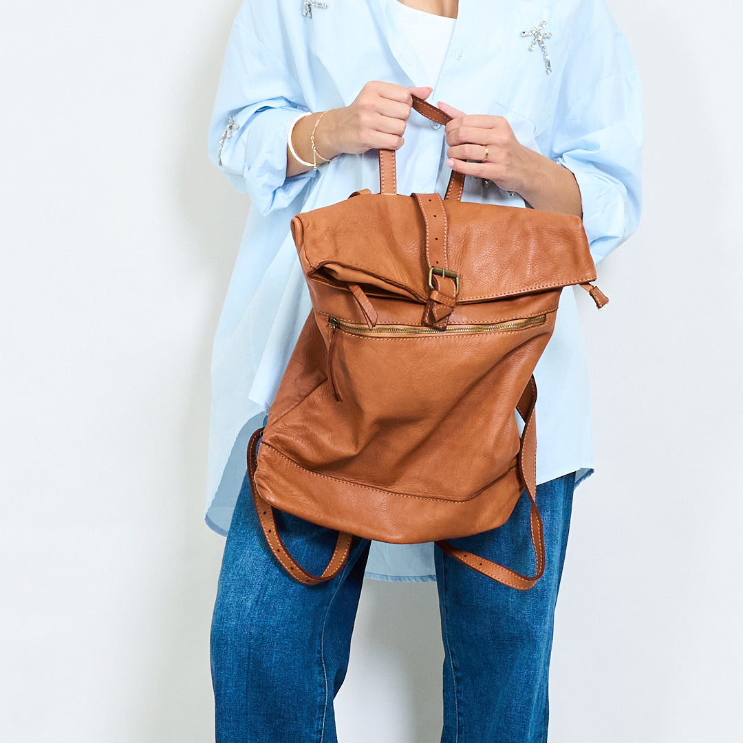 Fold-over leather backpack with buckle and zip pocket wholesale