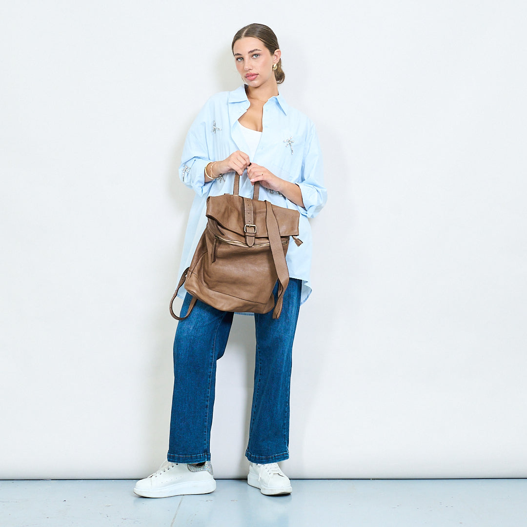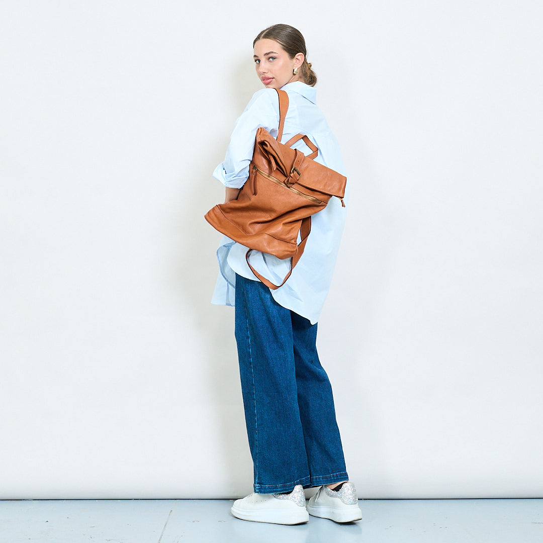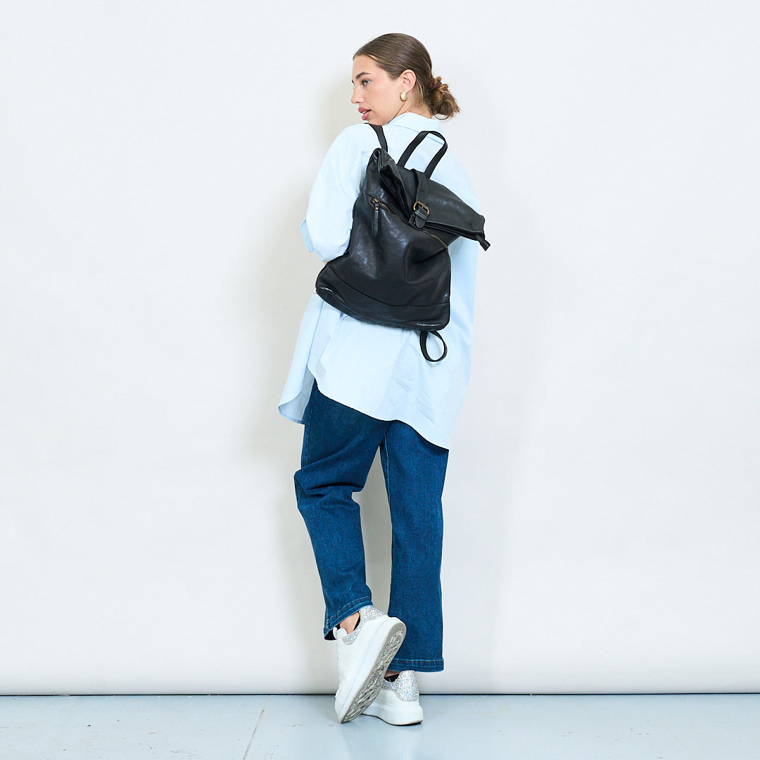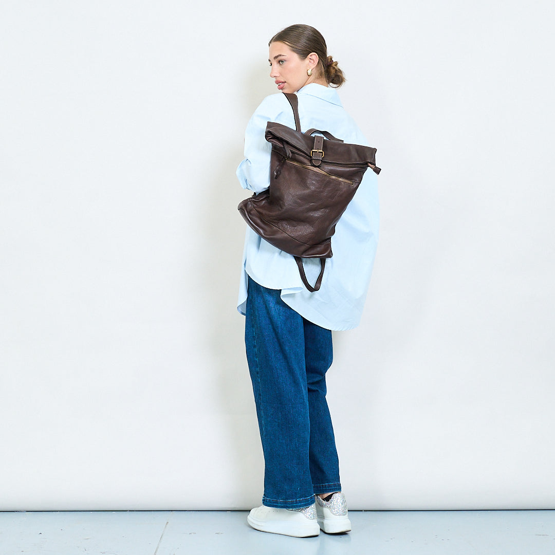 Fold-over leather backpack with buckle and zip pocket wholesale
