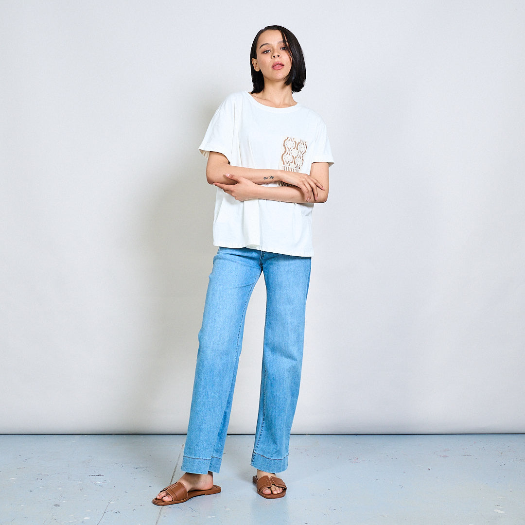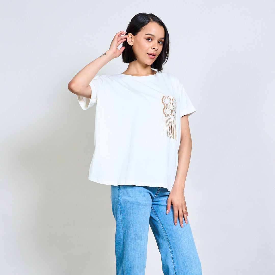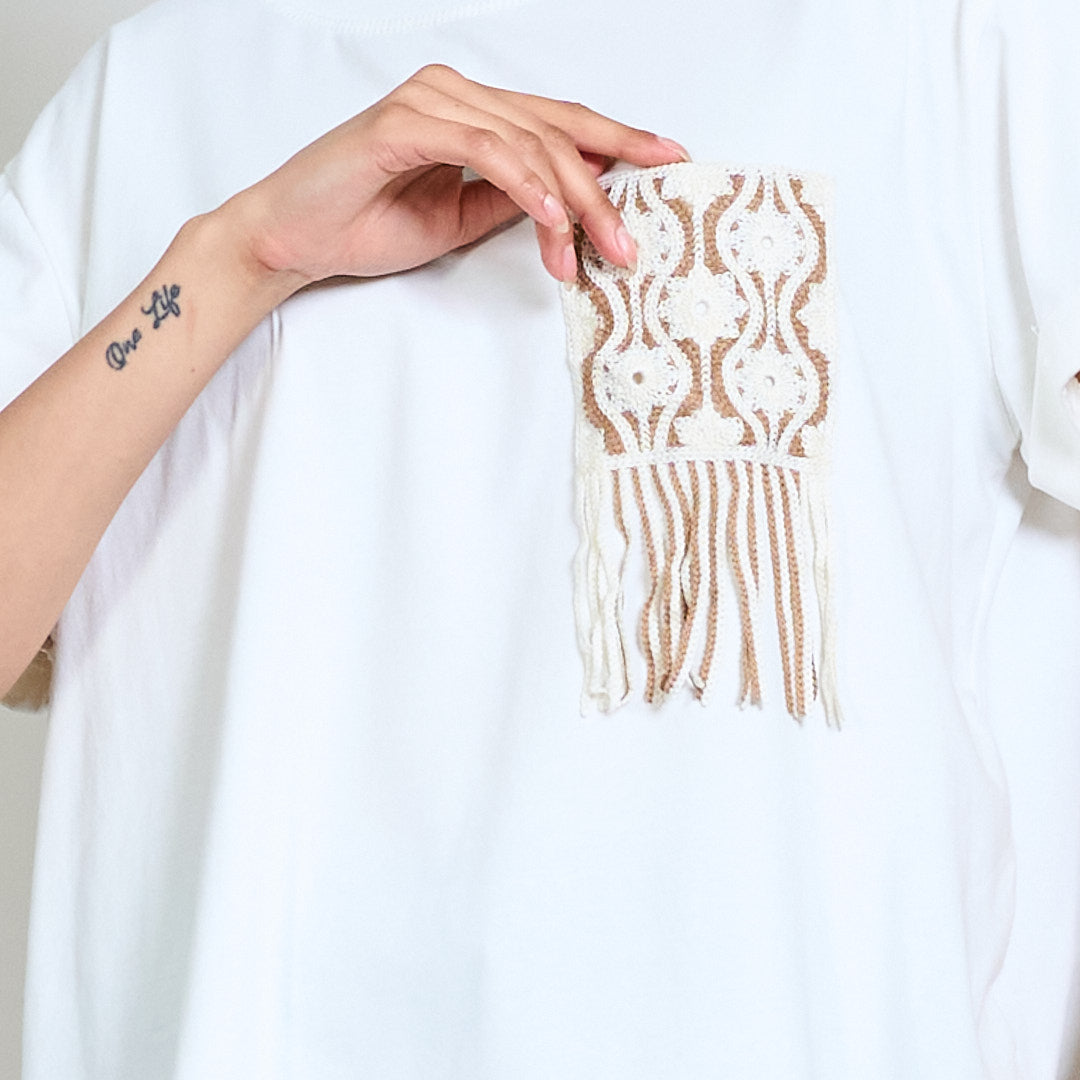 Embroidered pocket t-shirt with fringe beaded trim wholesale