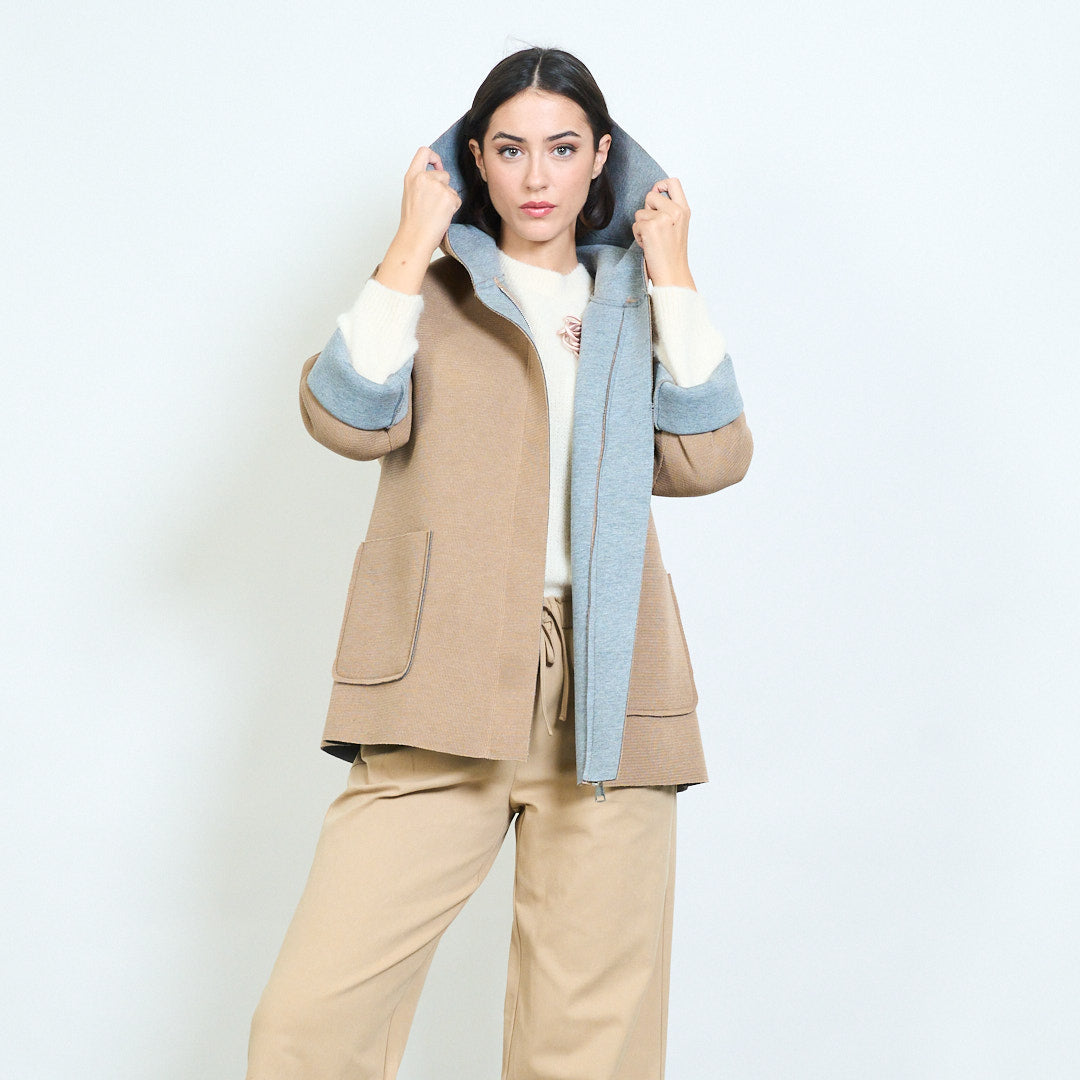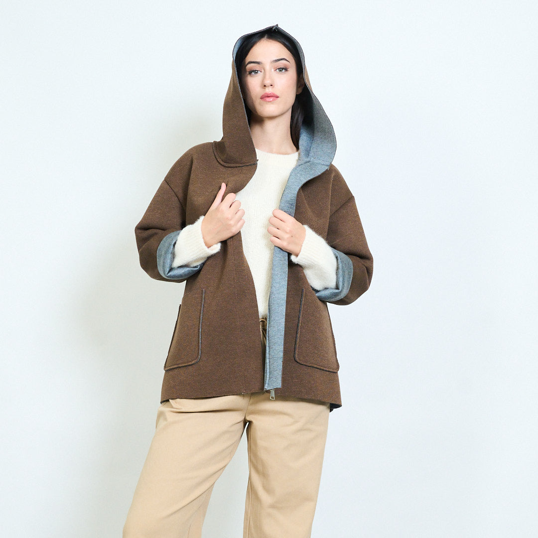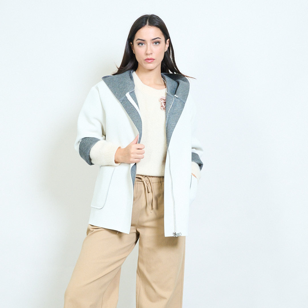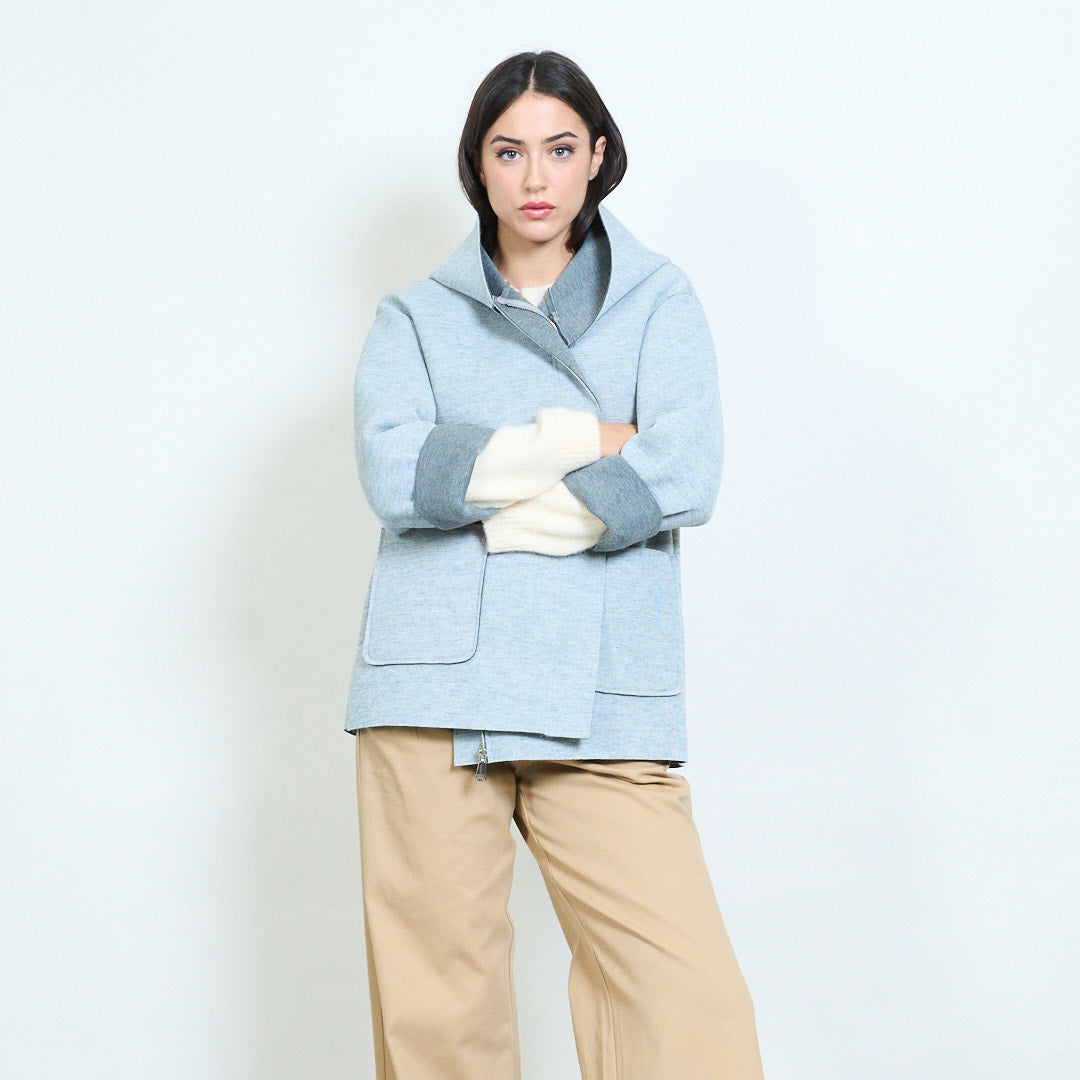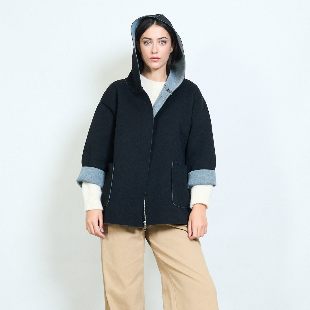 - Folded sleeve cuffs revealing subtle contrast lining detail