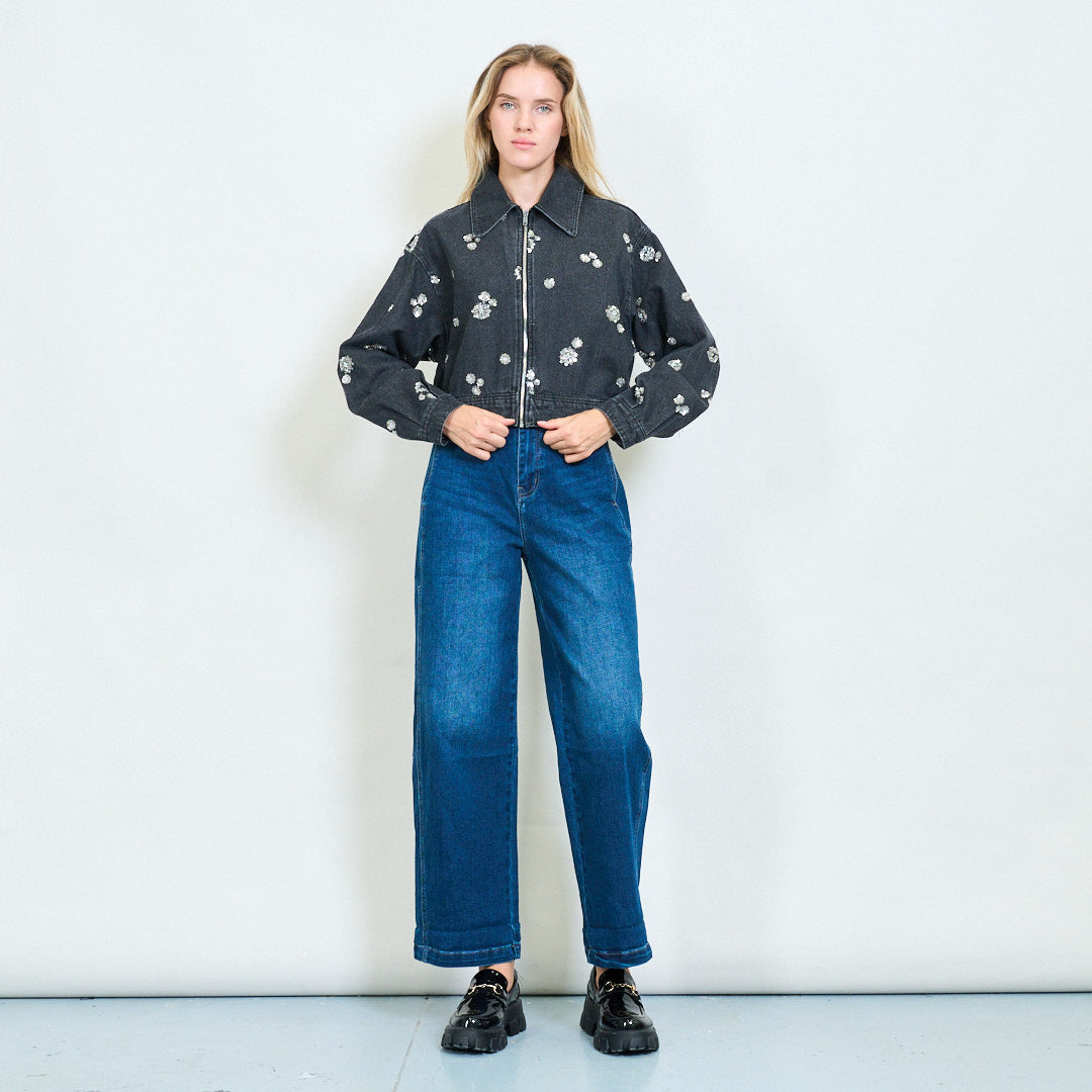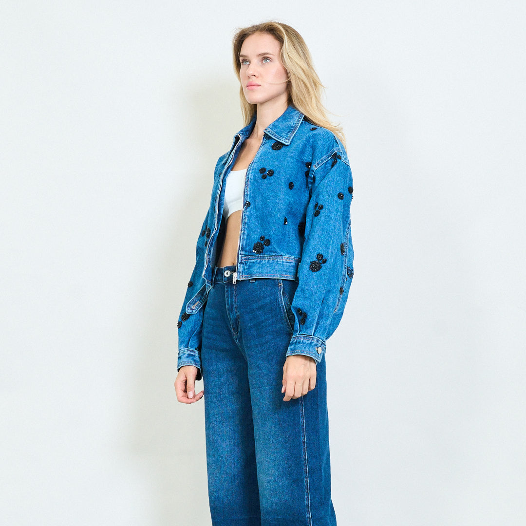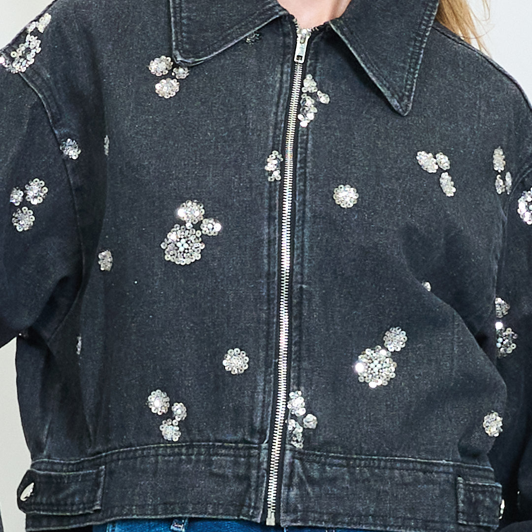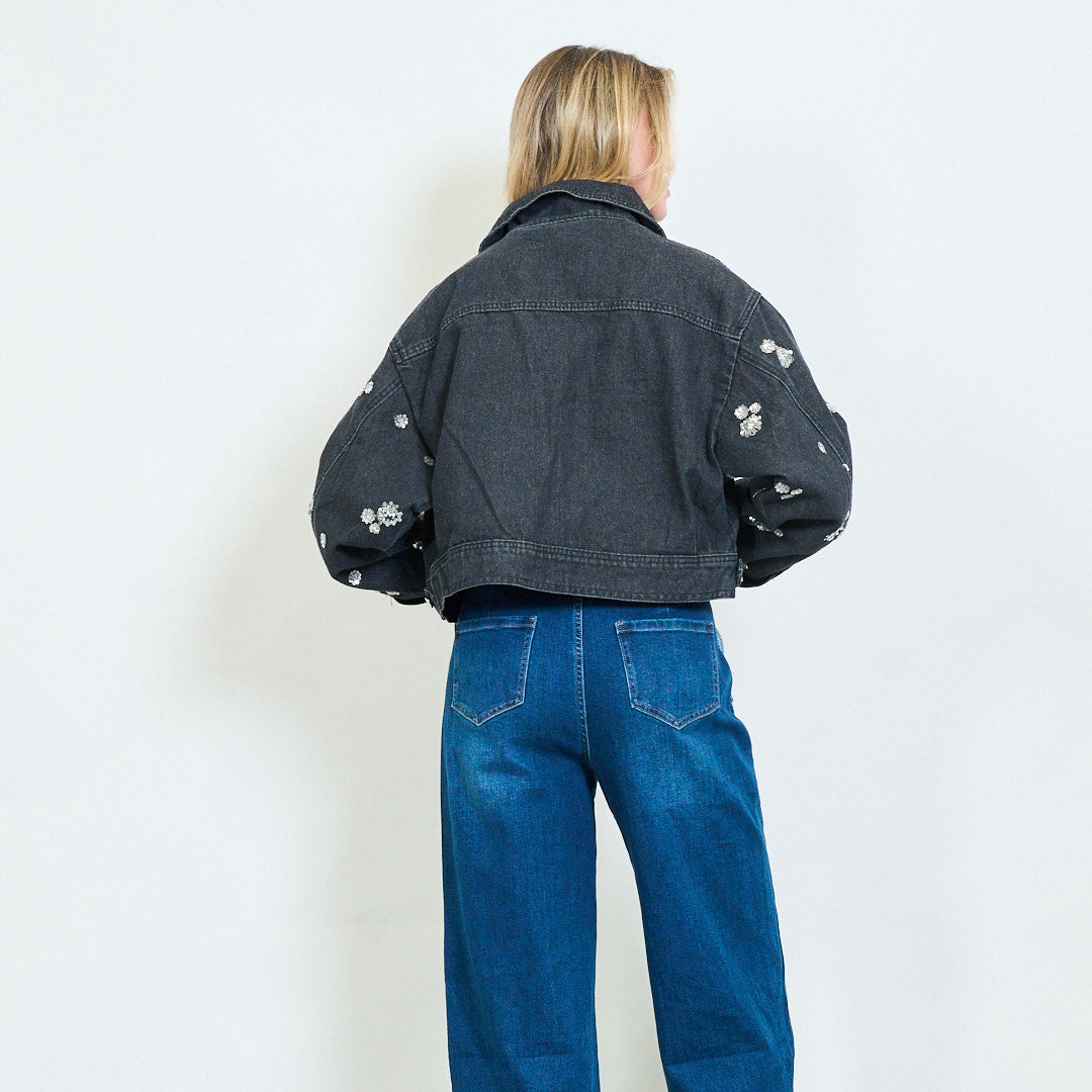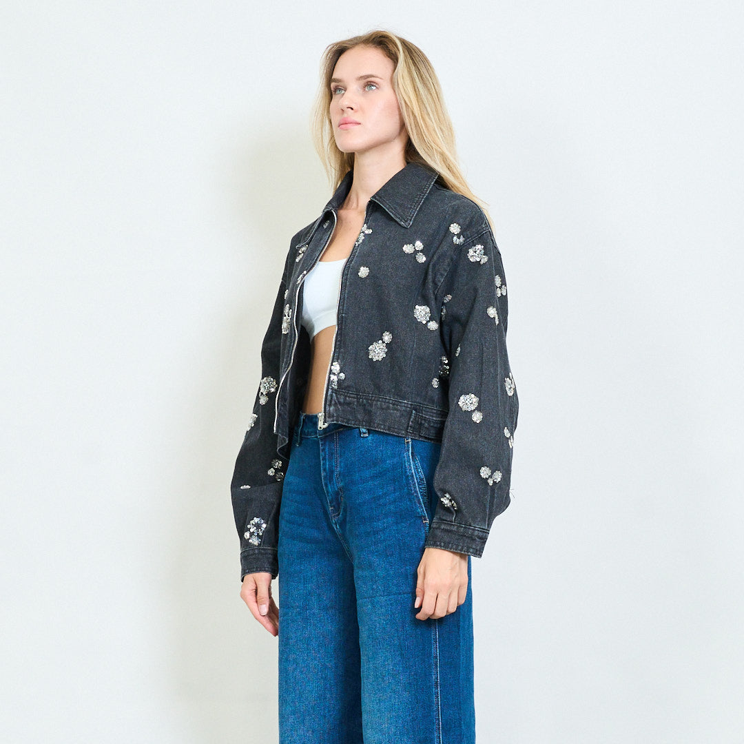 - Washed black denim jacket with scattered floral rhinestone embellishments