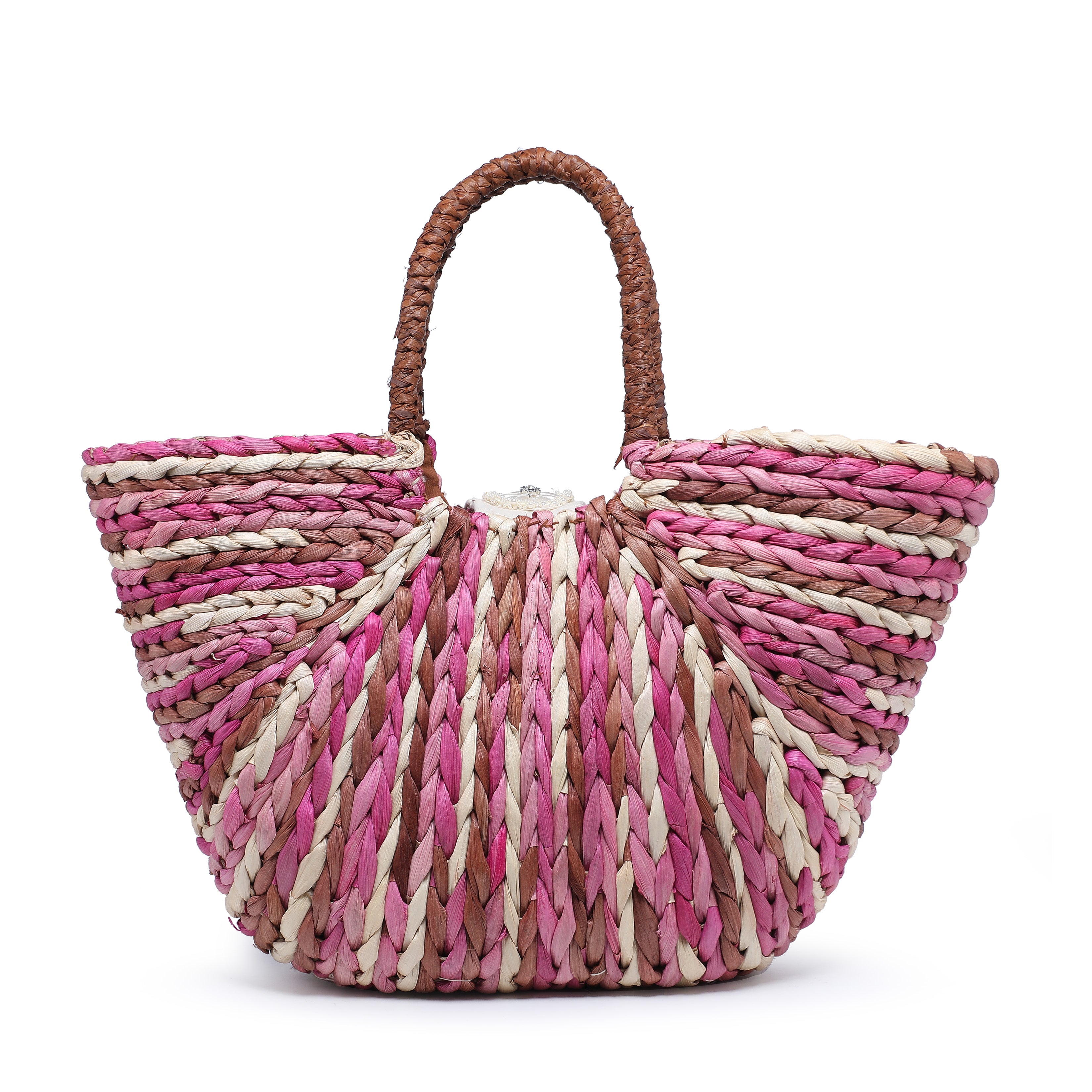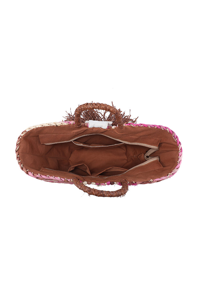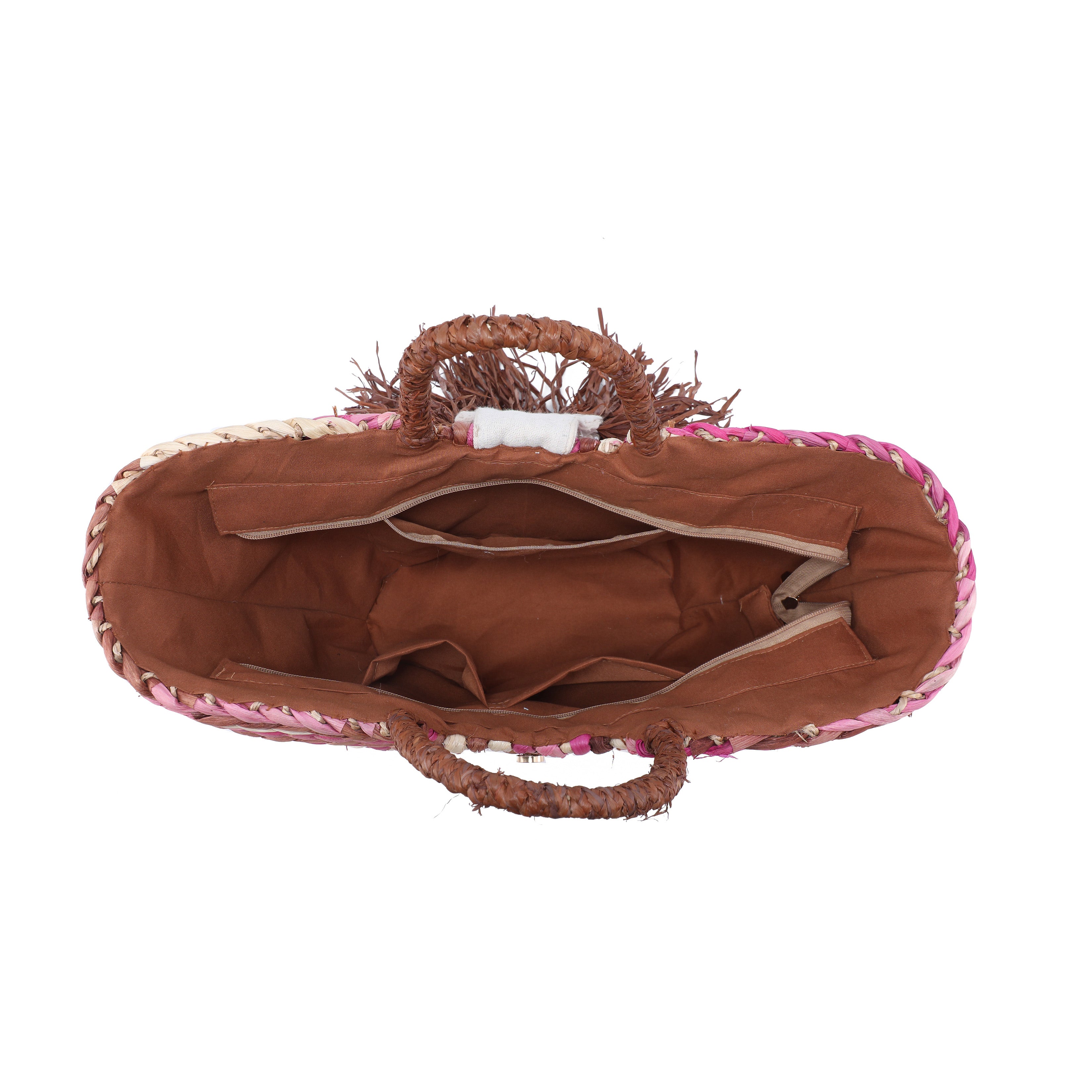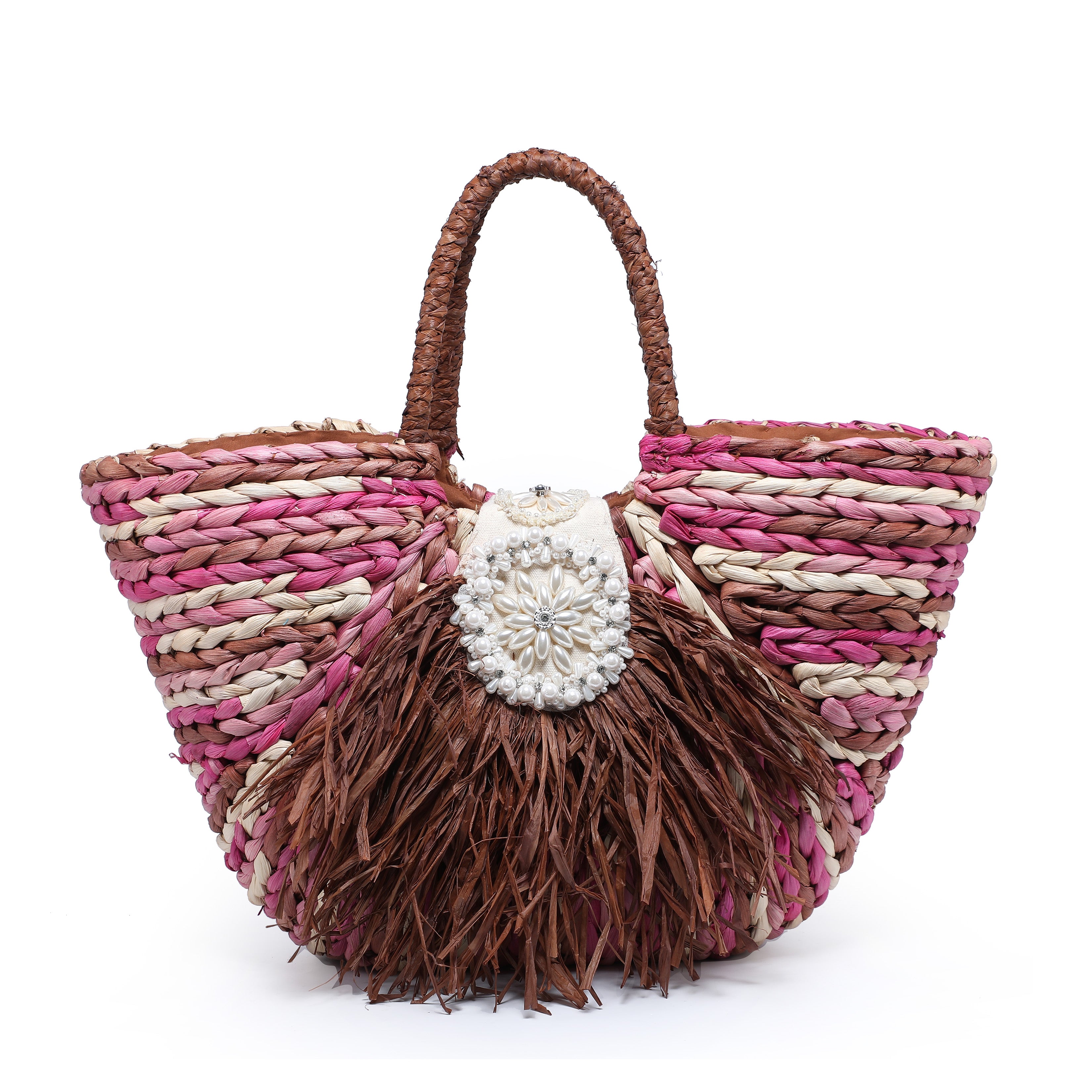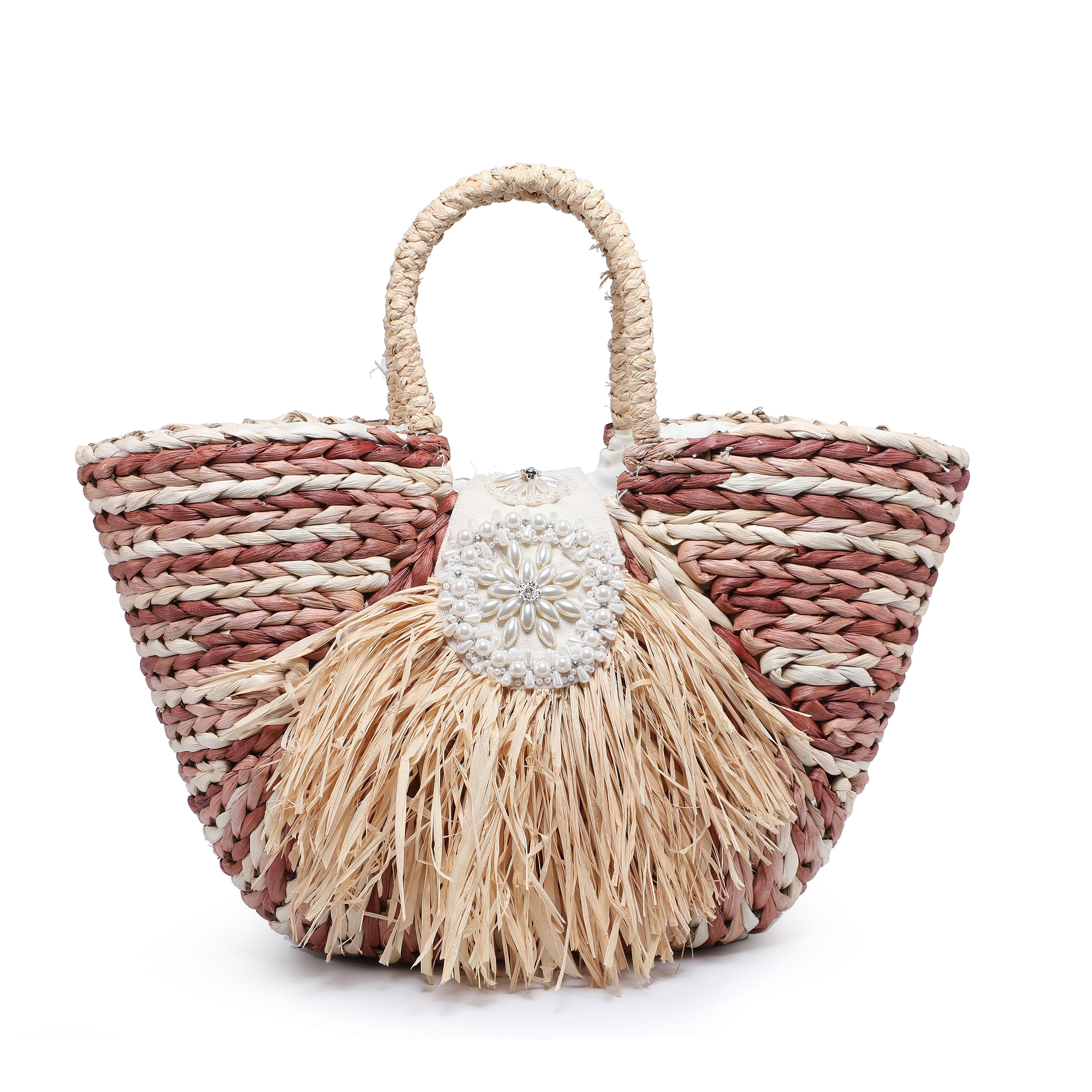 Color-blocked raffia bag with central pearl embellishment and fringe wholesale