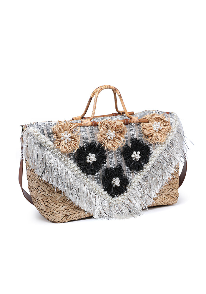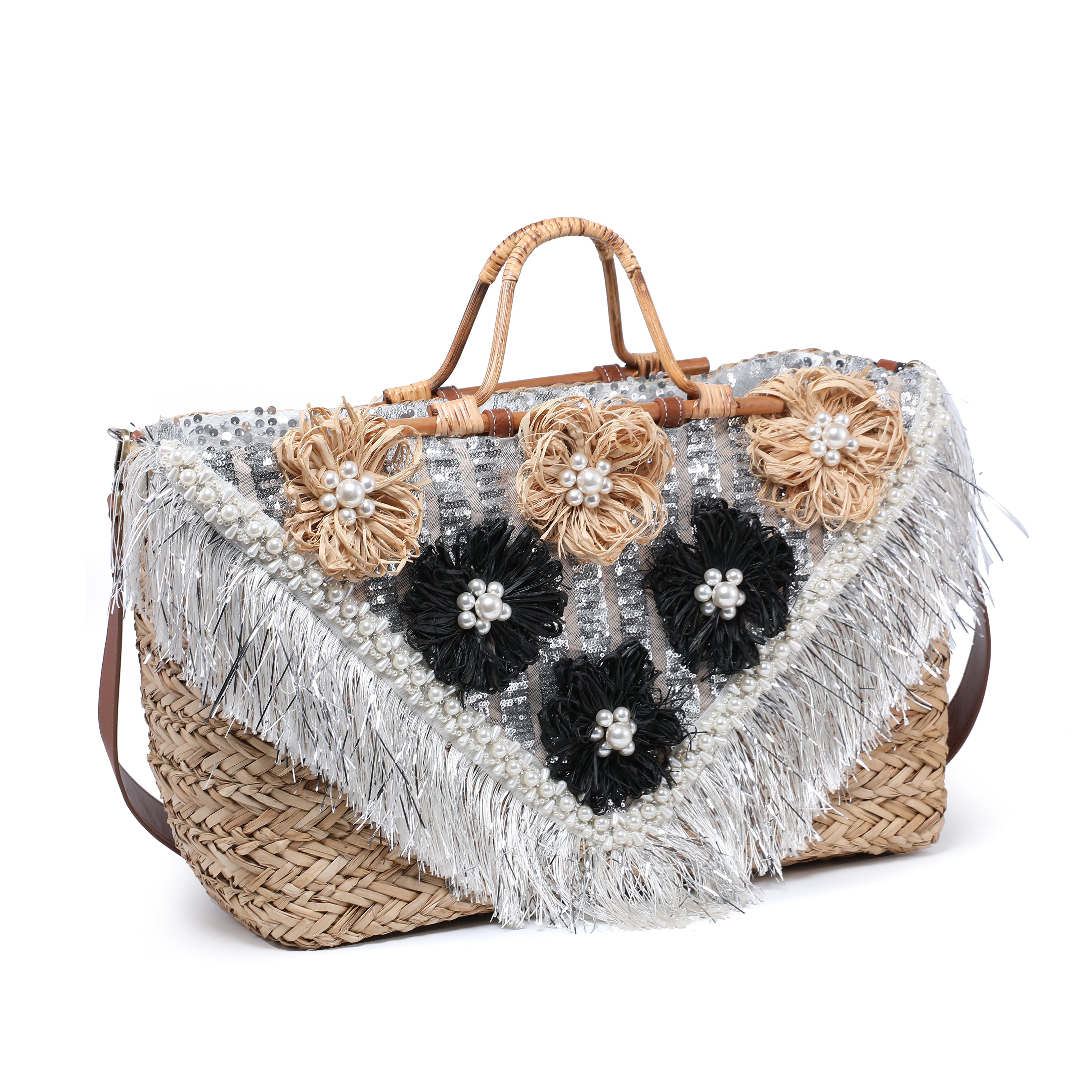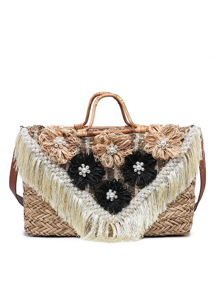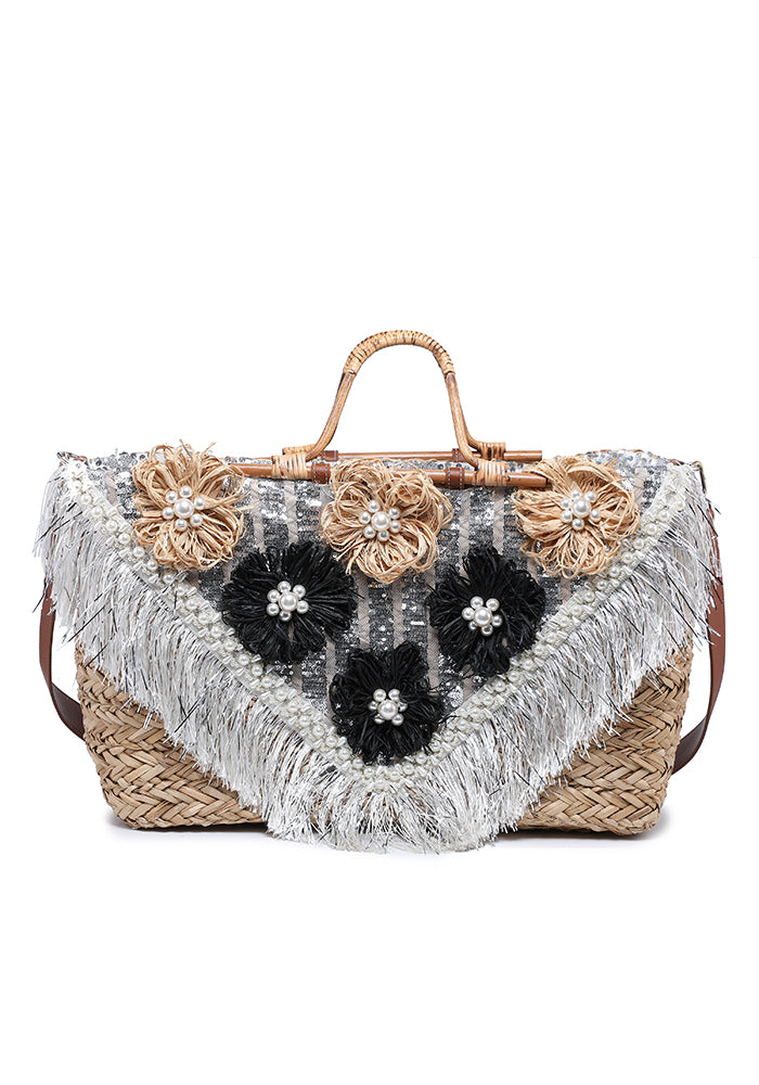 Oversized raffia bag with fringe and floral pearl details wholesale