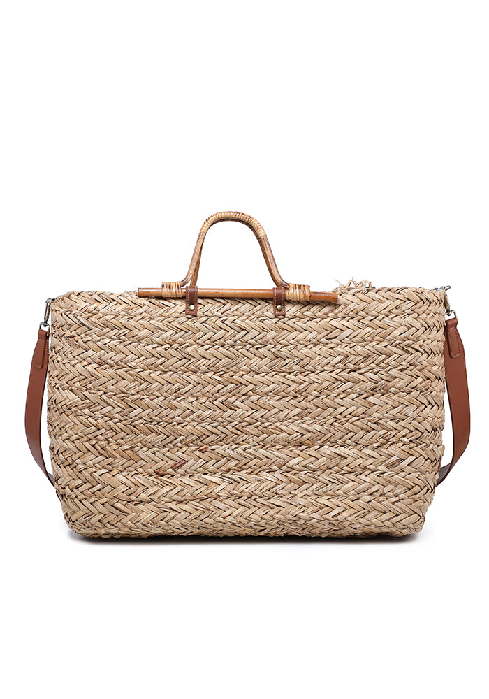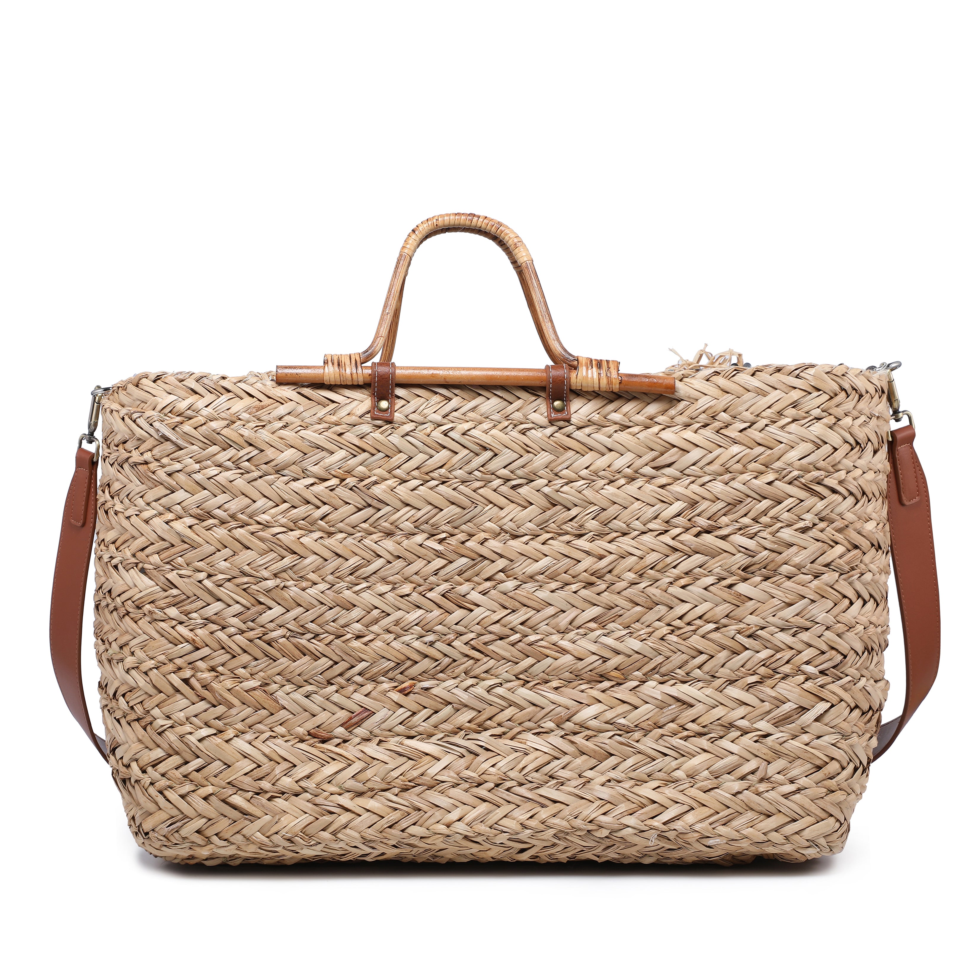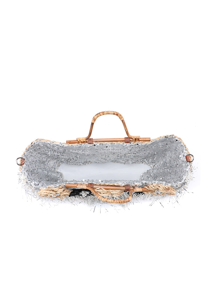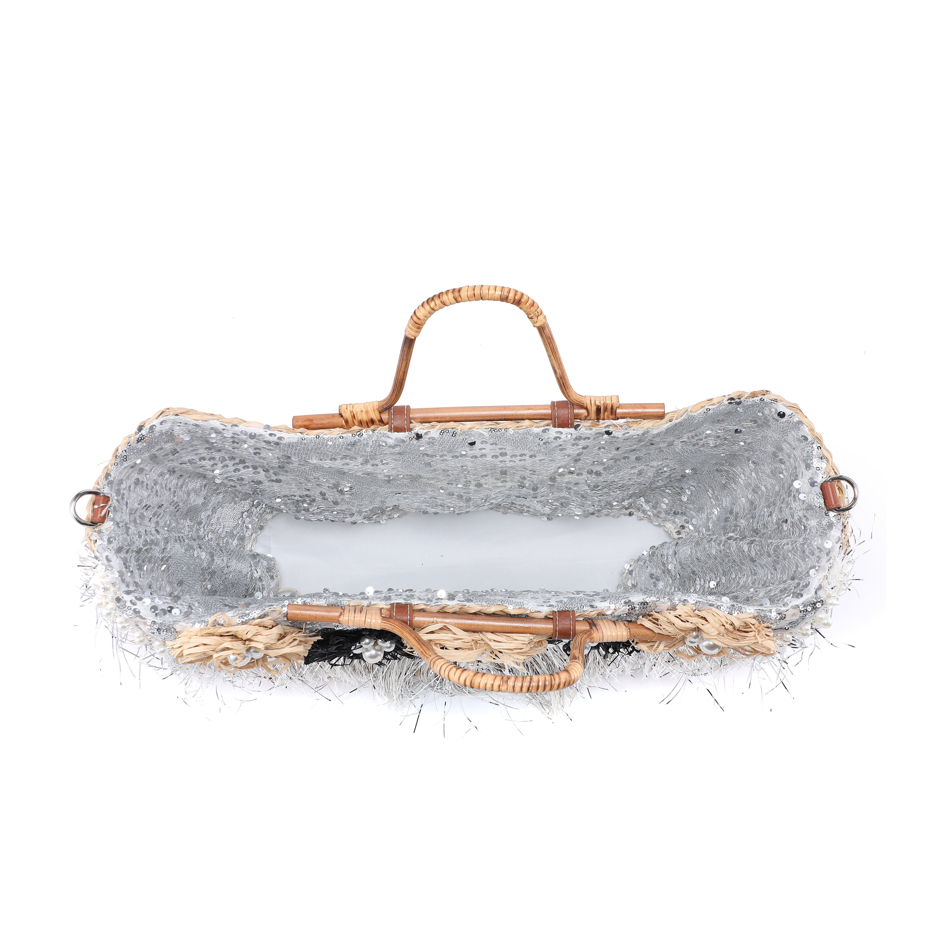 Oversized raffia bag with fringe and floral pearl details wholesale