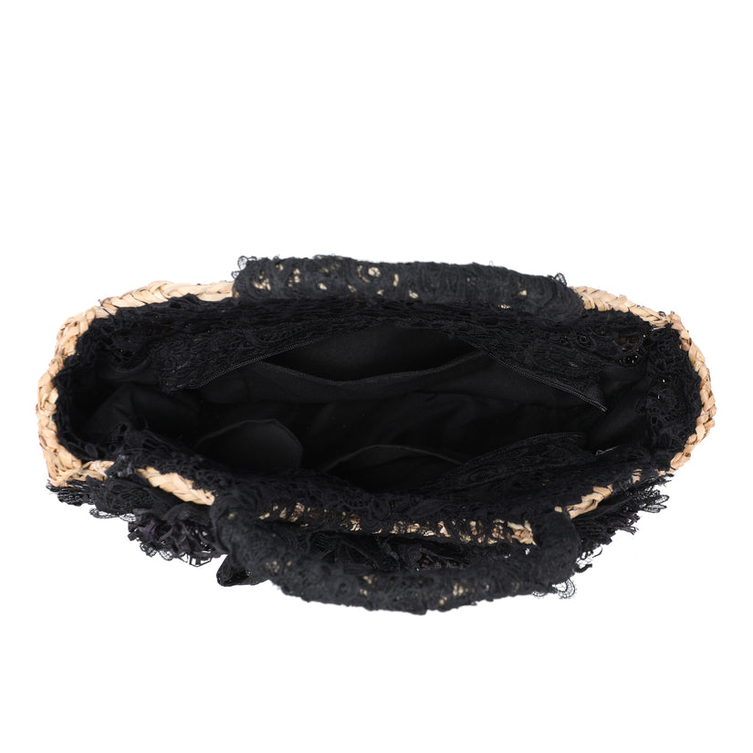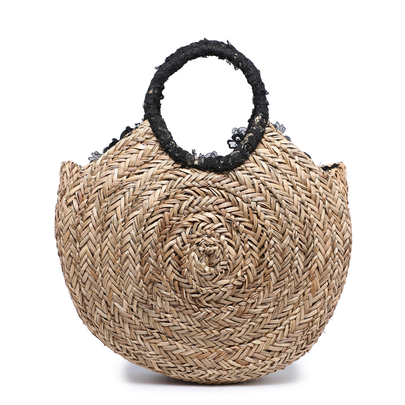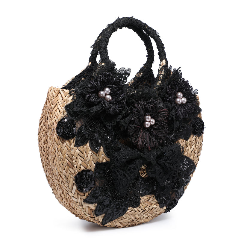 Woven mini basket with lace appliqué and raffia flower accents wholesale