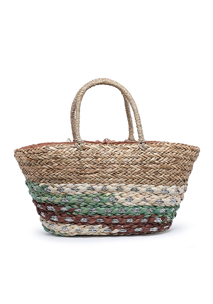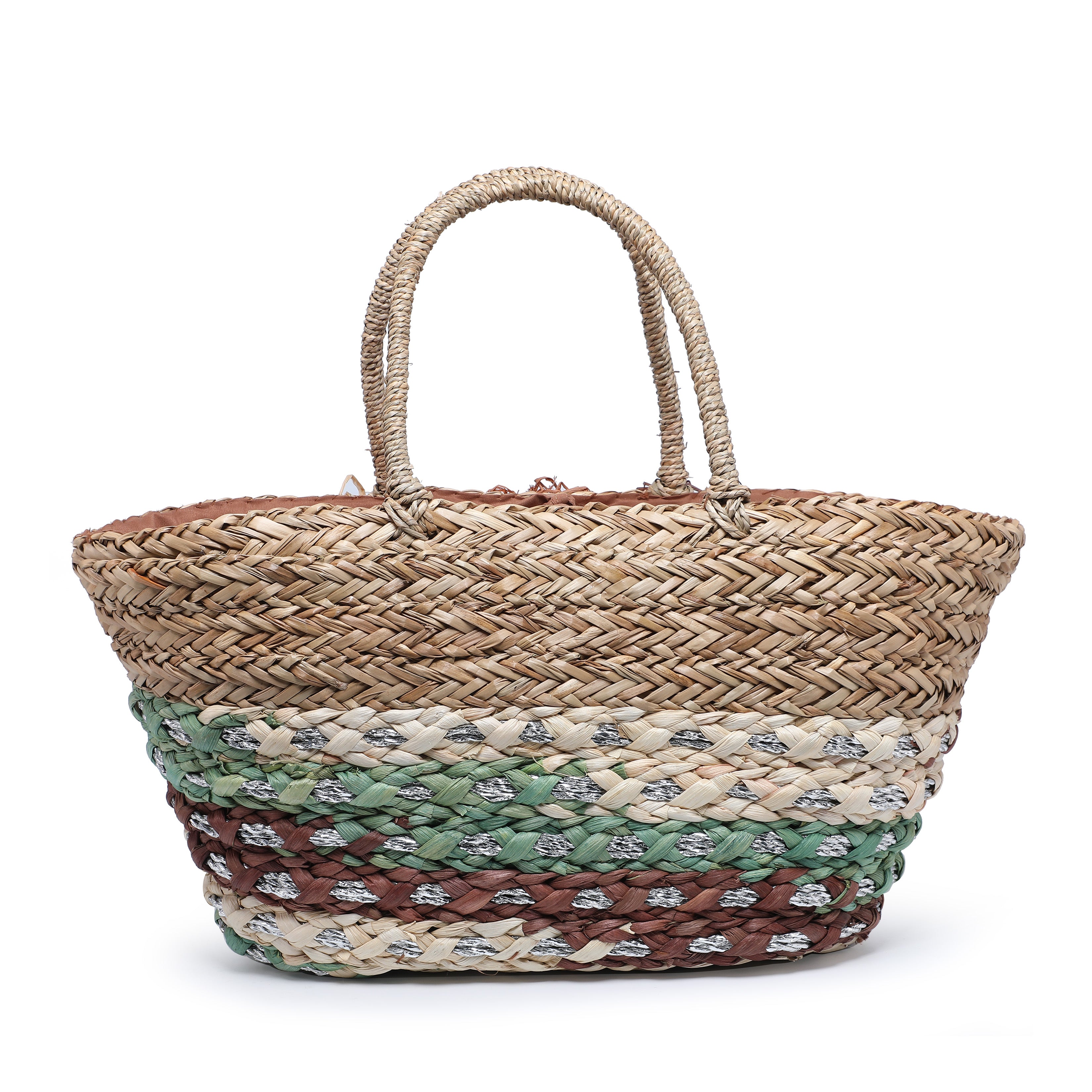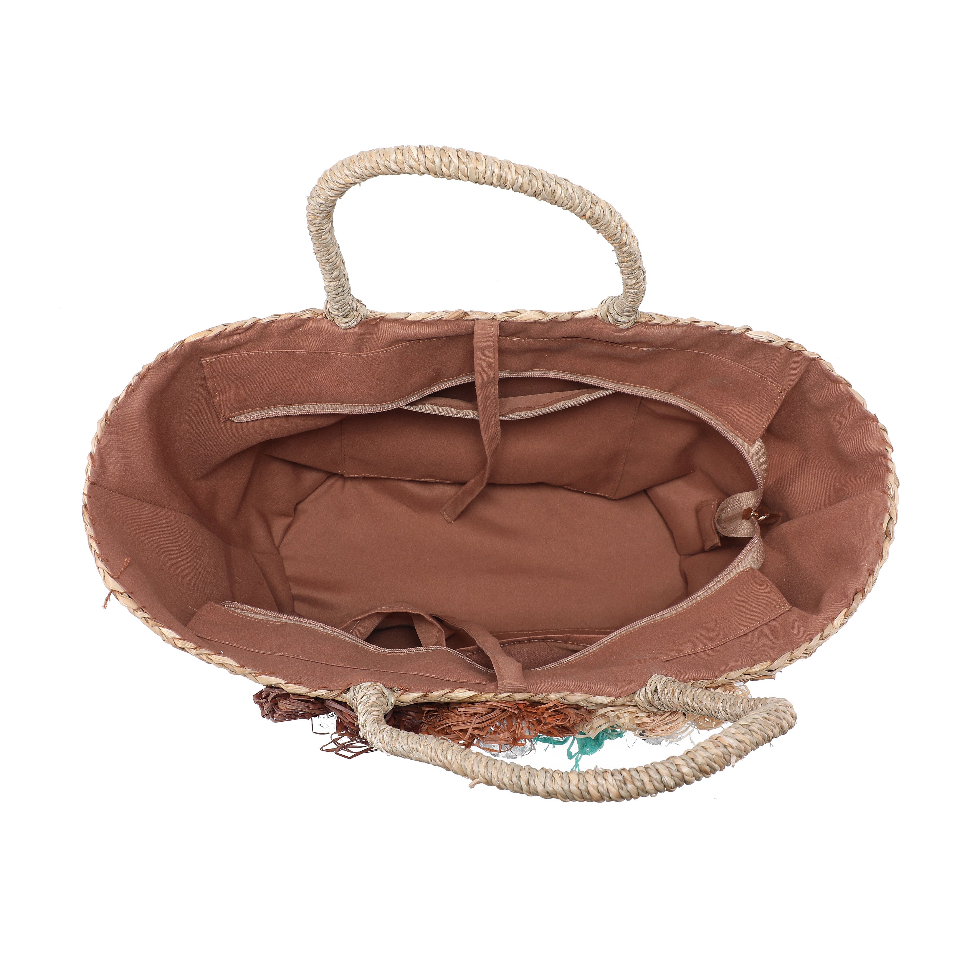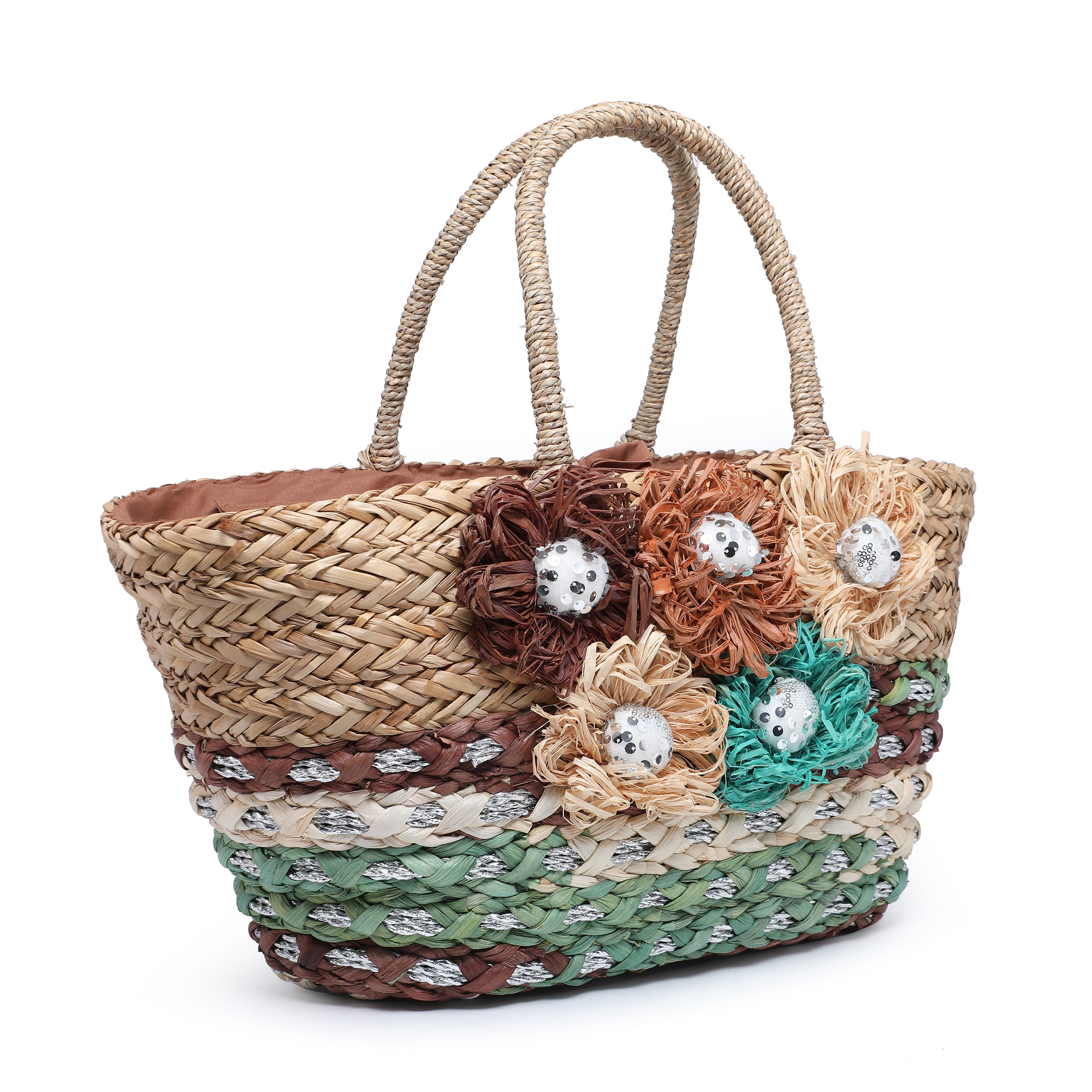 Woven raffia tote bag with layered floral appliqués and sequin center wholesale