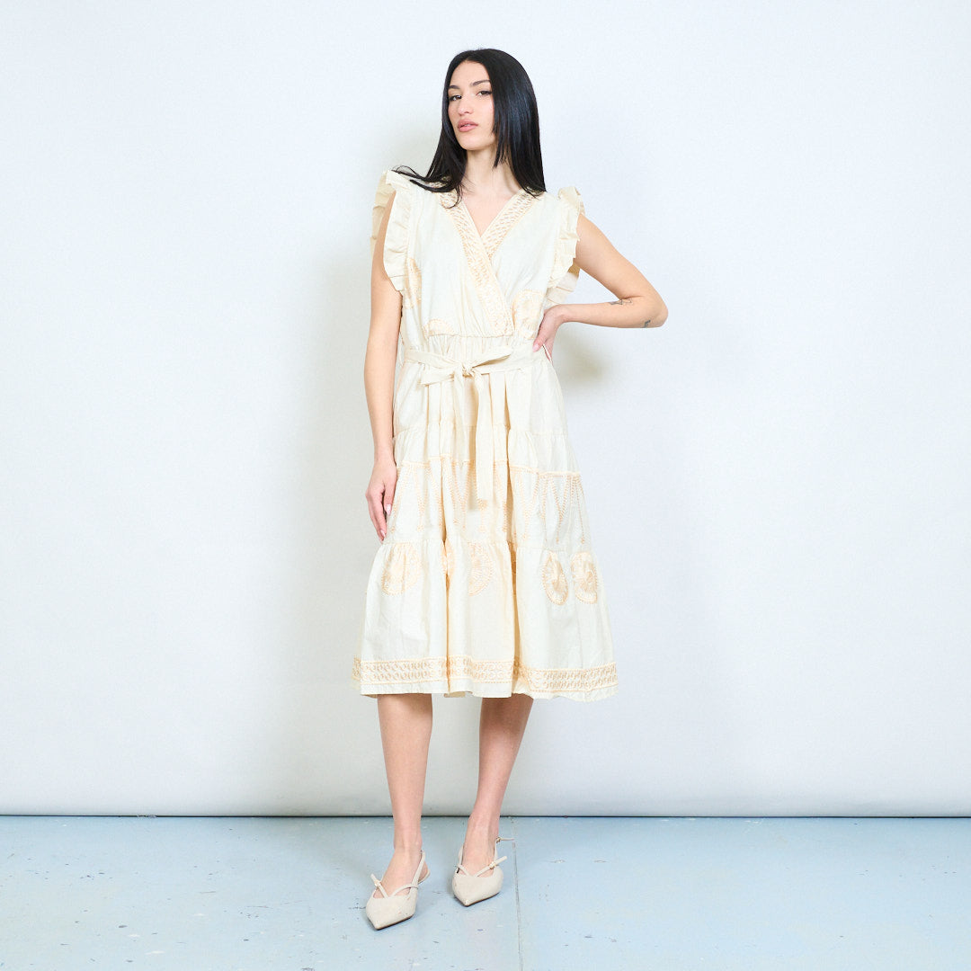 Embroidered cotton wrap dress with ruffle sleeves and waist tie wholesale