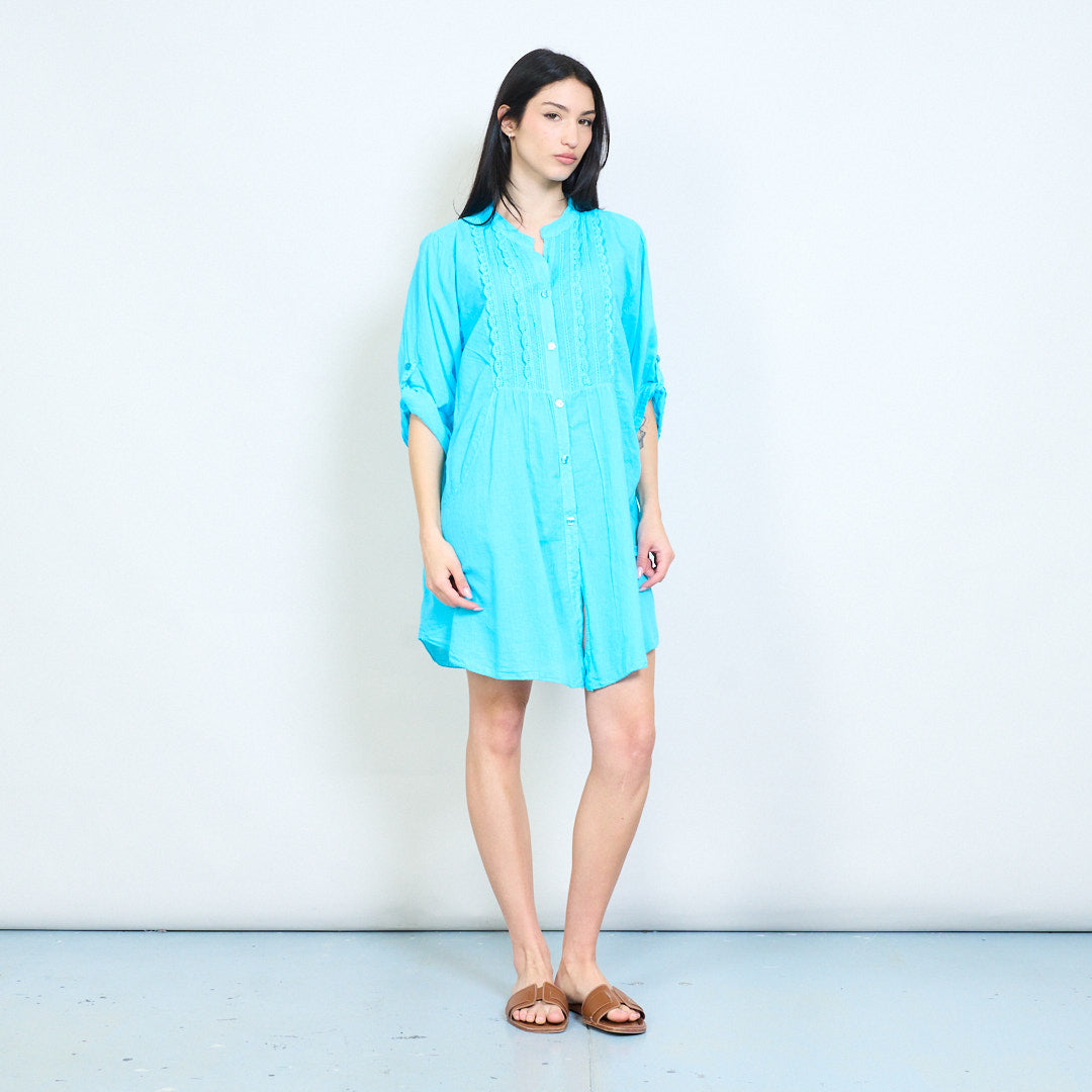 Embroidery detail notch neckline relaxed button front midi dress wholesale