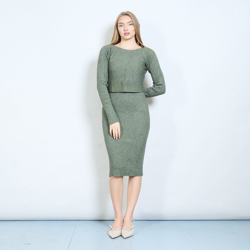 - Features a coordinated two-piece design combining a cropped knit top with a fitted long dress