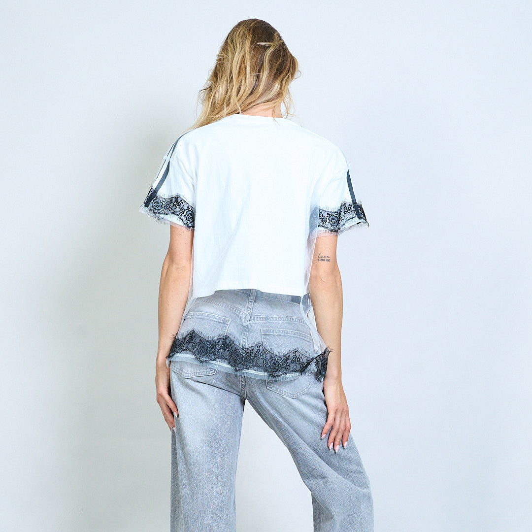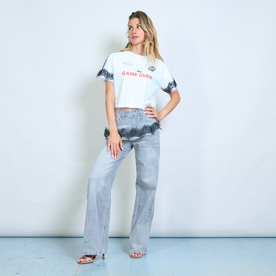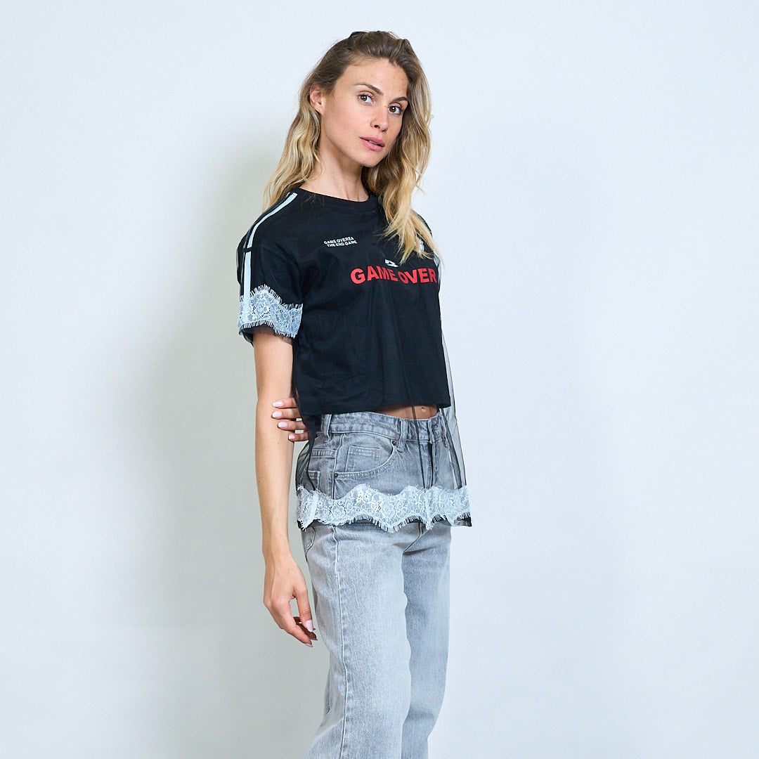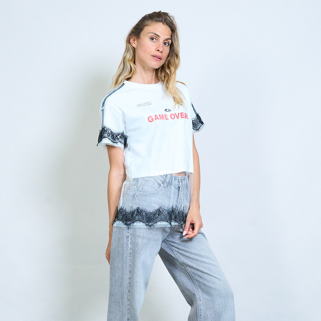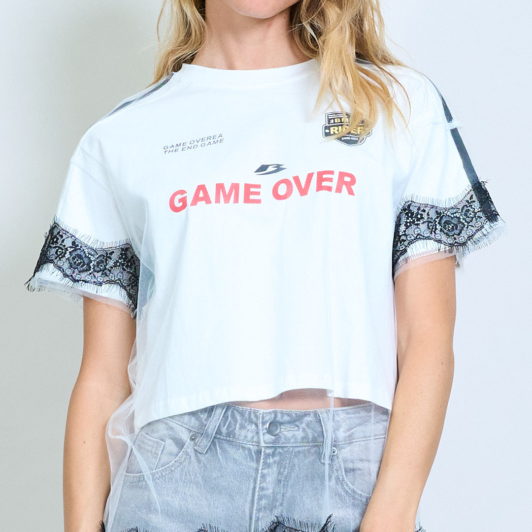"Game Over" sporty patch t-shirt with mesh and lace panel wholesale