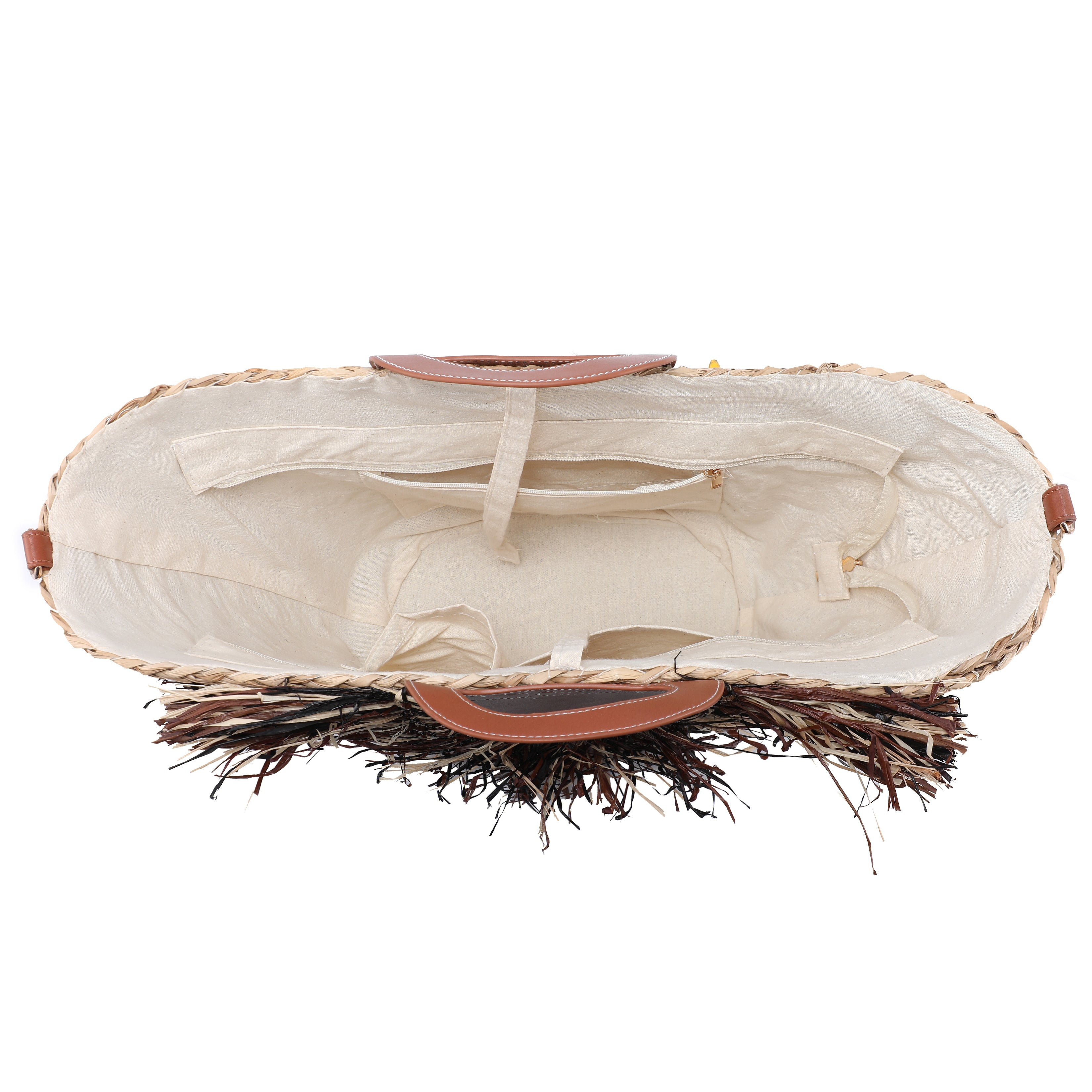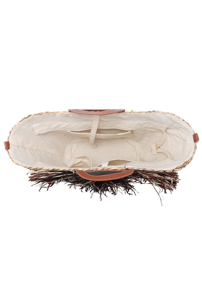 - Decorated with layered raffia fringe on both sides