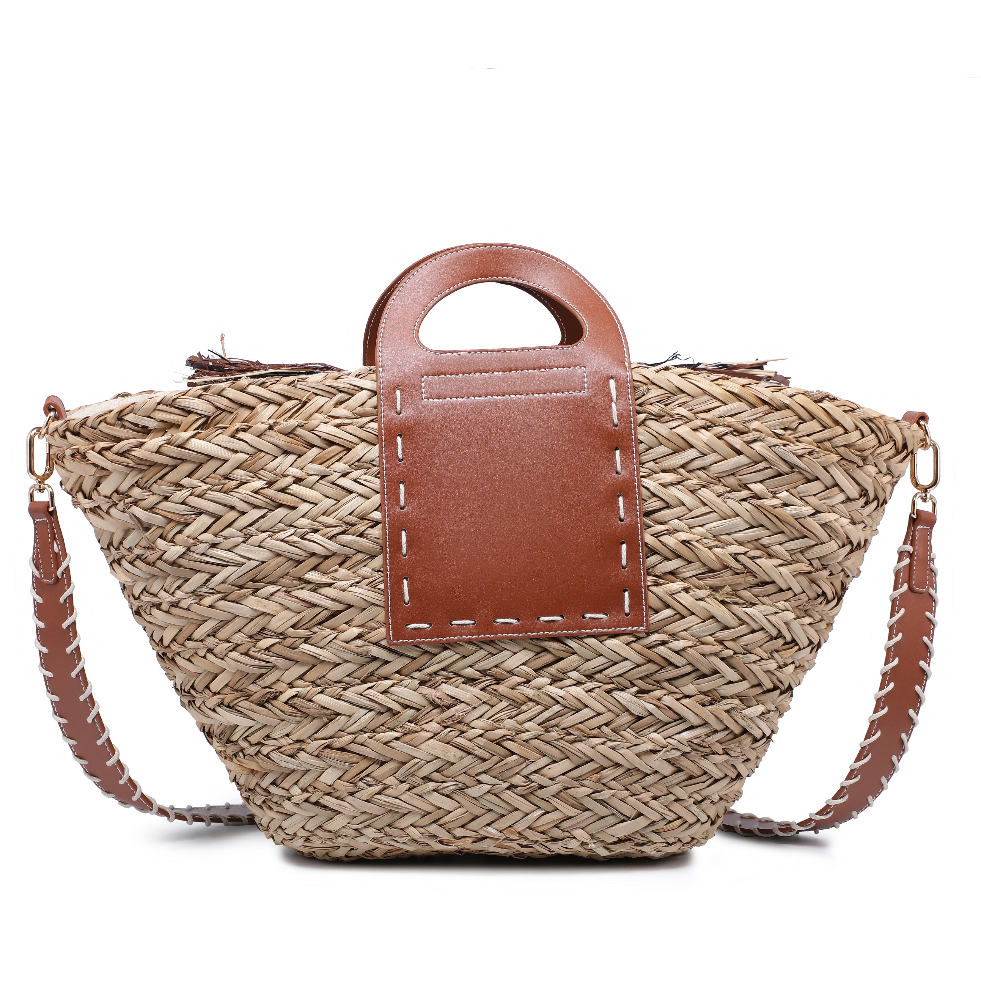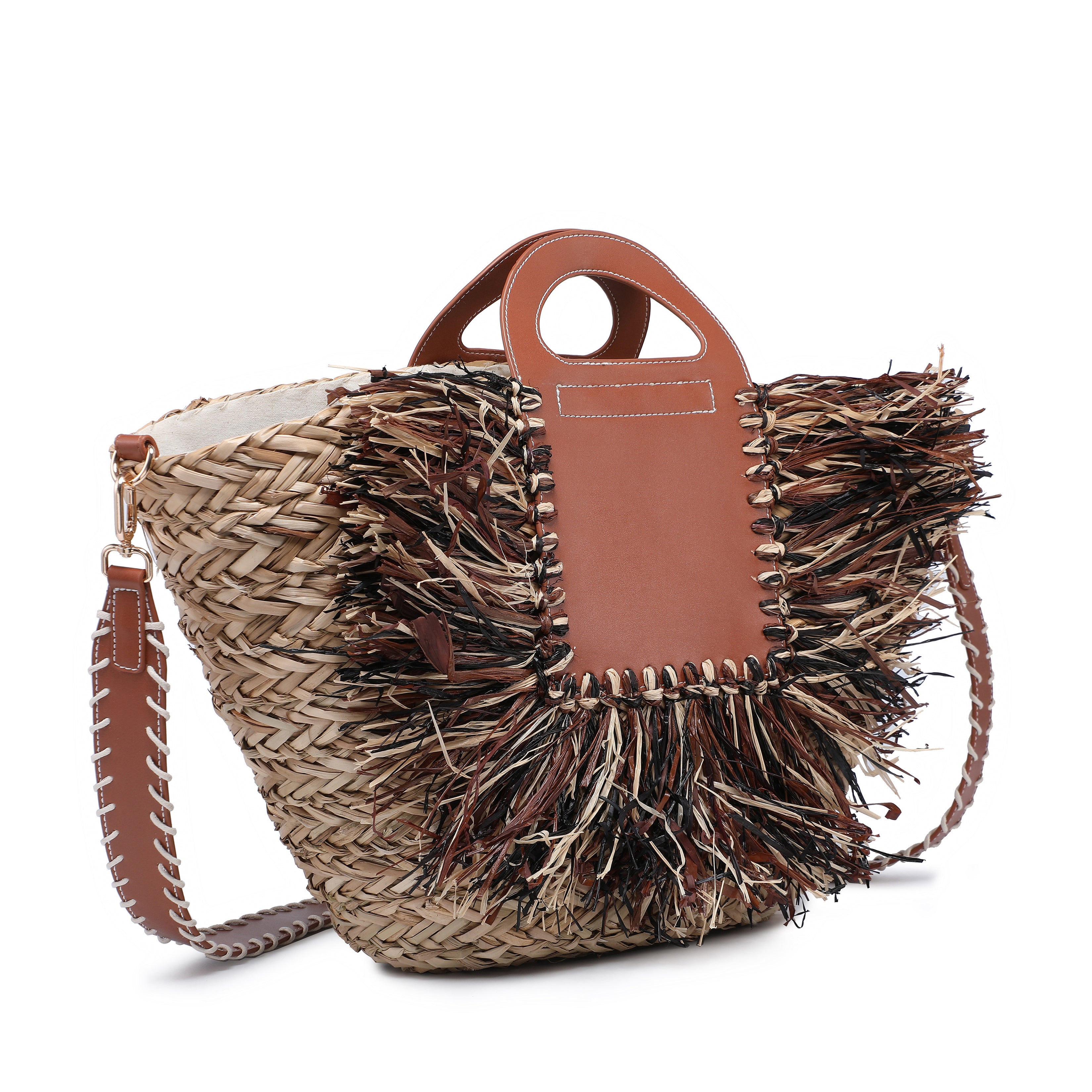 Structured raffia bag with stitched leather panel and raffia fringe wholesale