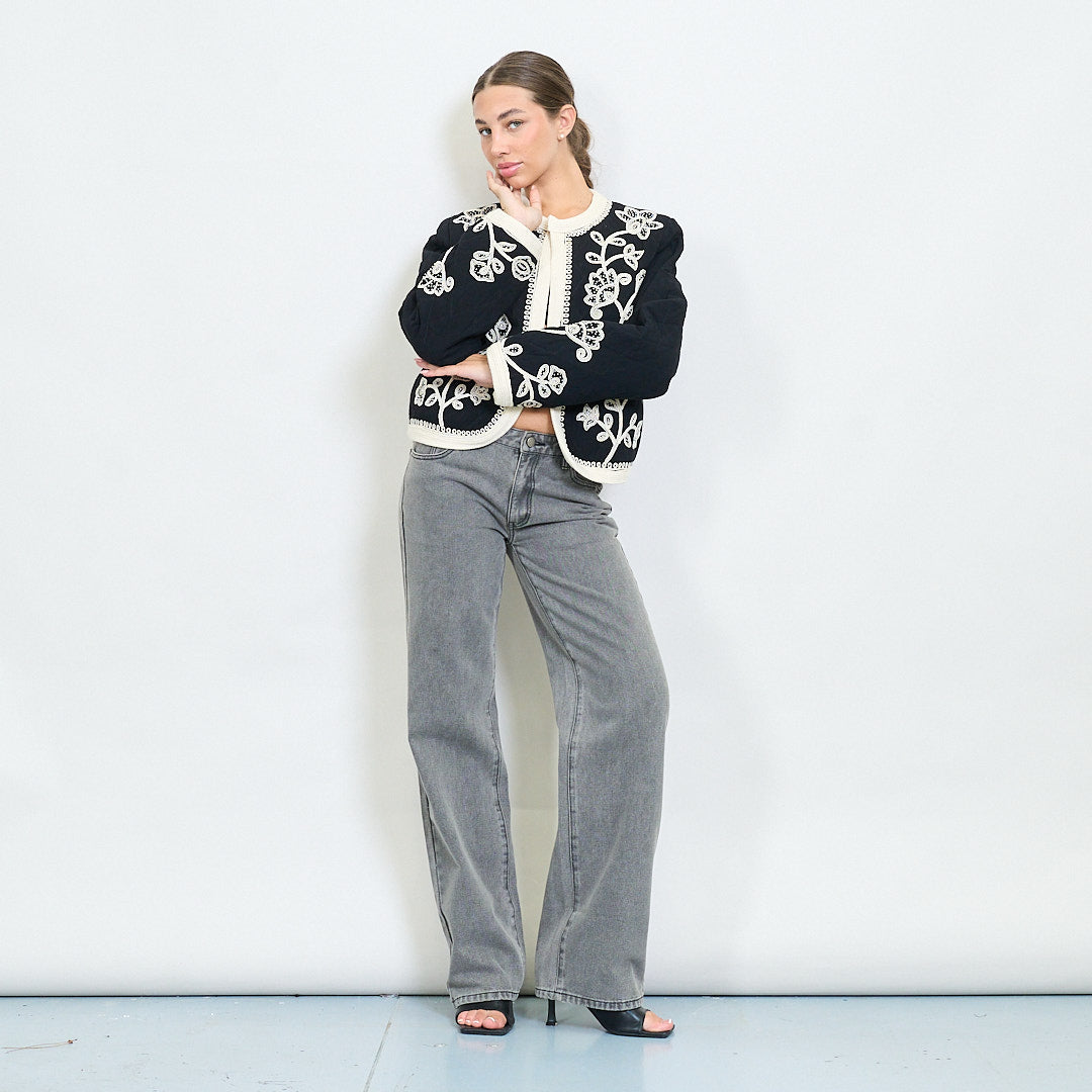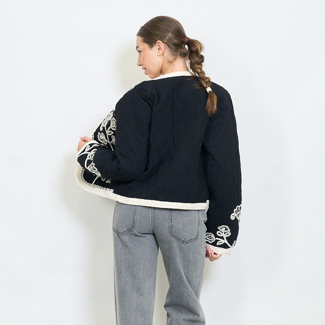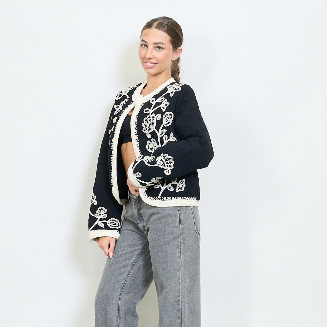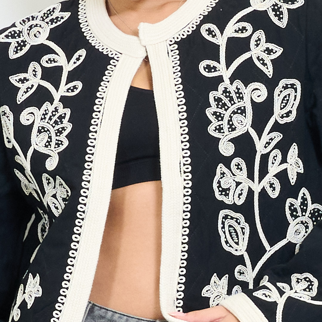Quilted floral embroidered jacket with cream rope trim and open front wholesale