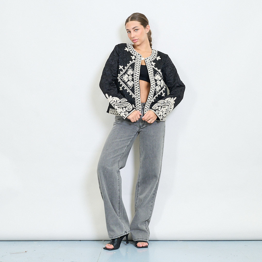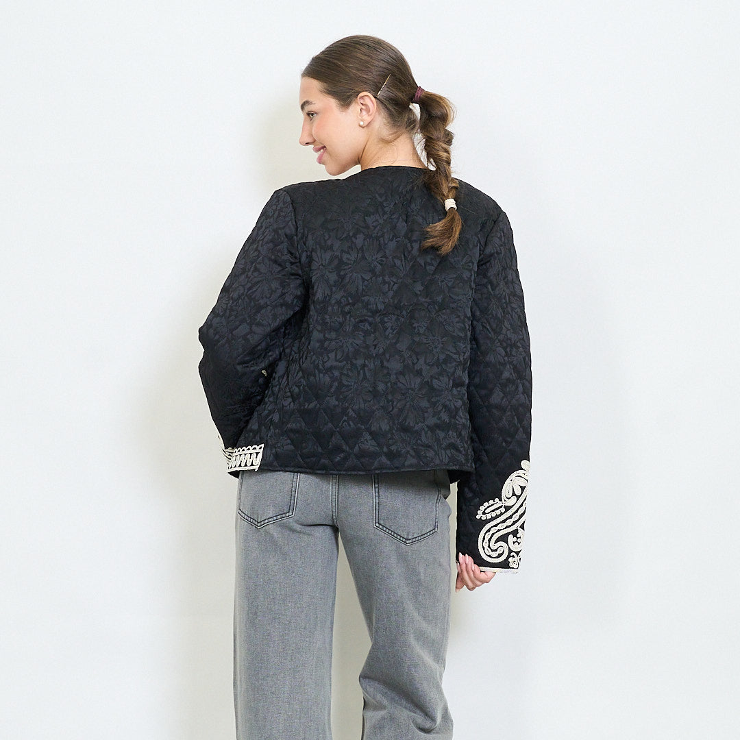 Quilted open-front jacket with baroque floral triangle embroidery and rope trim wholesale
