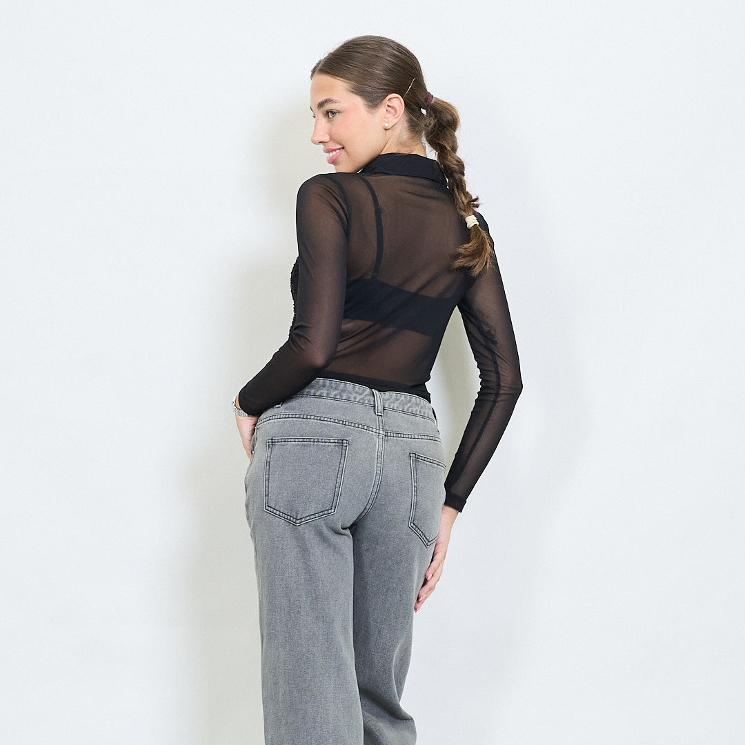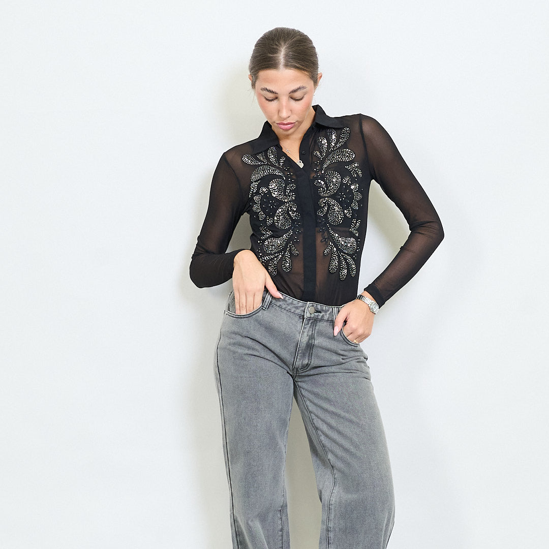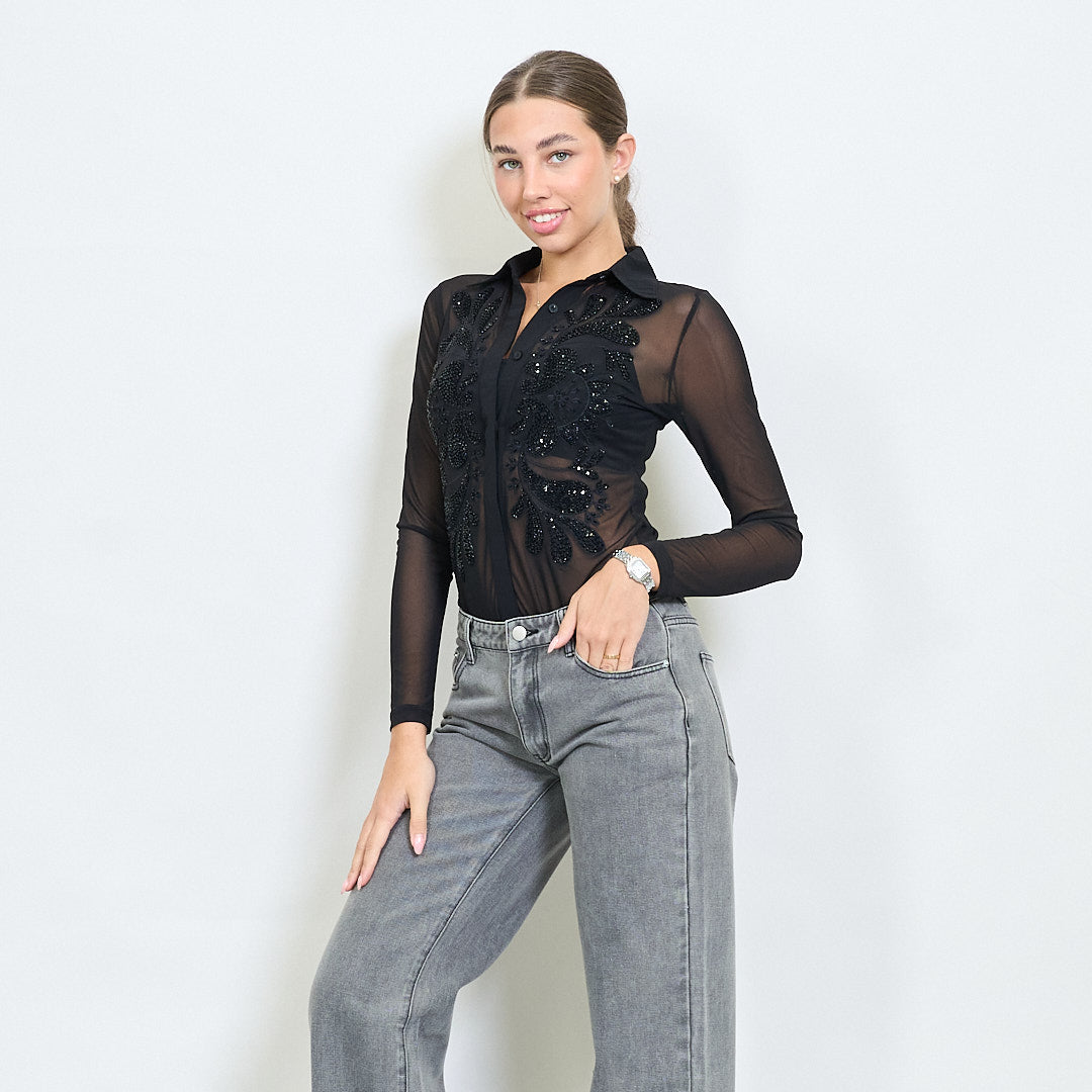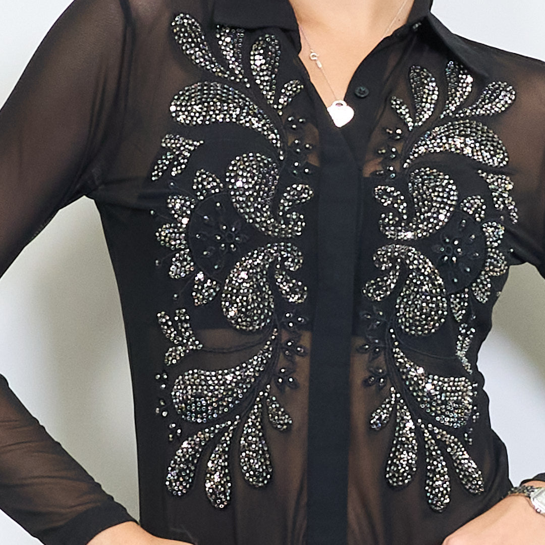 Sheer embroidered mesh bodysuit blouse with sequin baroque design wholesale