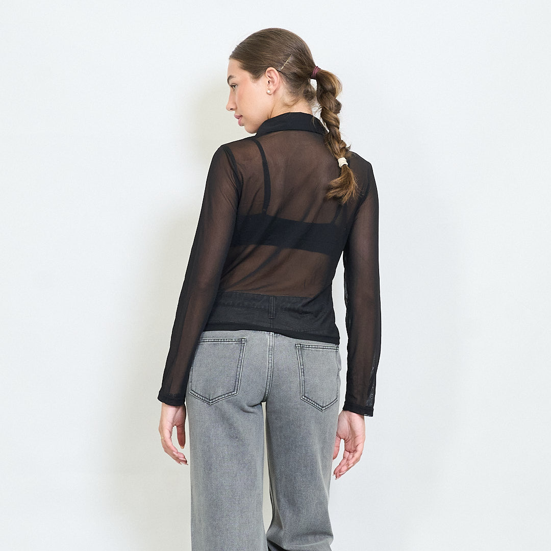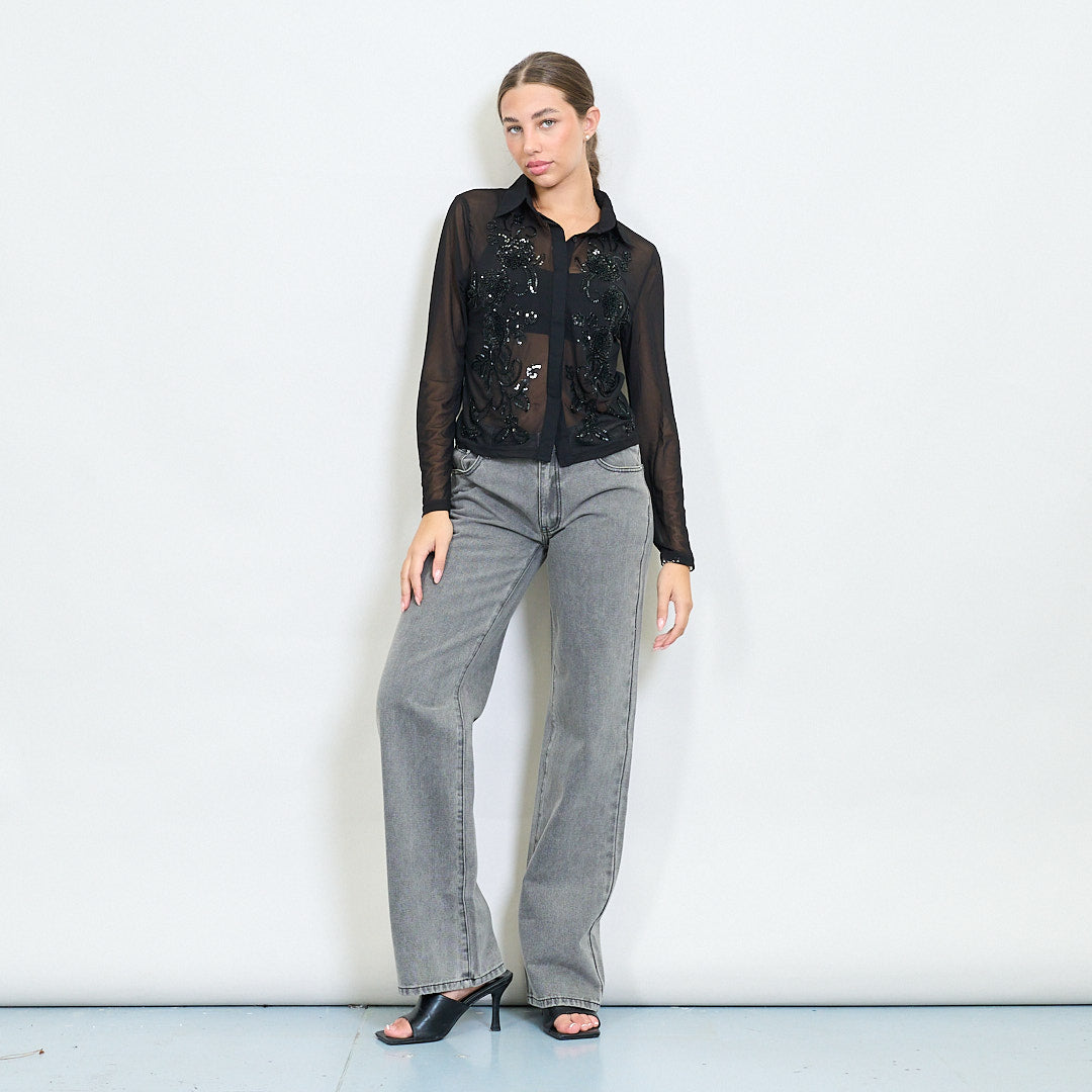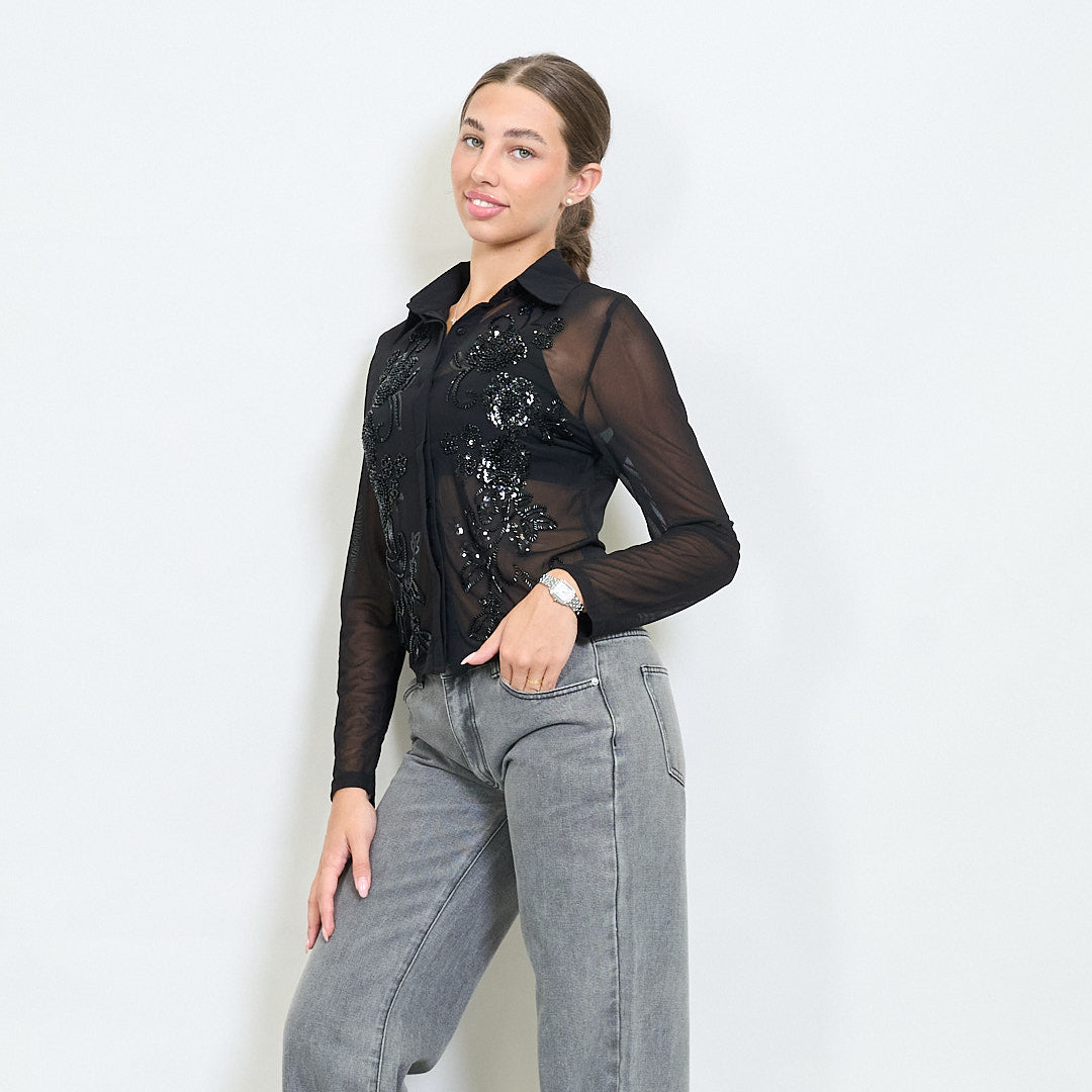 Sheer embroidered mesh shirt with floral beadwork wholesale