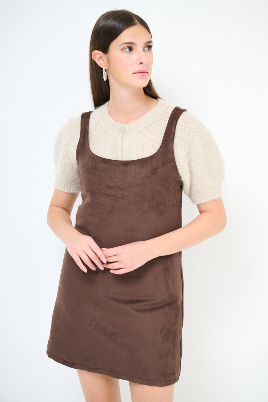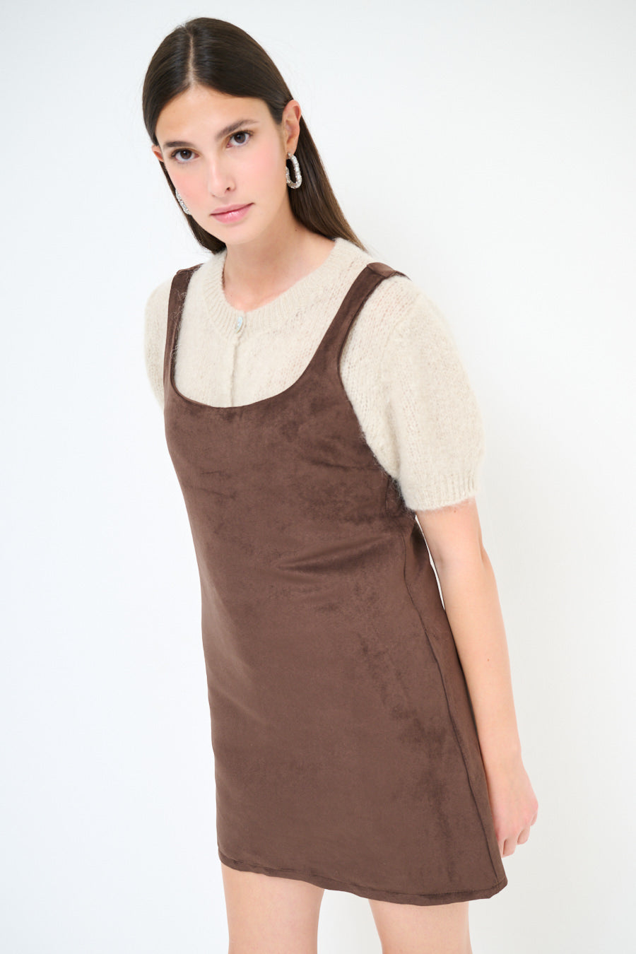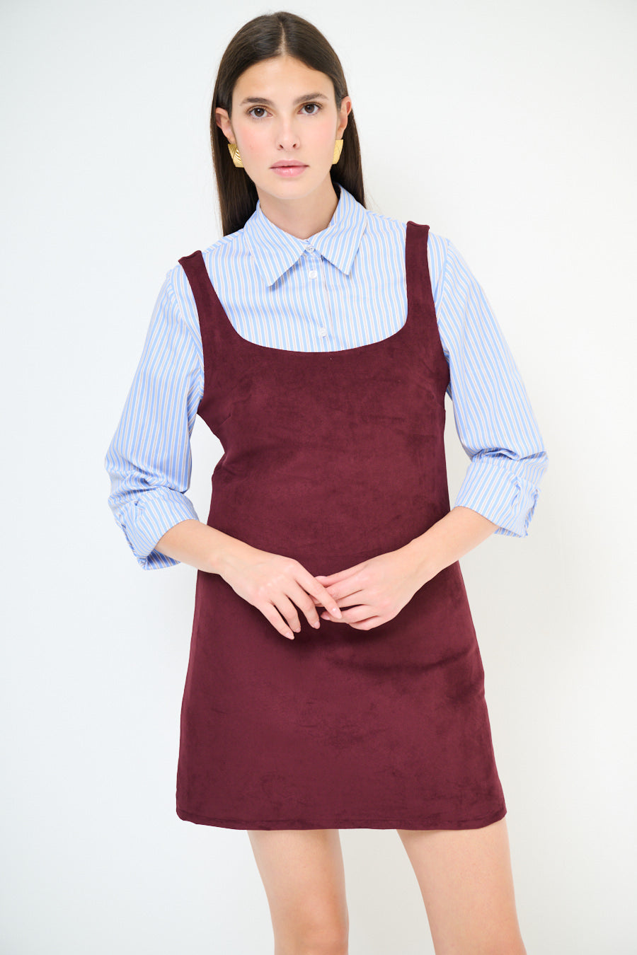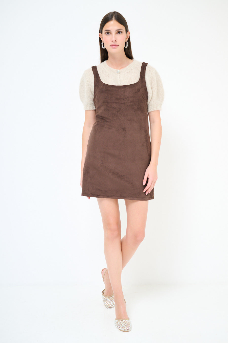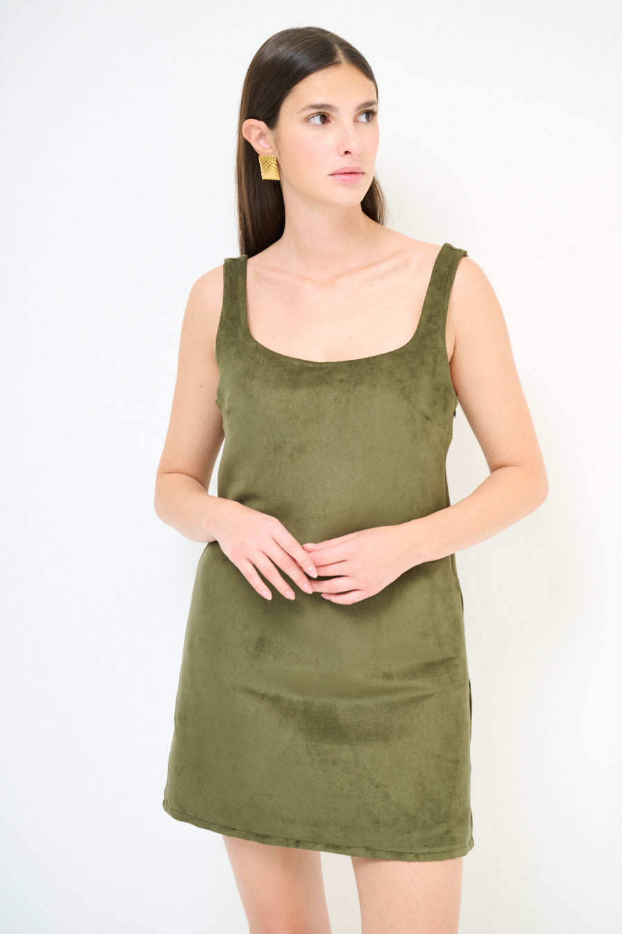 - Straight shift silhouette with a mini length finish