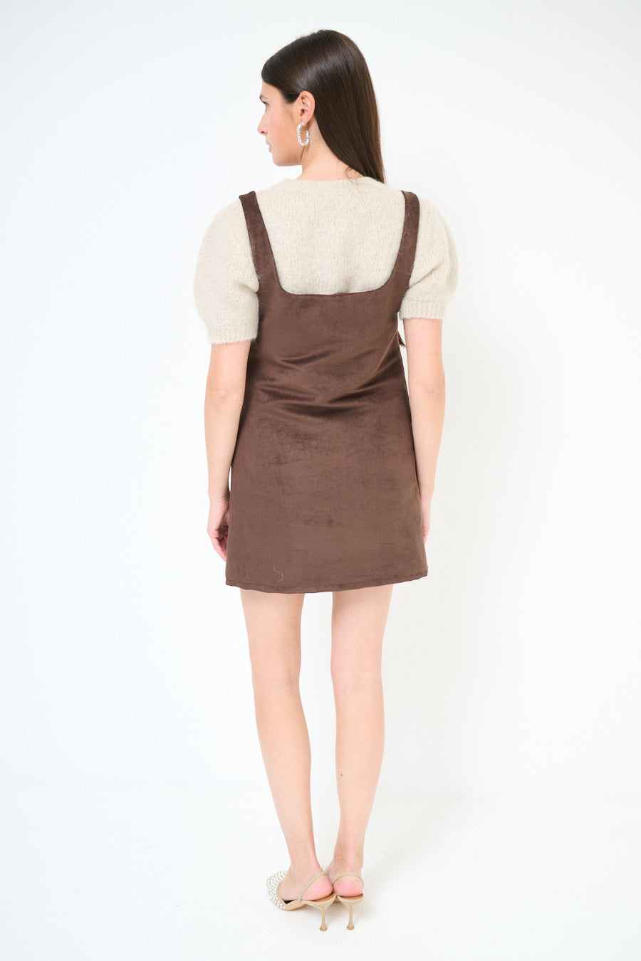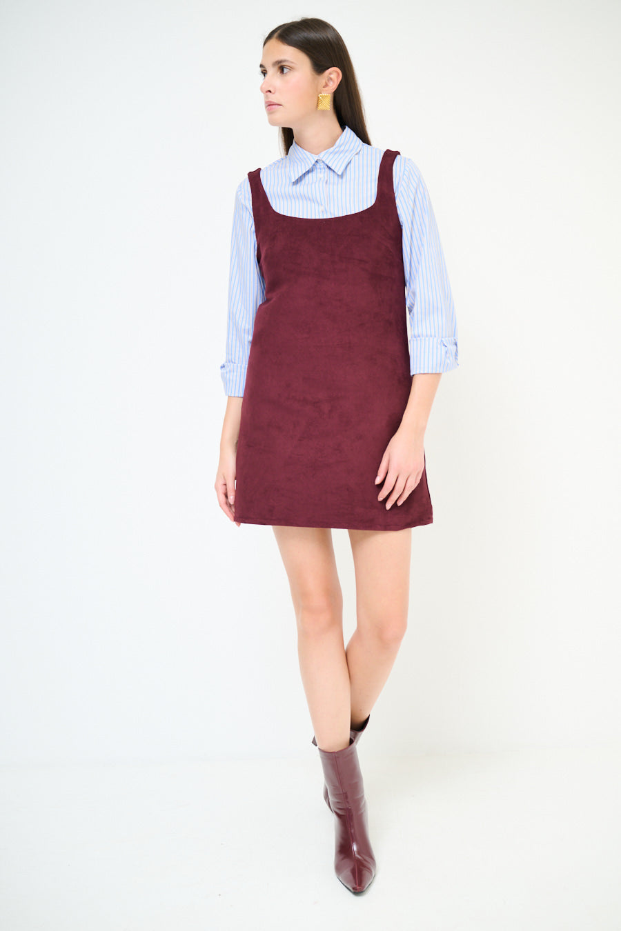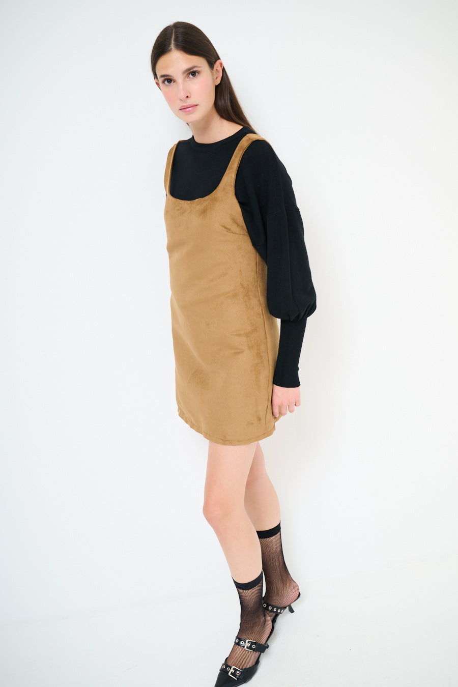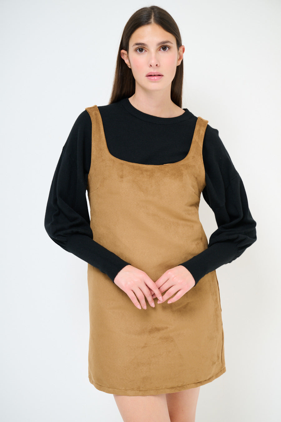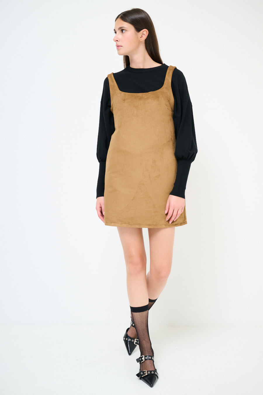 - Straight shift silhouette with a mini length finish