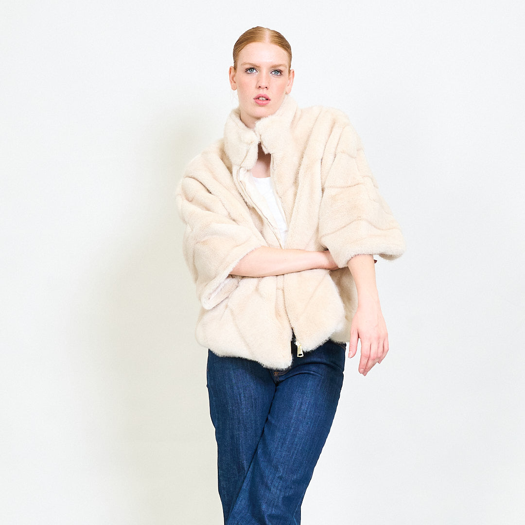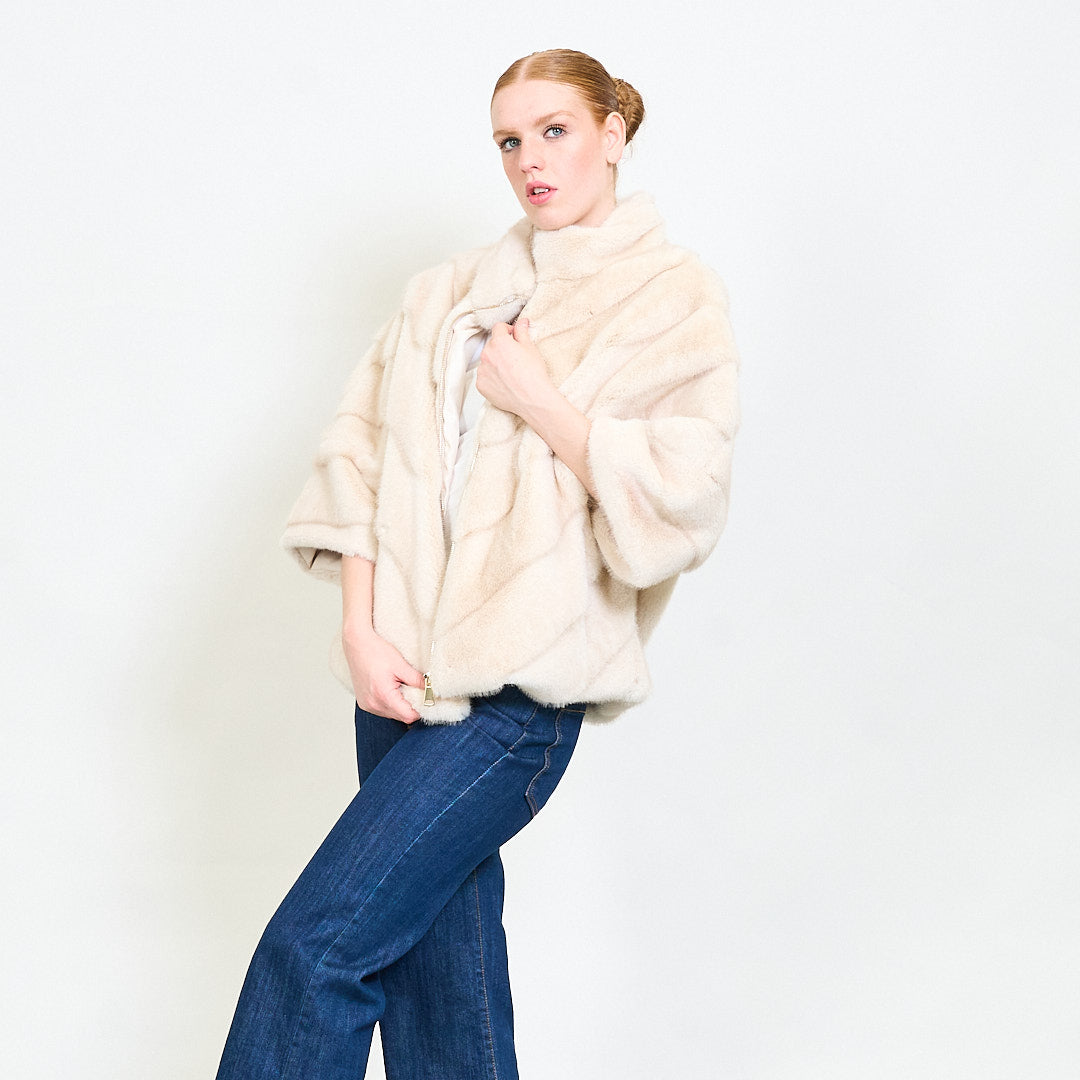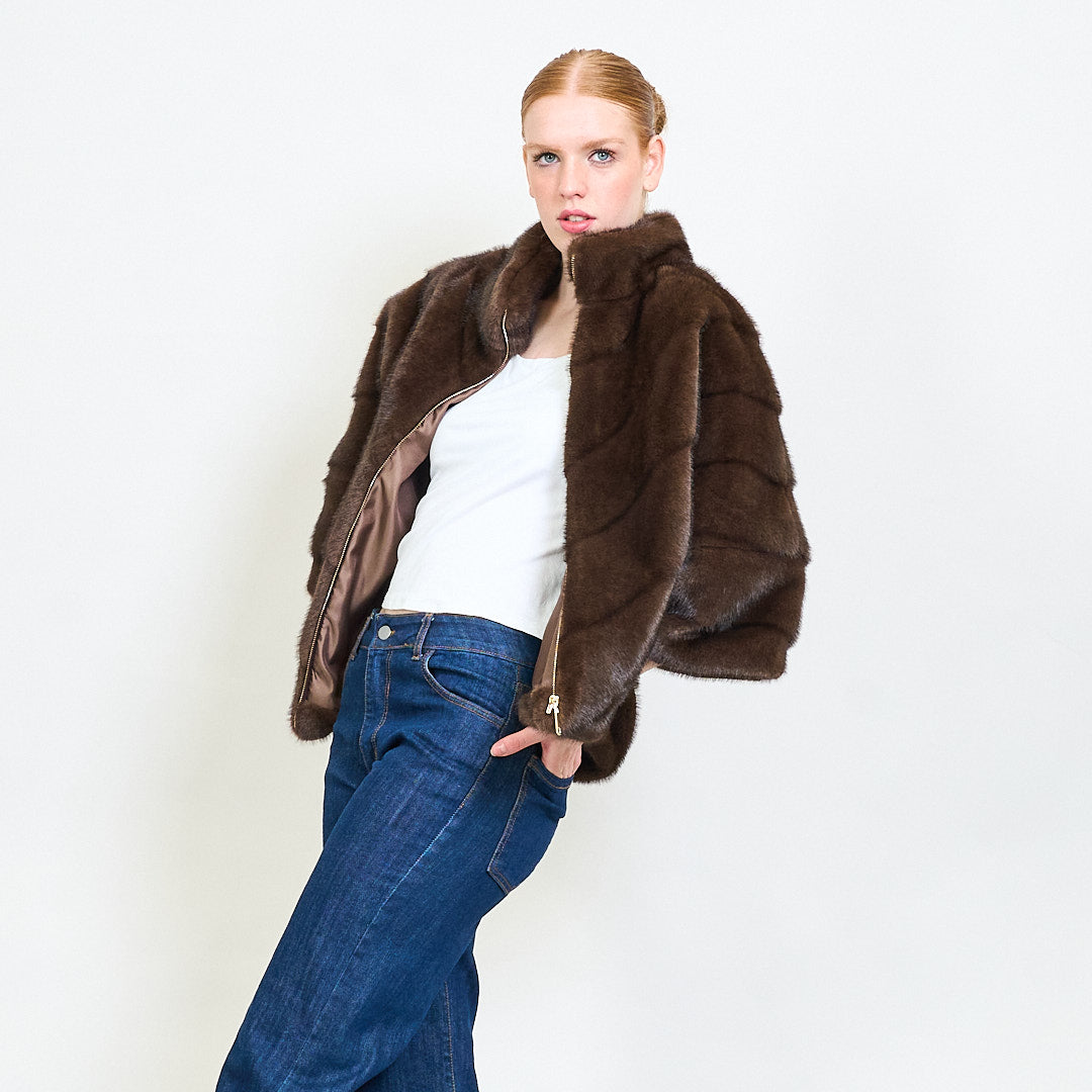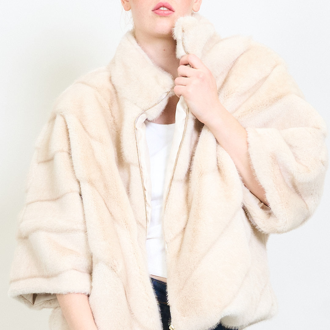 - Elegant faux fur with chevron-style horizontal stripe texture