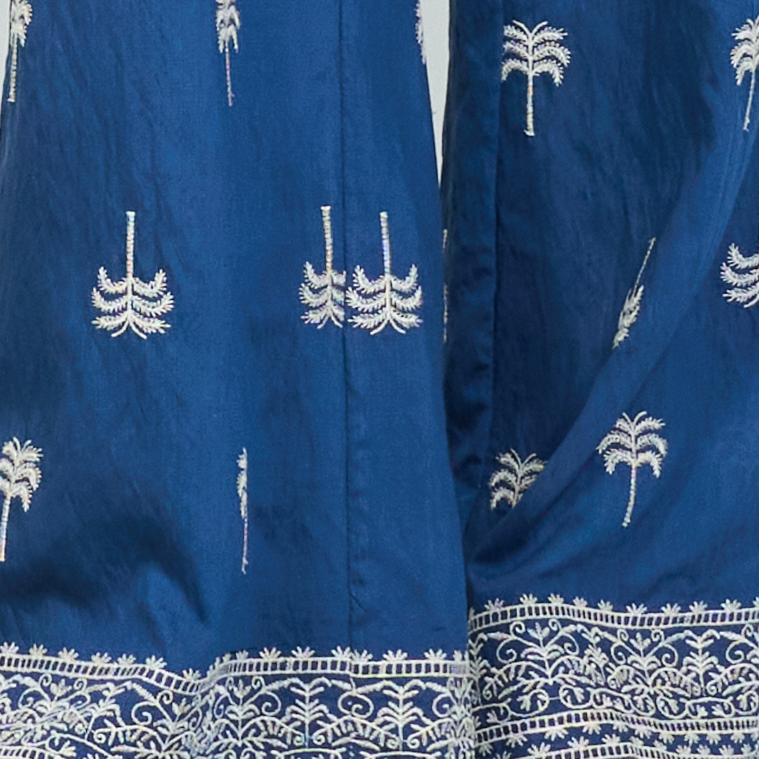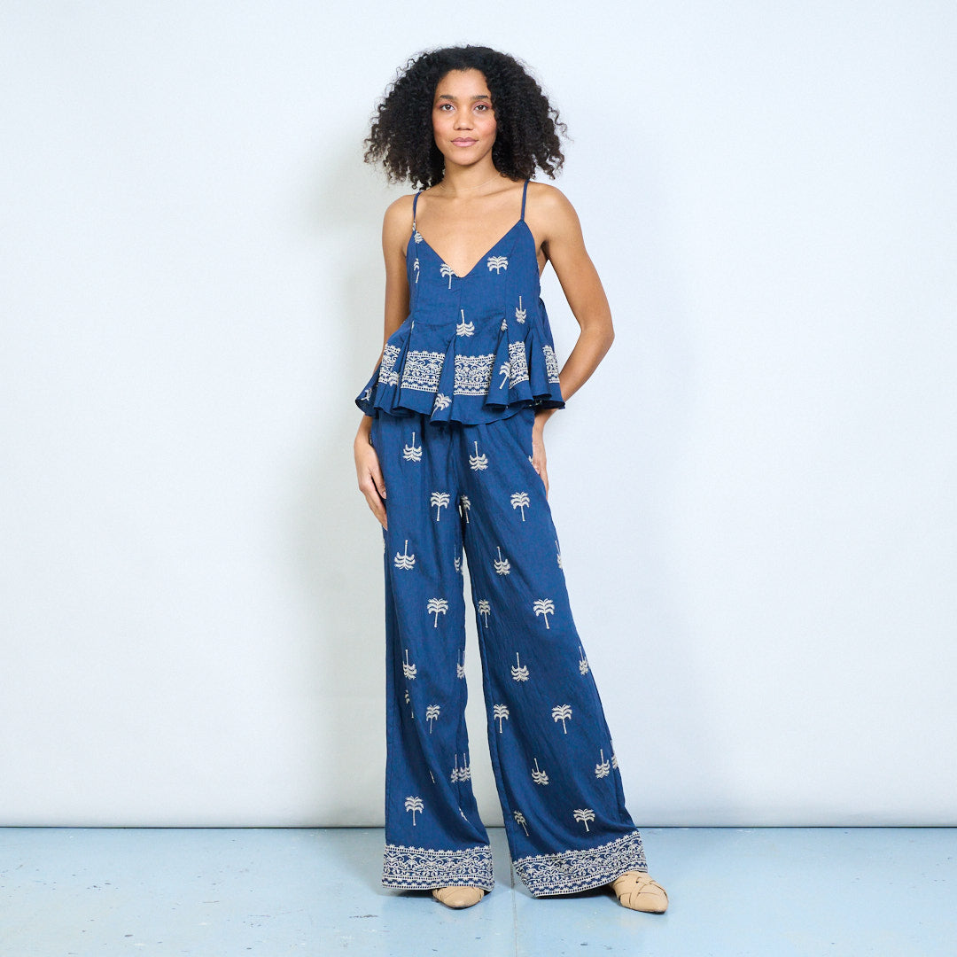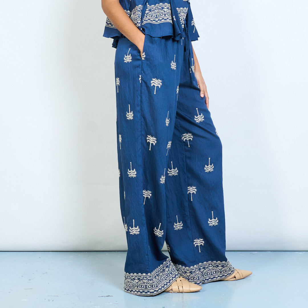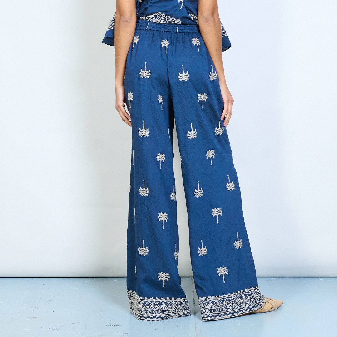 - Wide leg trousers featuring embroidered palm tree motifs for a relaxed tropical inspired look